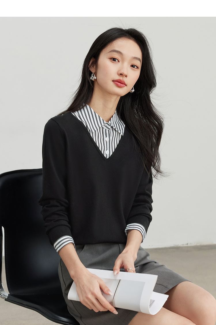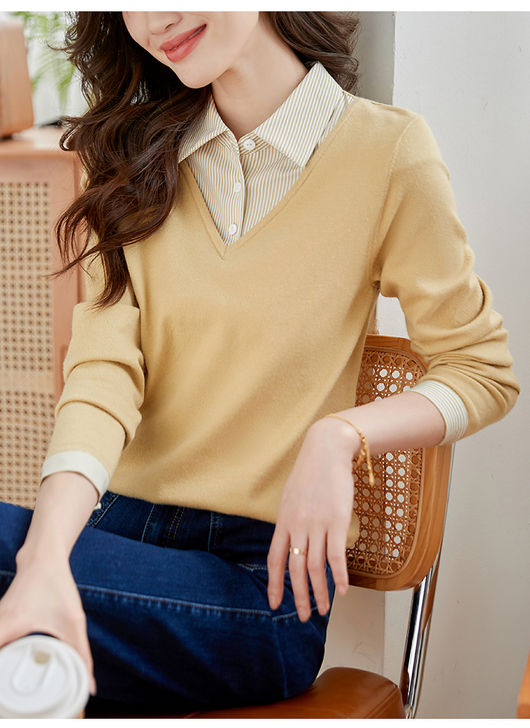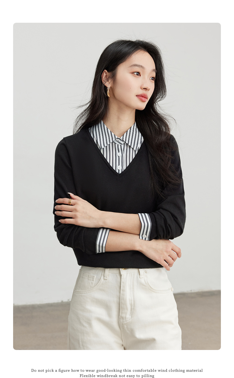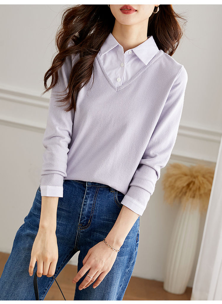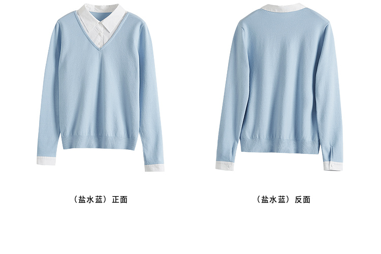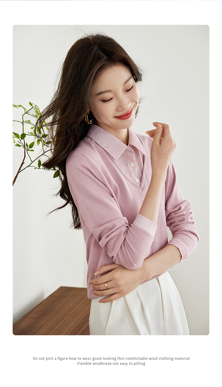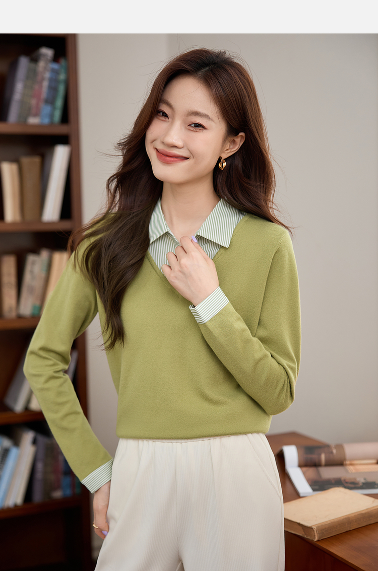 【周四狂欢价】熙世界通勤衬衫领拼接假两件针织衫秋季新款内搭长袖打底衫上衣