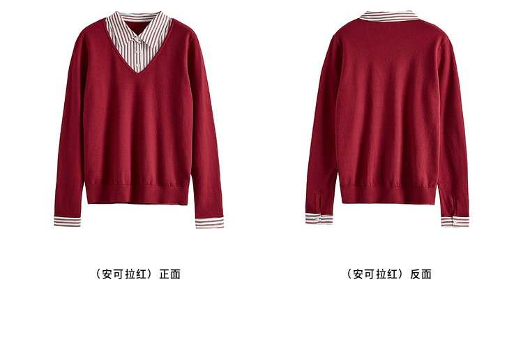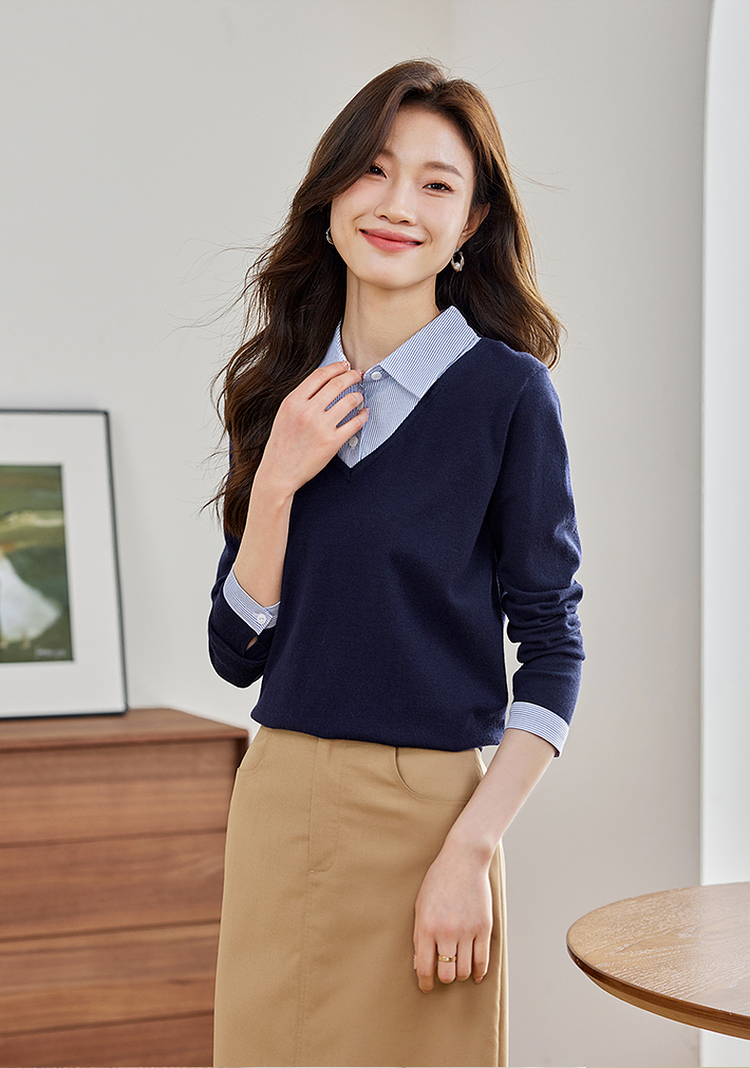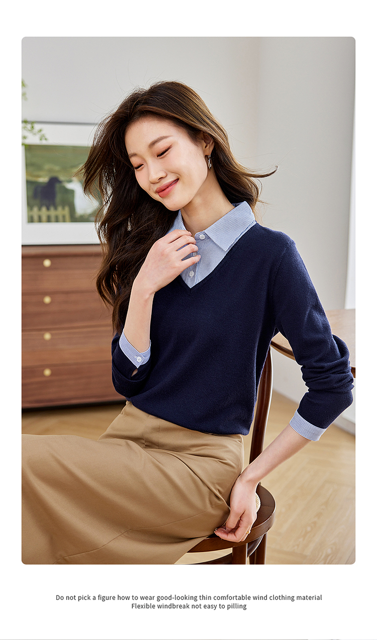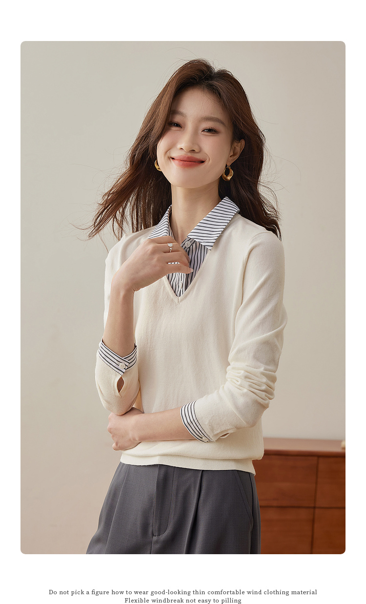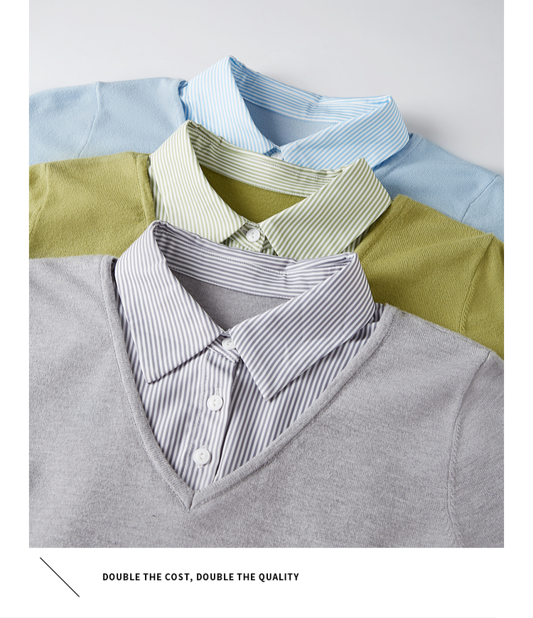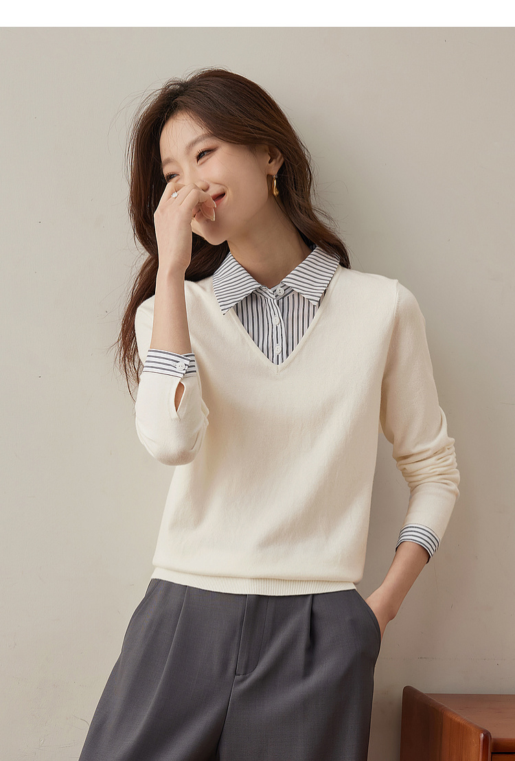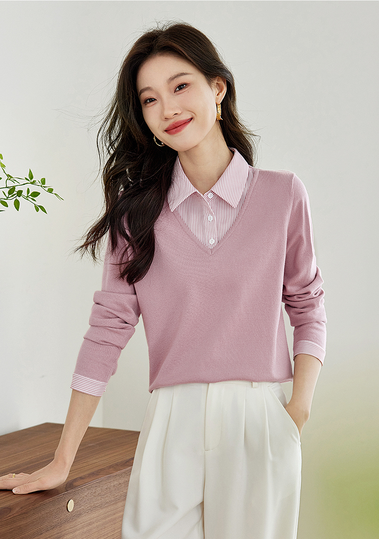 【周四狂欢价】熙世界通勤衬衫领拼接假两件针织衫秋季新款内搭长袖打底衫上衣