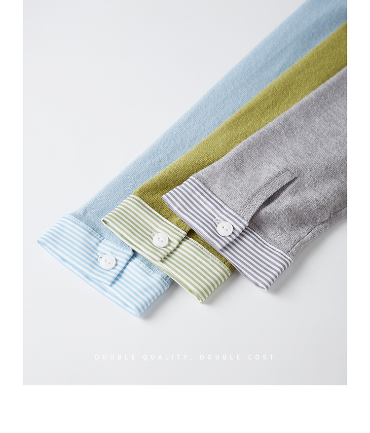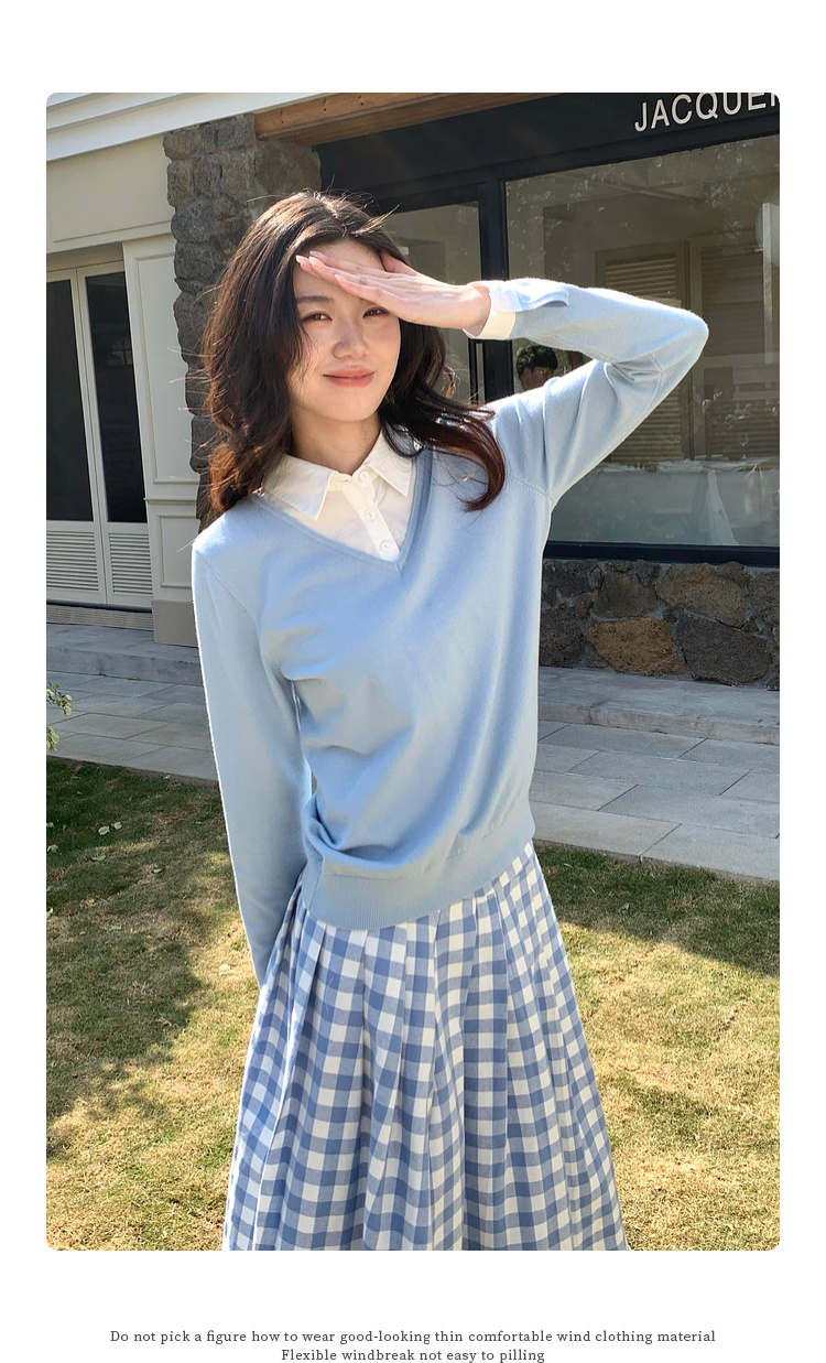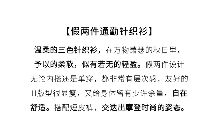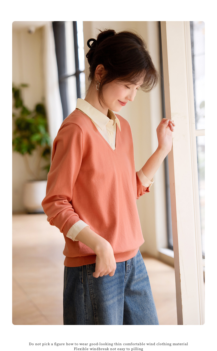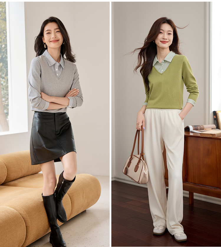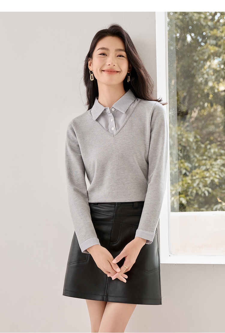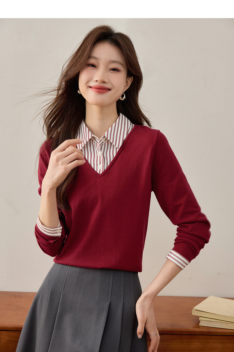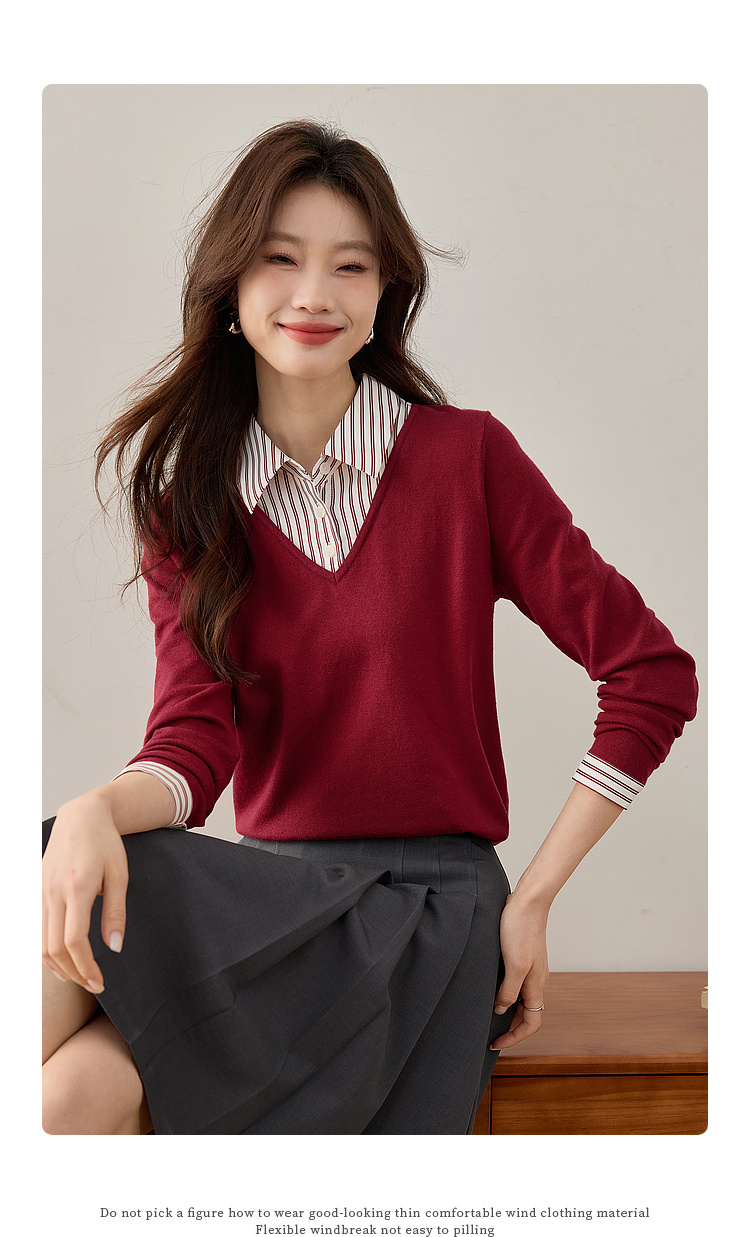 【周四狂欢价】熙世界通勤衬衫领拼接假两件针织衫秋季新款内搭长袖打底衫上衣