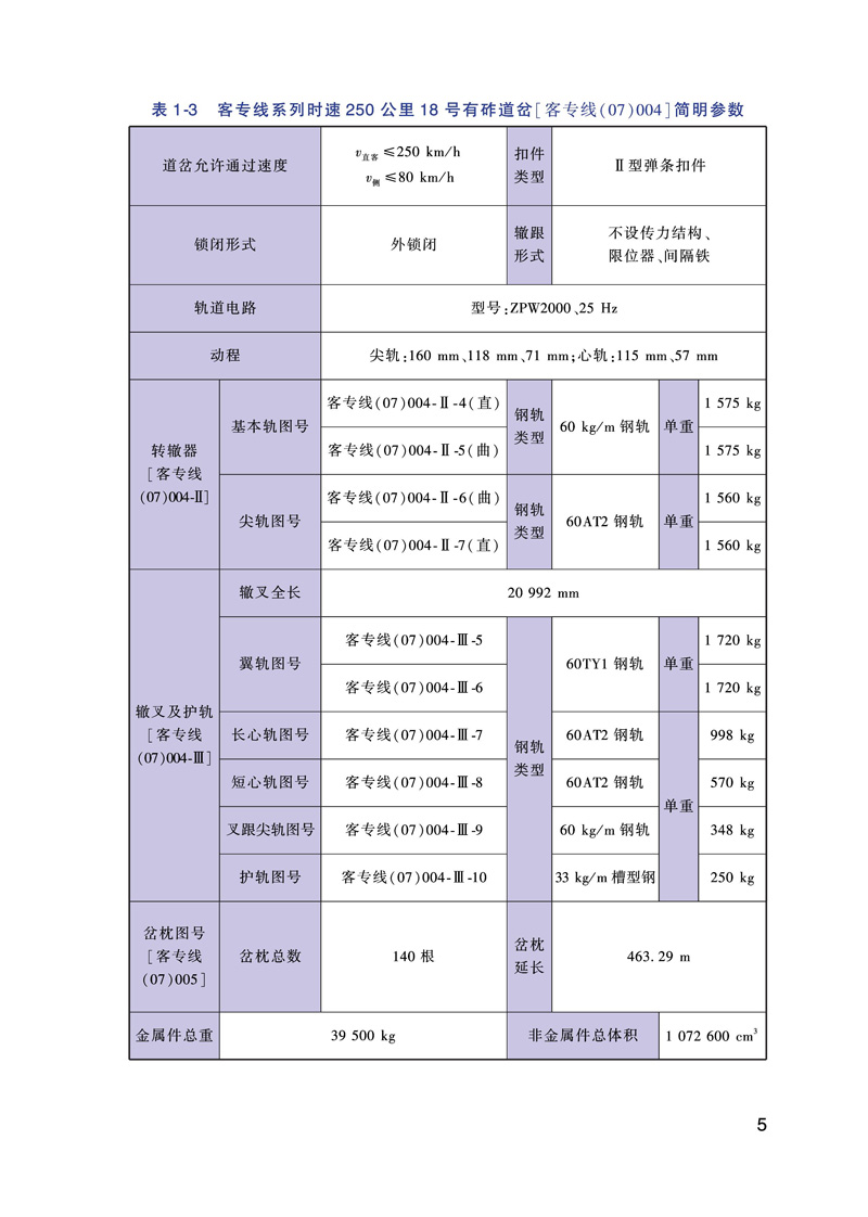 本书为《铁路道岔安装维护手册》之一《高速铁路有砟轨道客专线系列道岔安装维护手册》,本书全面收集了《铁路道岔使用规定》明确的高速铁路有砟轨道客专线系列道岔的相关资料,其中详细的介绍了道岔平面线型和简明参数、道岔轨距与框架轨距、钢轨件及钢轨组件、扣件系统、轨下基础和转换设备等信息。同时编写了道岔装卸、运输和贮存的基本要求。详细介绍了道岔现场安装的基本工序与铺设注意事项。列举了道岔的主要作业方法及要求。为进一步方便现场维护人员对道岔铺设及维护过程中,编制了道岔铺设检验项目及要求、道岔日常检查项点记录表,绘制了道岔铺设检验项目图示等。本书既可以作为道岔参数查询手册,同时也为道岔的安装、维护提供了详细资料供现场参考使用。