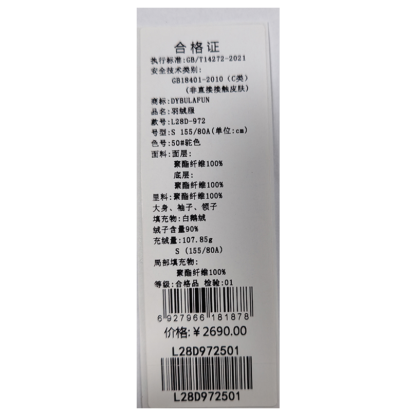 戴布拉芬羽绒服L28D972