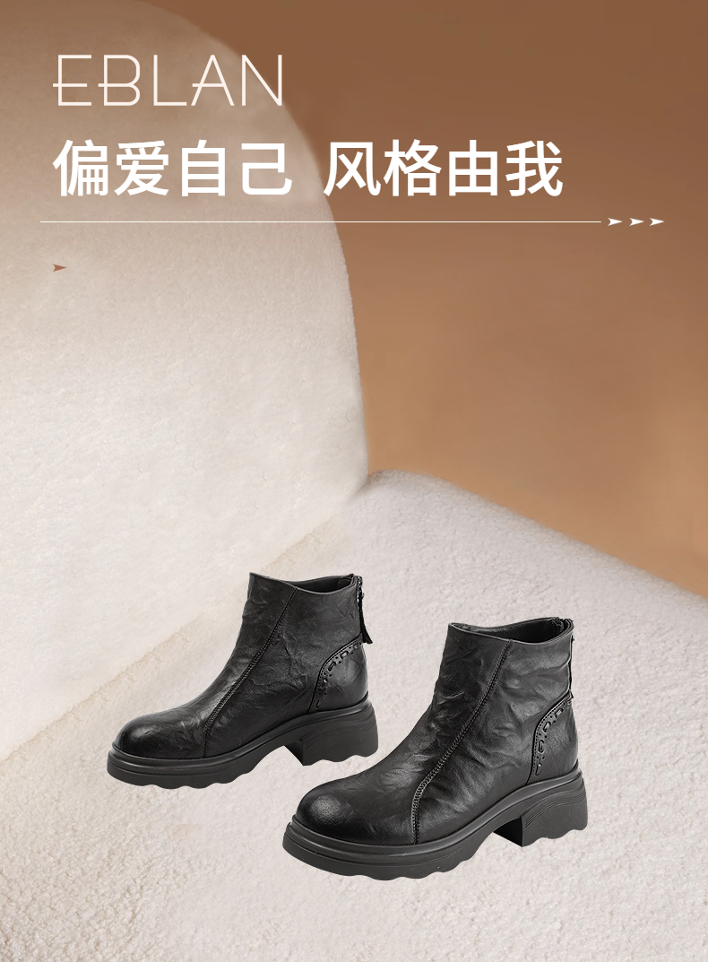 伊伴冬季植鞣小羊皮质感鞋面酷飒皮靴女时尚休闲鞋B25613601
