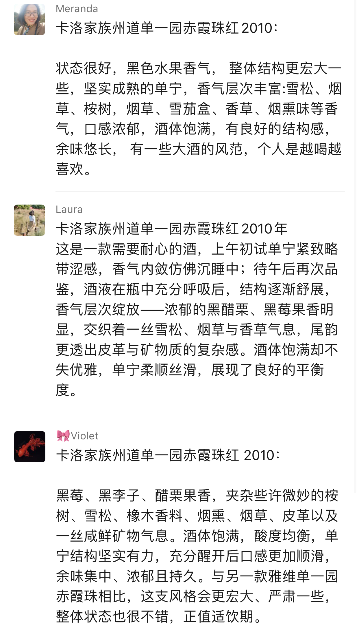 比较惊讶的是,此酒距今 16 年,却依然展示出了年轻力壮的活力,状态非常好。酒中的单宁变得更加细腻,黑色水果的香气与橡木桶陈酿以及陈年带来的气息和谐相融,口感饱满且顺滑,正值适饮期。