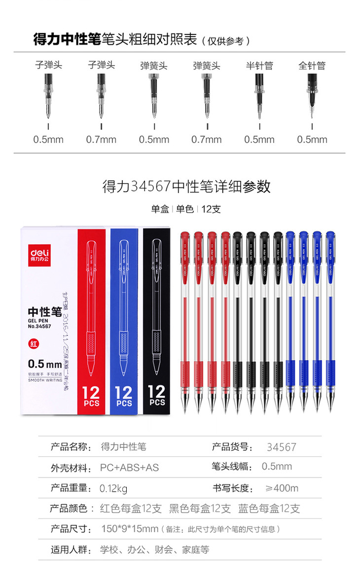 得力(deli)0.5mm办公中性笔 水笔签字笔 12支/盒黑色 红色 蓝色34567