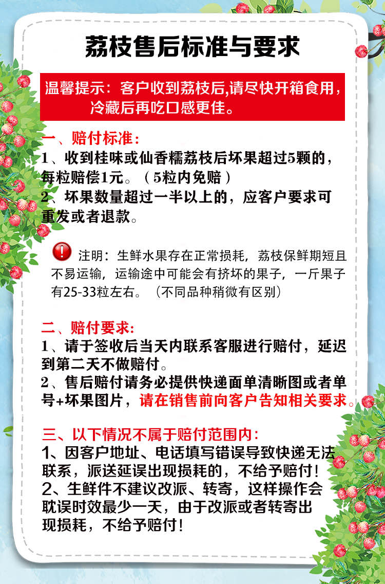 1、收到荔枝后坏果5颗内不赔付,超过的每个赔付1元。