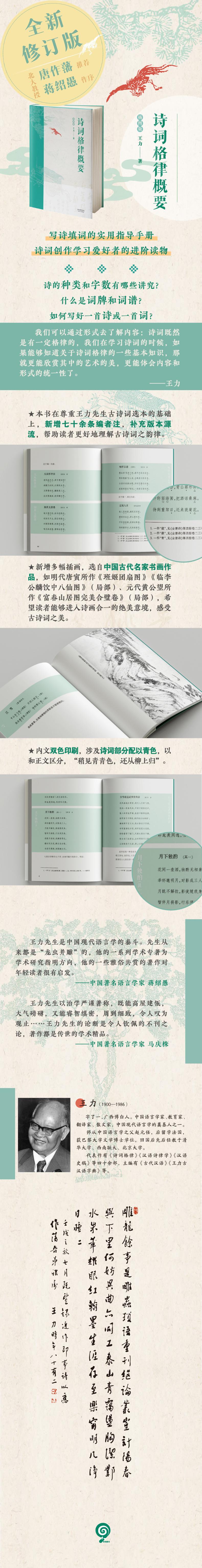 《诗词格律概要》是语言学权威王力先生写给大众的一部诗词格律普及读物。全书系统讲解了诗词的平仄、押韵等格律知识,既有对前人研究成果的总结,又有推陈出新的创见,严肃性与科学性并举,是王力先生在对诗词格律研究基础上提炼而成的精品。