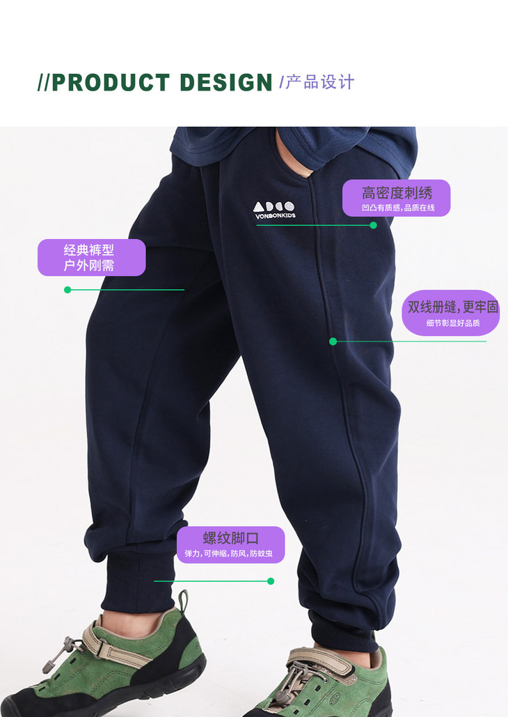 在面料的处理上,真的煞费苦心 因为我们的衣服都是给宝宝们穿着的 所以不仅功能性要好 舒适感也要做到最佳 裤子的里面采用了毛圈底的面料 贴肤柔软,吸湿排汗,又很透气 大大的提升了穿着体验感 这样好的裤子, 真的要多备两条才安心