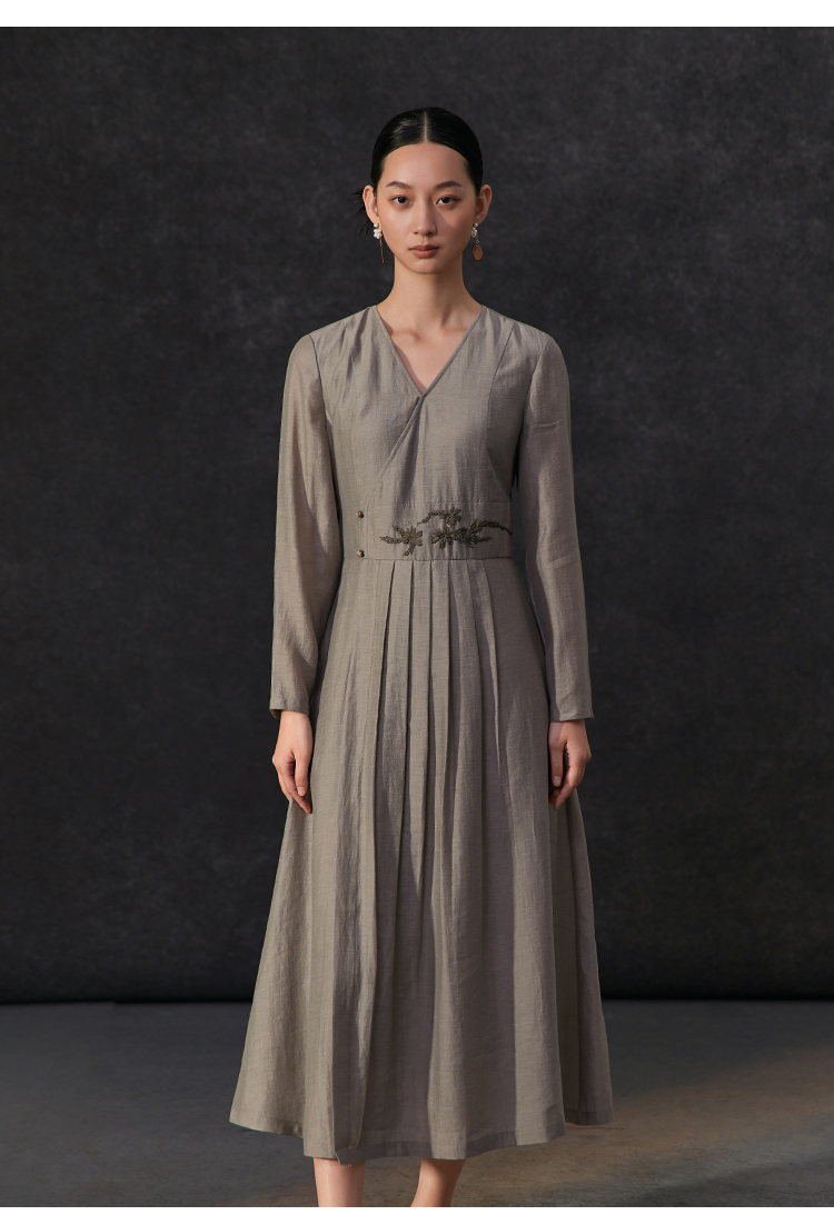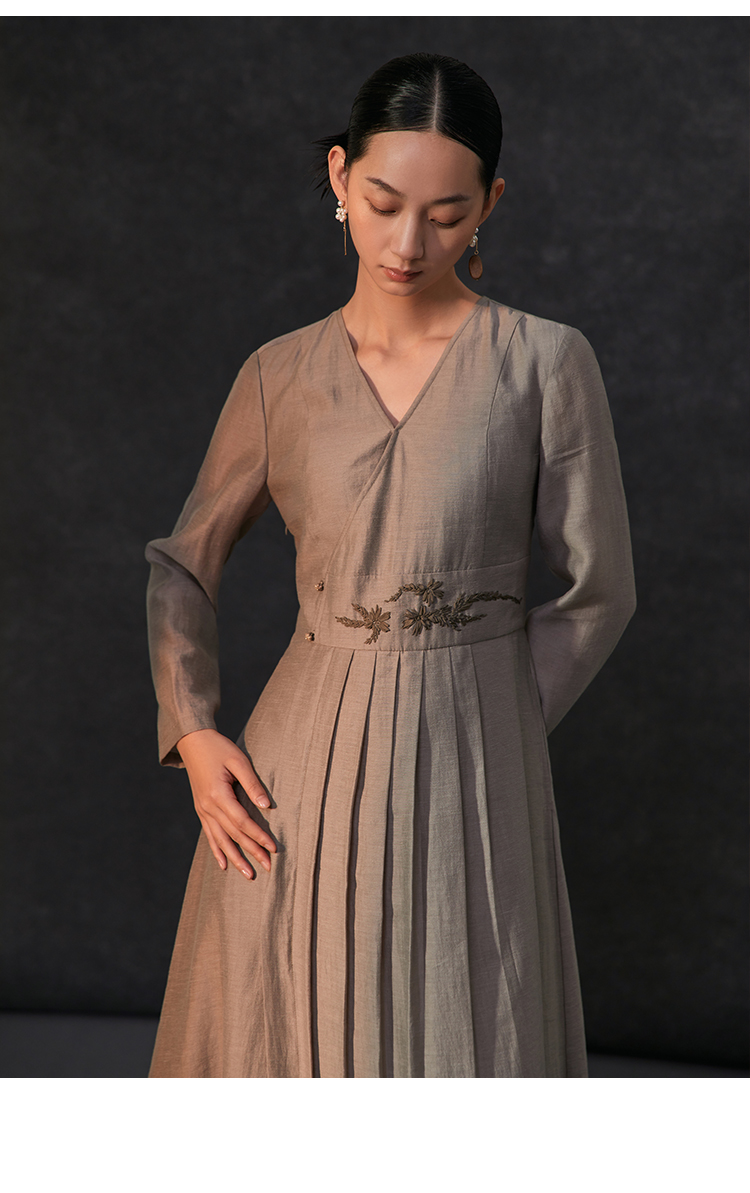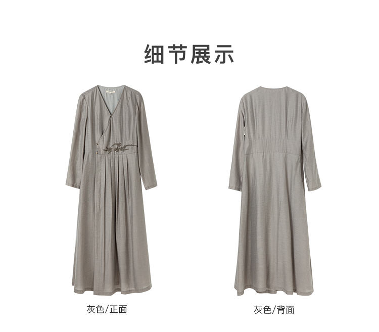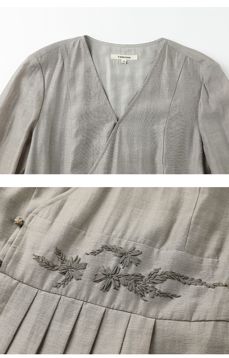 Famecoco新中式v领绣花连衣裙女士斜门襟a字百褶长裙FAC1FA034