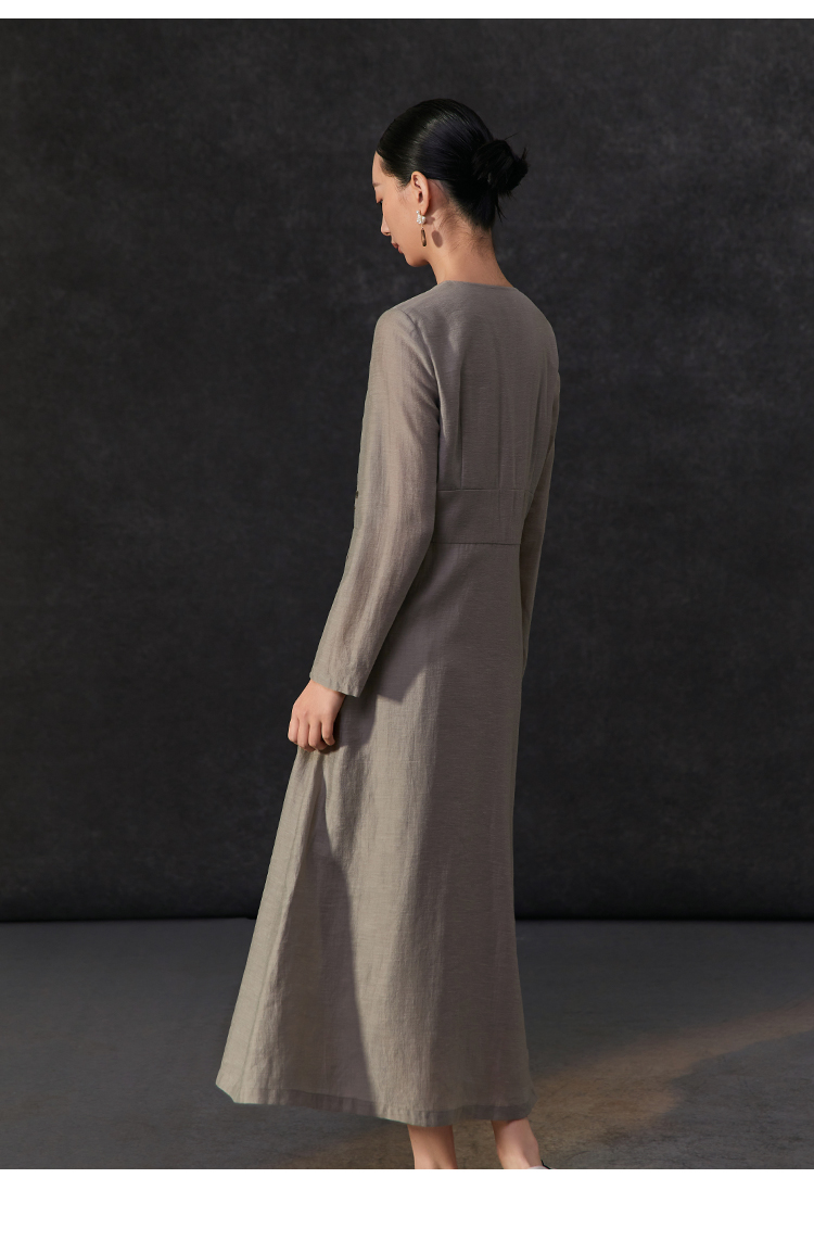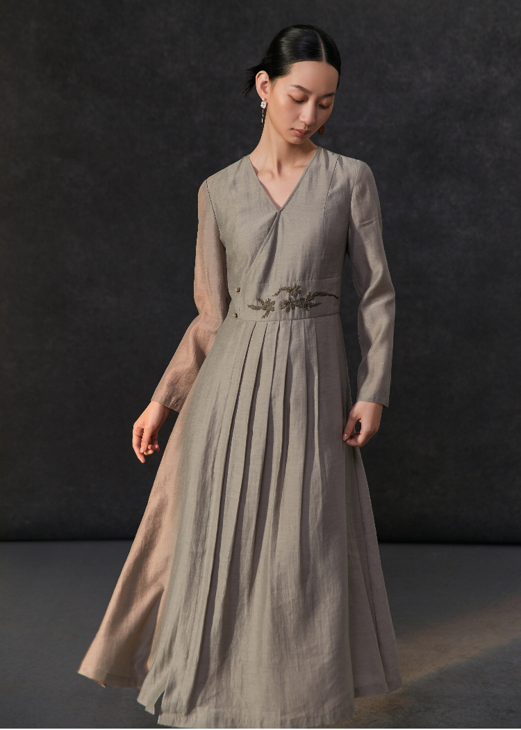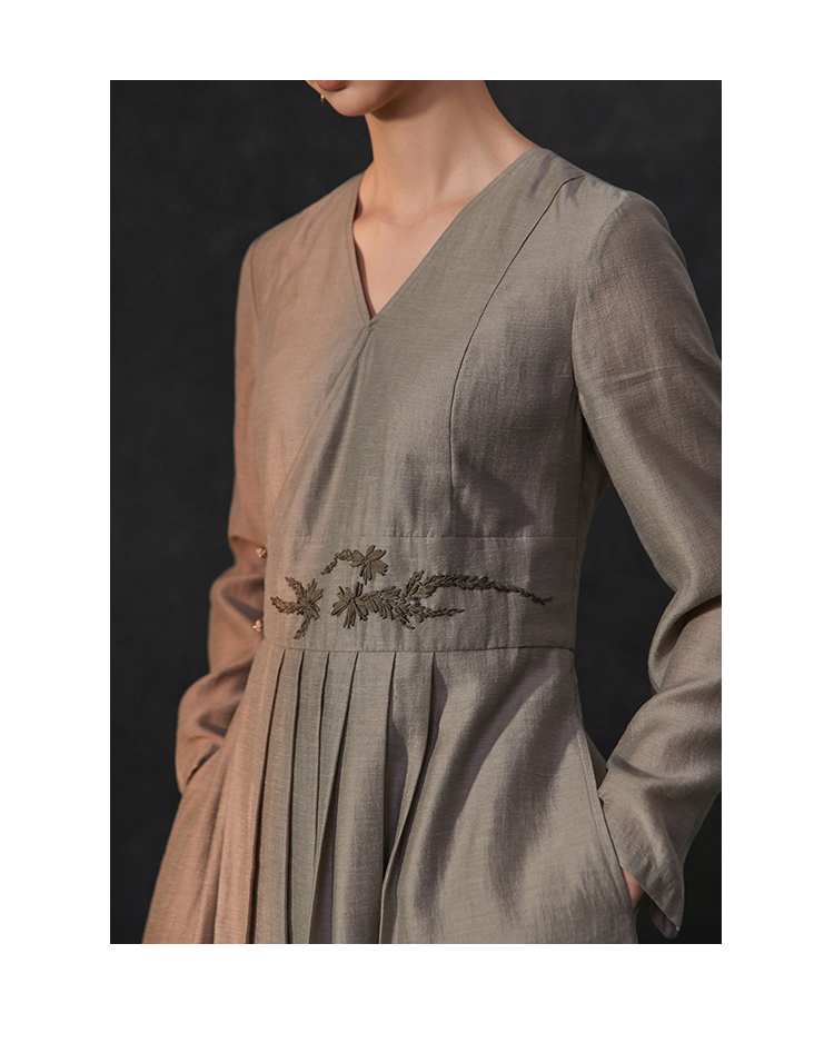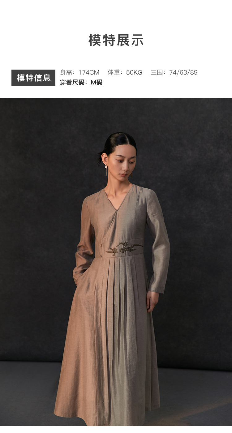 Famecoco新中式v领绣花连衣裙女士斜门襟a字百褶长裙FAC1FA034