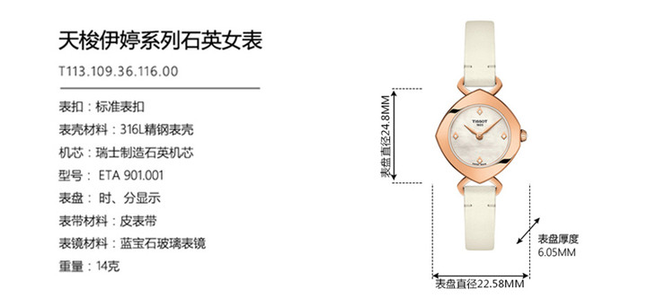 | 机芯 | 石英机芯 ETA 901.001 | 表径 | 24.8 * 22.58 mm |