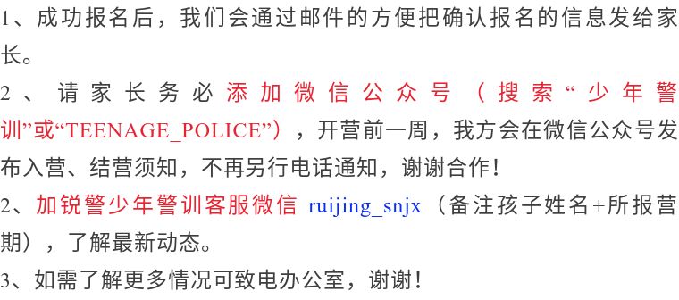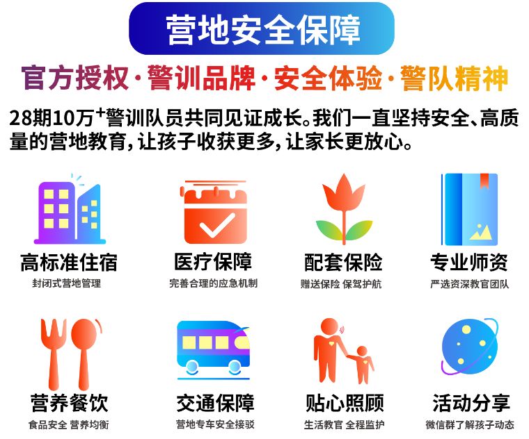 - 锐警少年警训致力于打造“营地教育+安全教育”领航品牌。以专业的警务特色课程体系,为青少年提供沉浸式安全教育,锻造外展自我、内拓素质的现代英武少年。