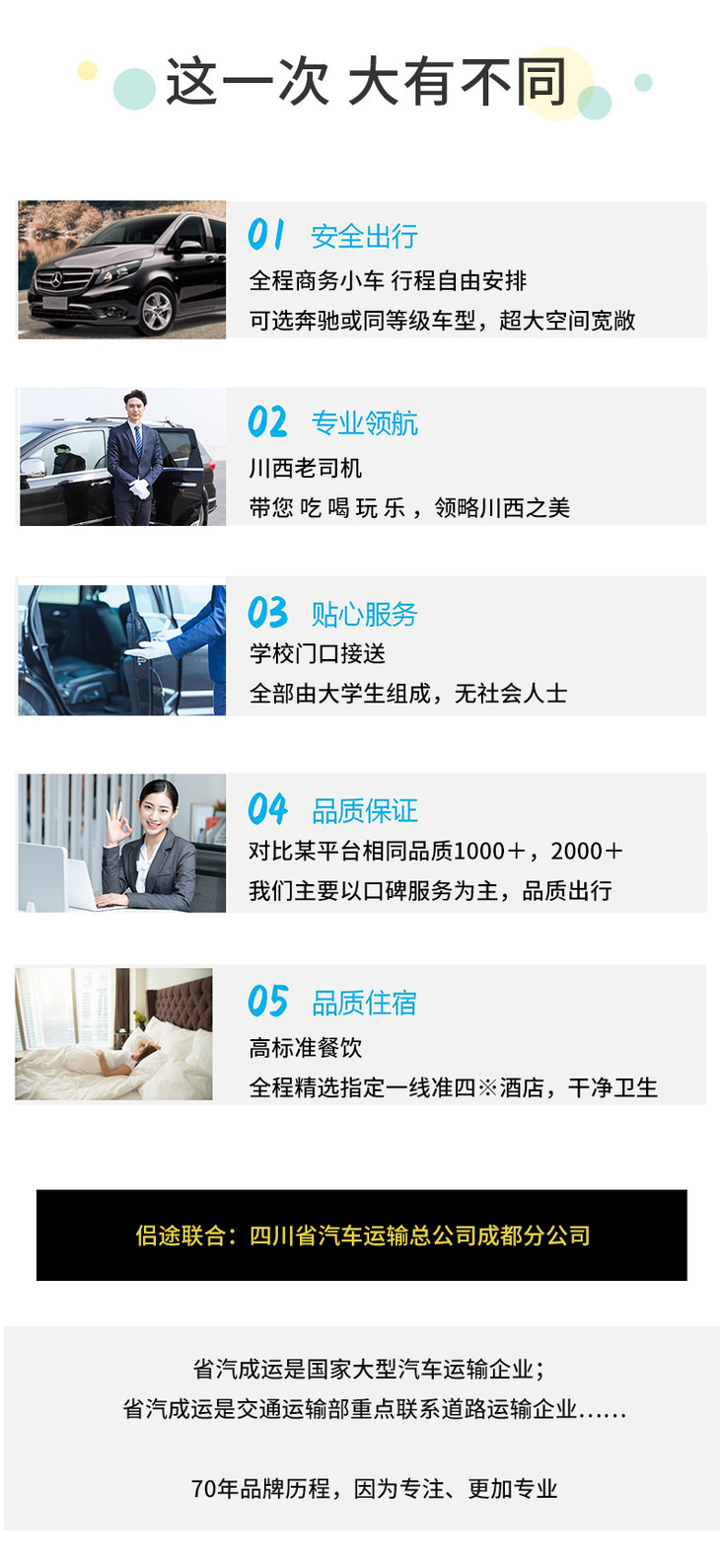 侣途出行专注川内大学生出行两年余,现已发展成川内最大的学生旅游出行平台,每年服务学生上万人。每次出行都有专人提前到目的地踩点,行车助理专业亲和,同行伙伴都是学生,信息安全高度保密。