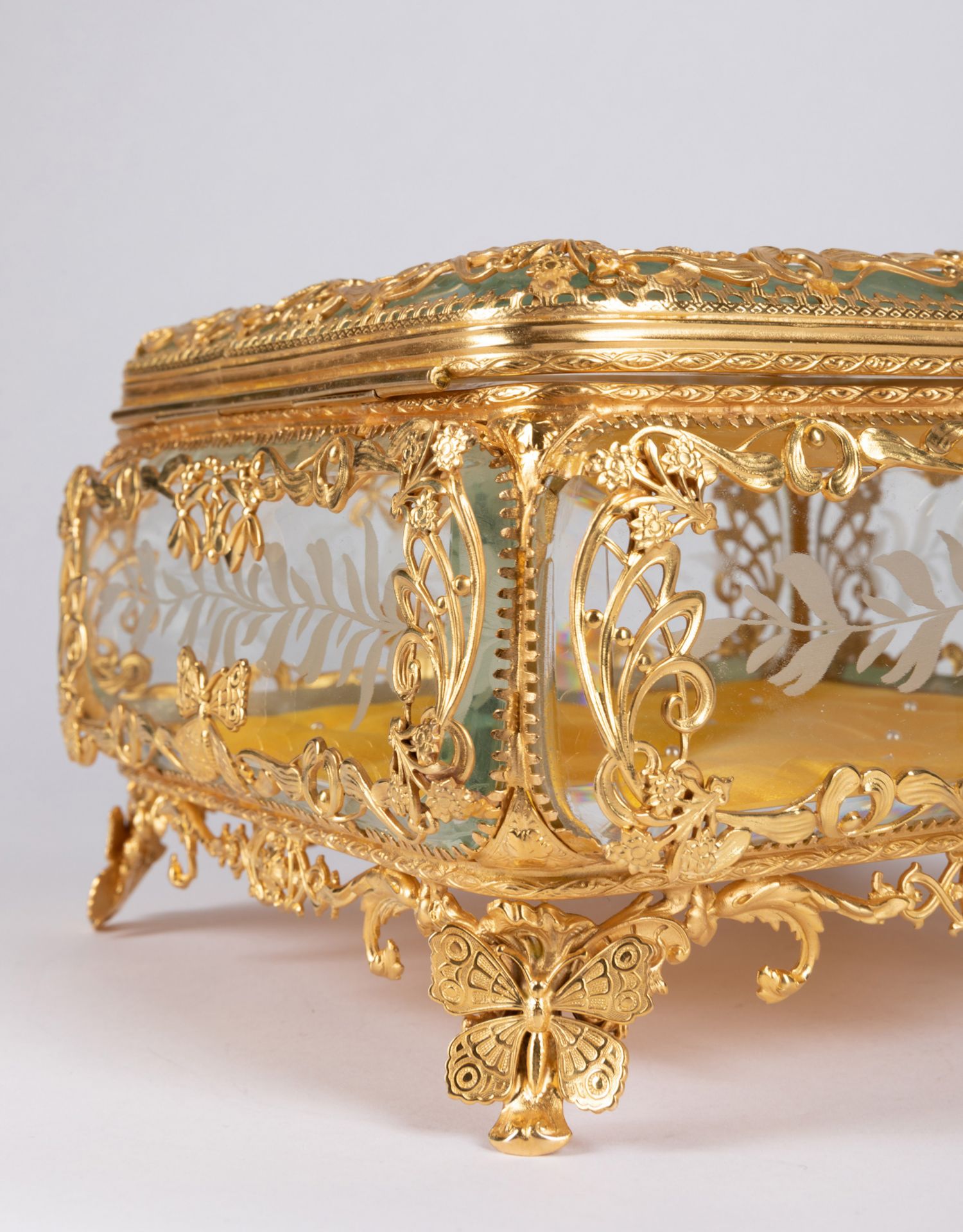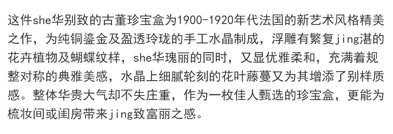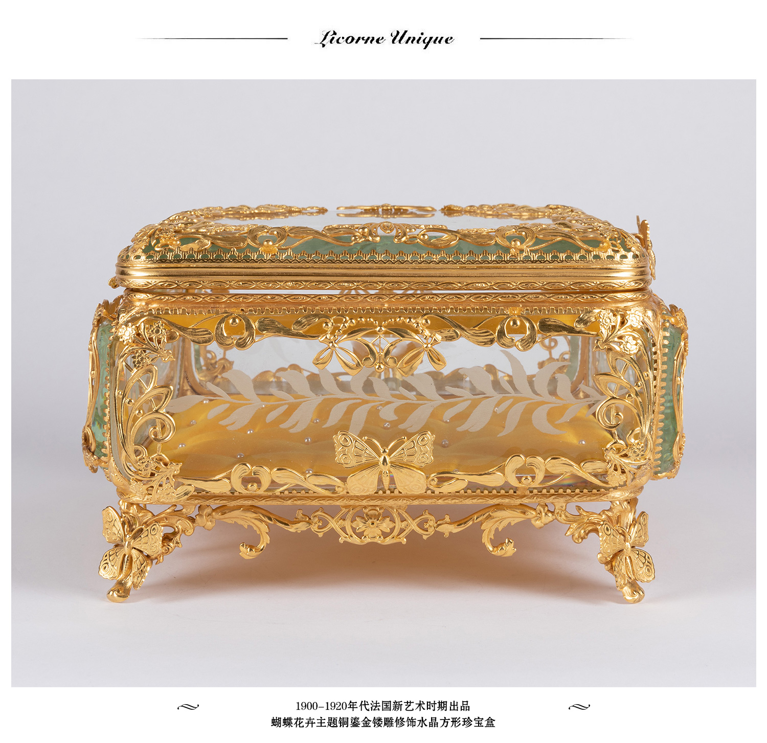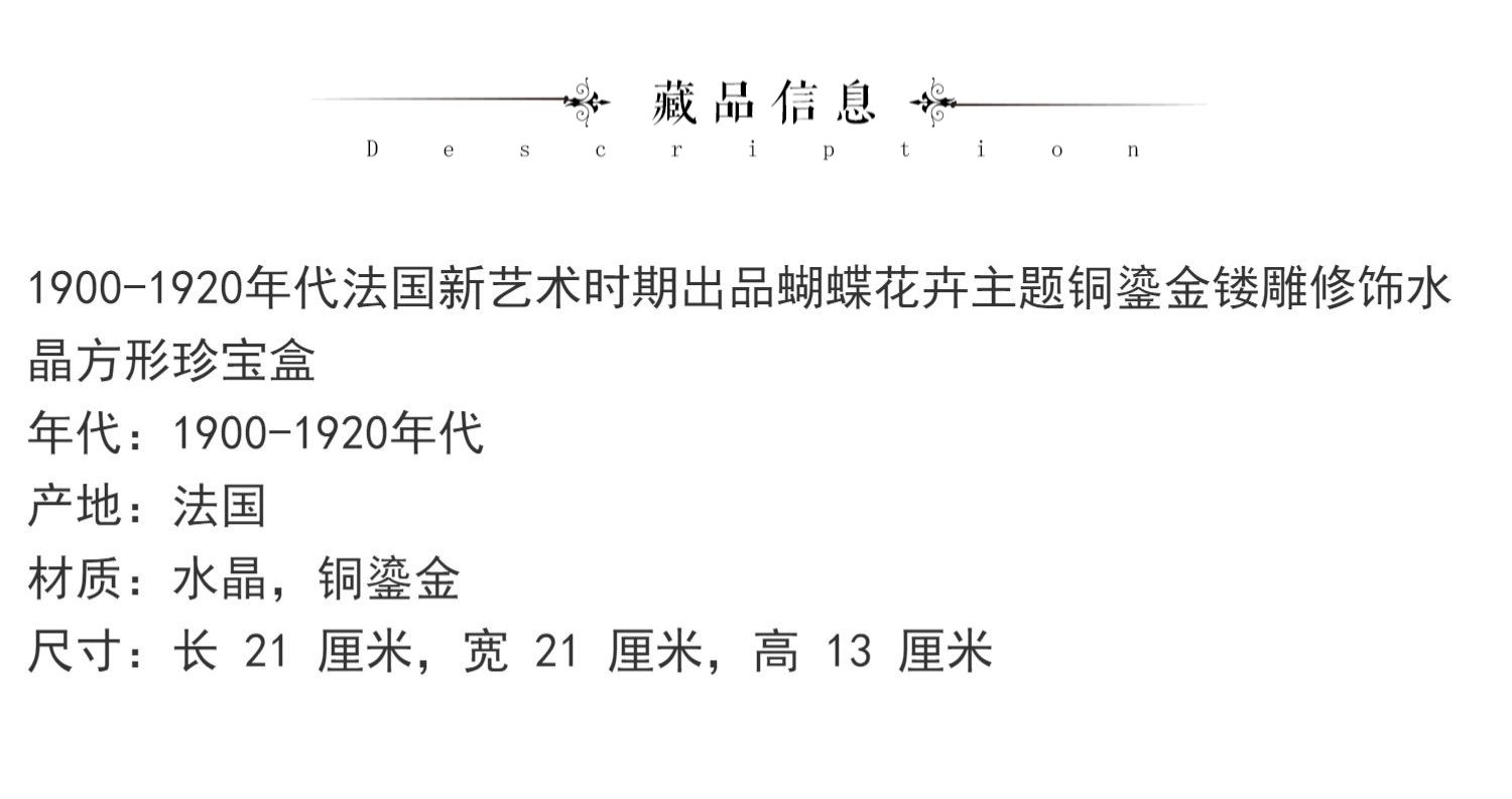 独角鹿西洋古董法国蝴蝶花卉主题铜鎏金镂雕修饰水晶方形珍宝盒
