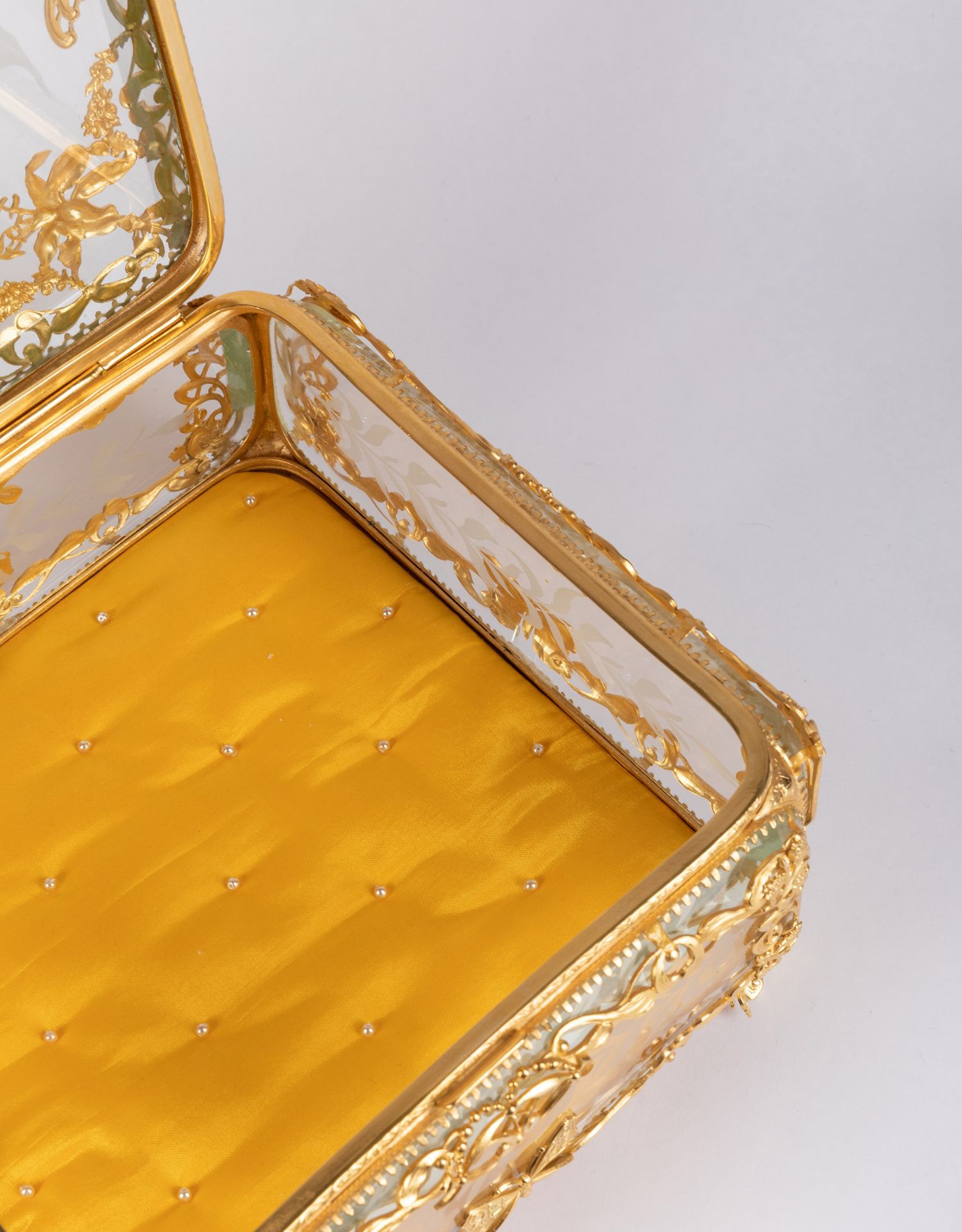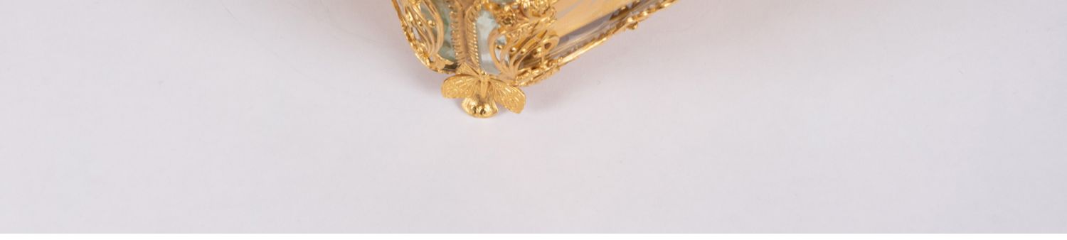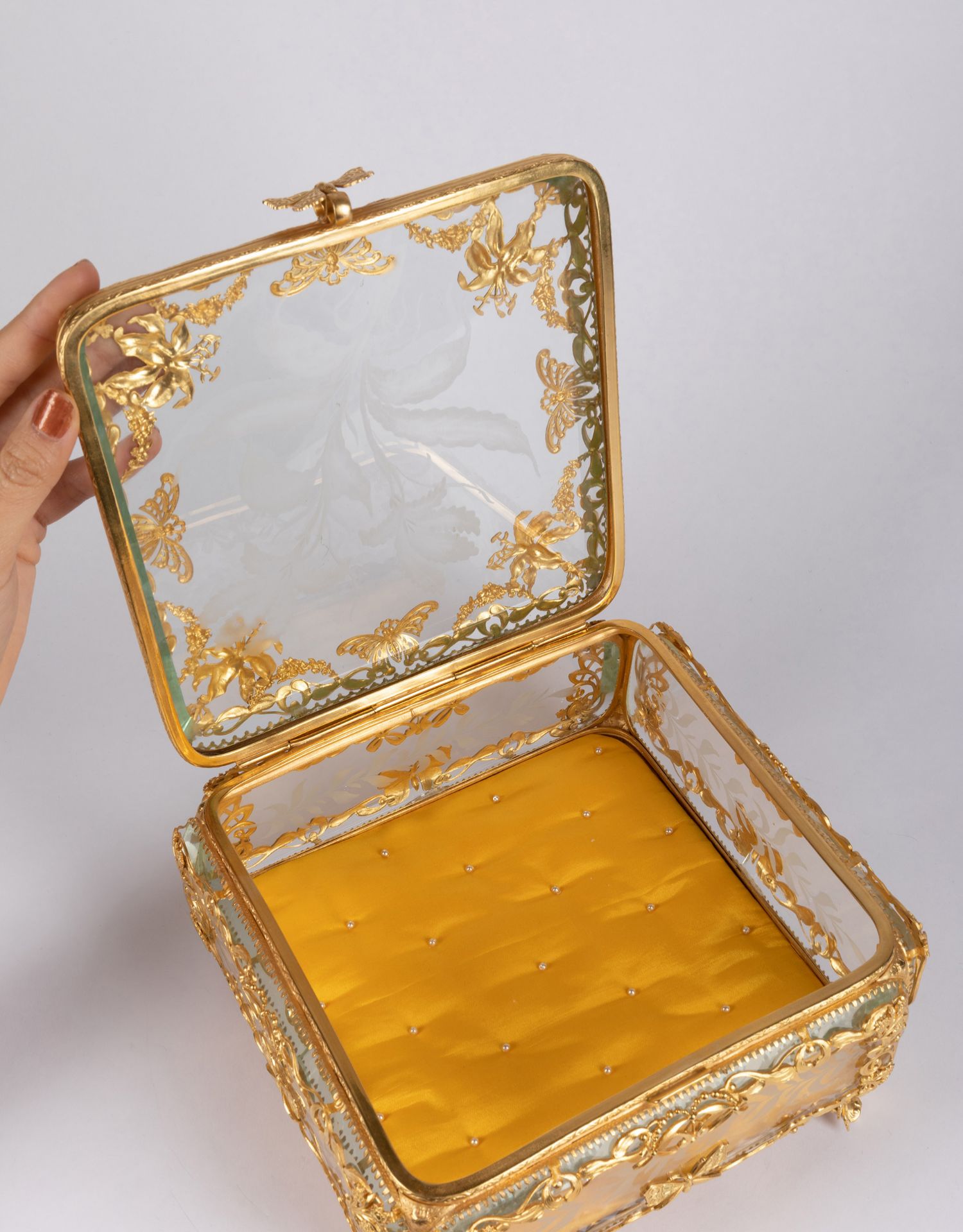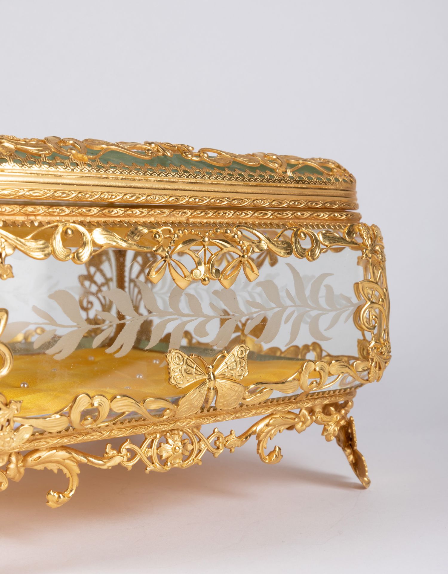 独角鹿西洋古董法国蝴蝶花卉主题铜鎏金镂雕修饰水晶方形珍宝盒