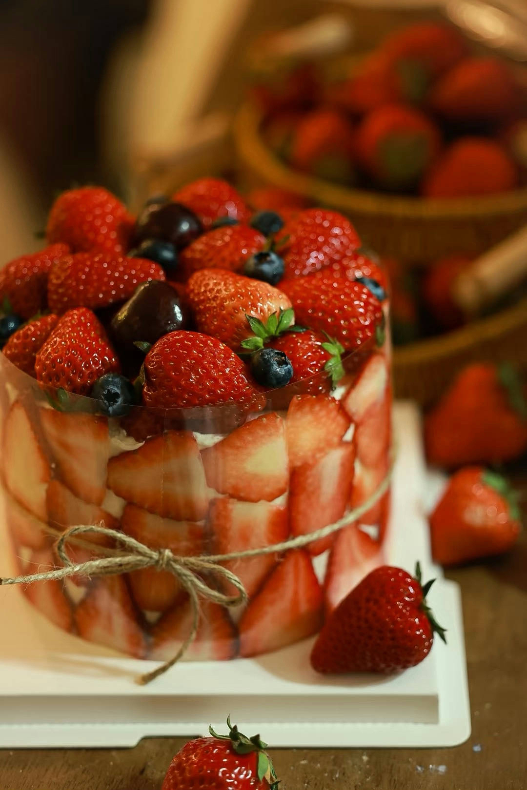 「食材」100%法国 / 新西兰动物奶油,乳酪戚风蛋糕,特调草莓果蓉,当季新鲜草莓。