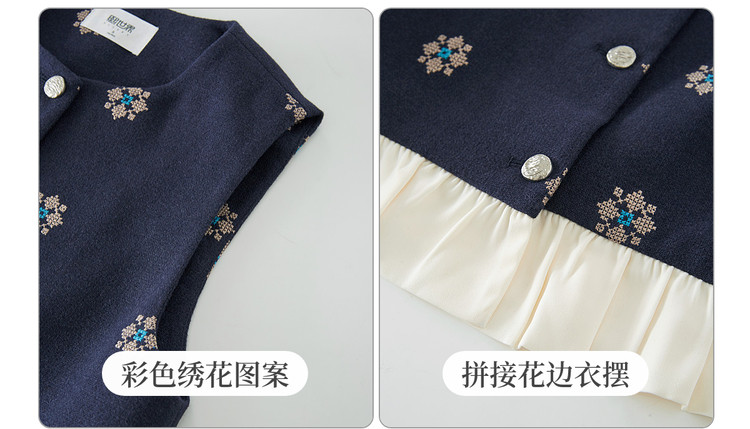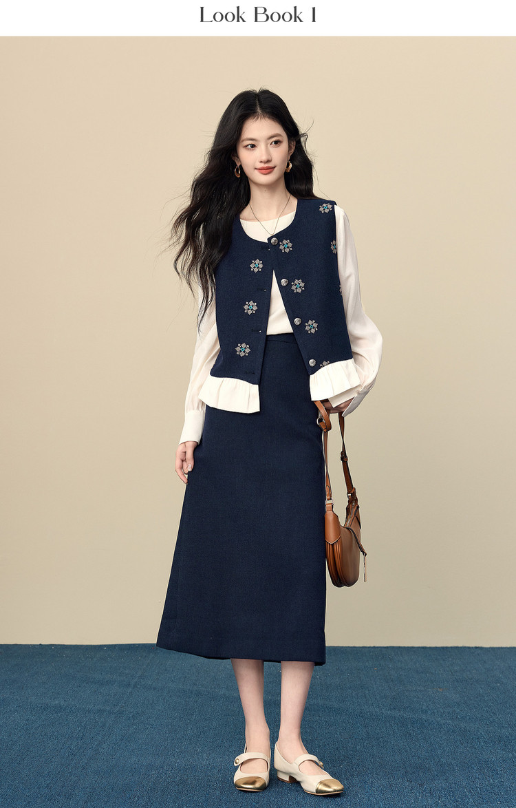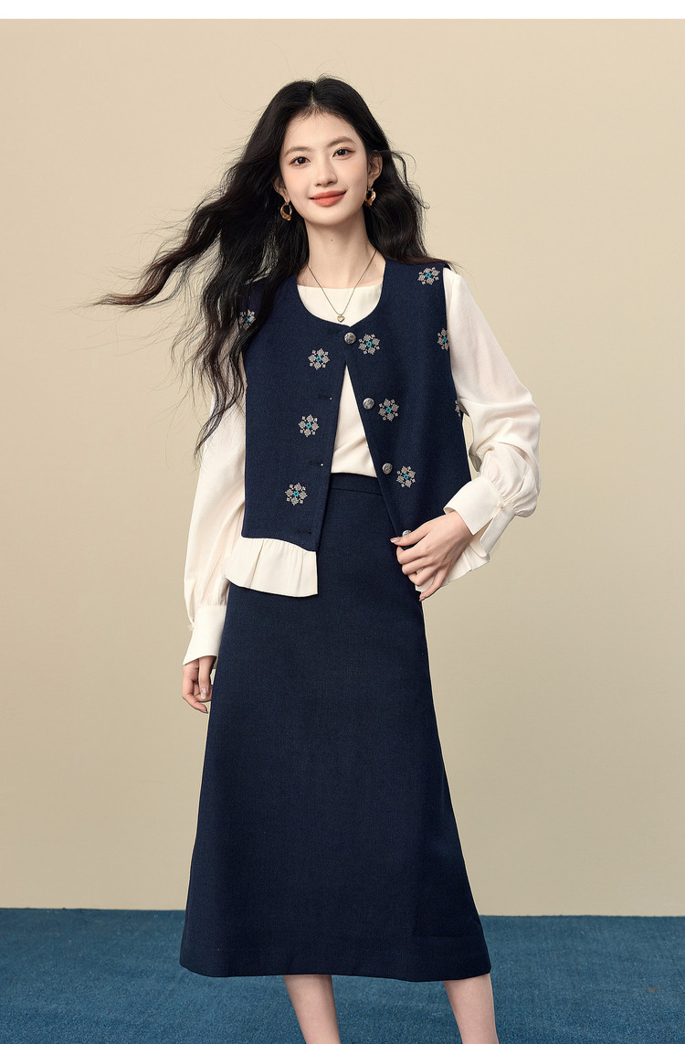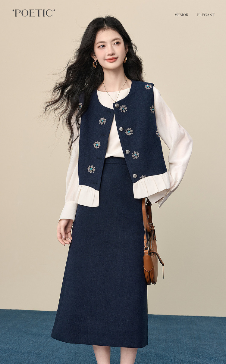 【12/24新品6.5折】熙世界复古小香风刺绣马甲套装女25秋冬新款休闲包臀半身裙两件套