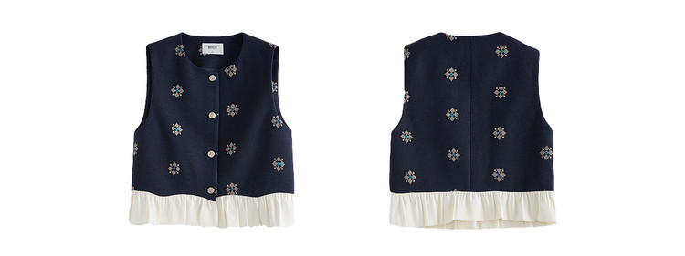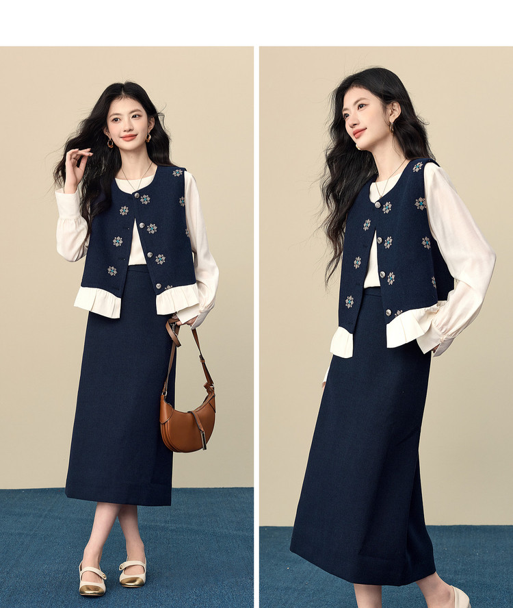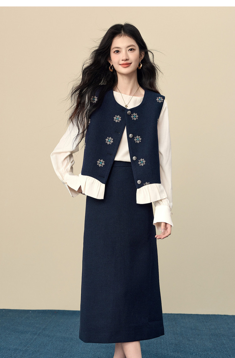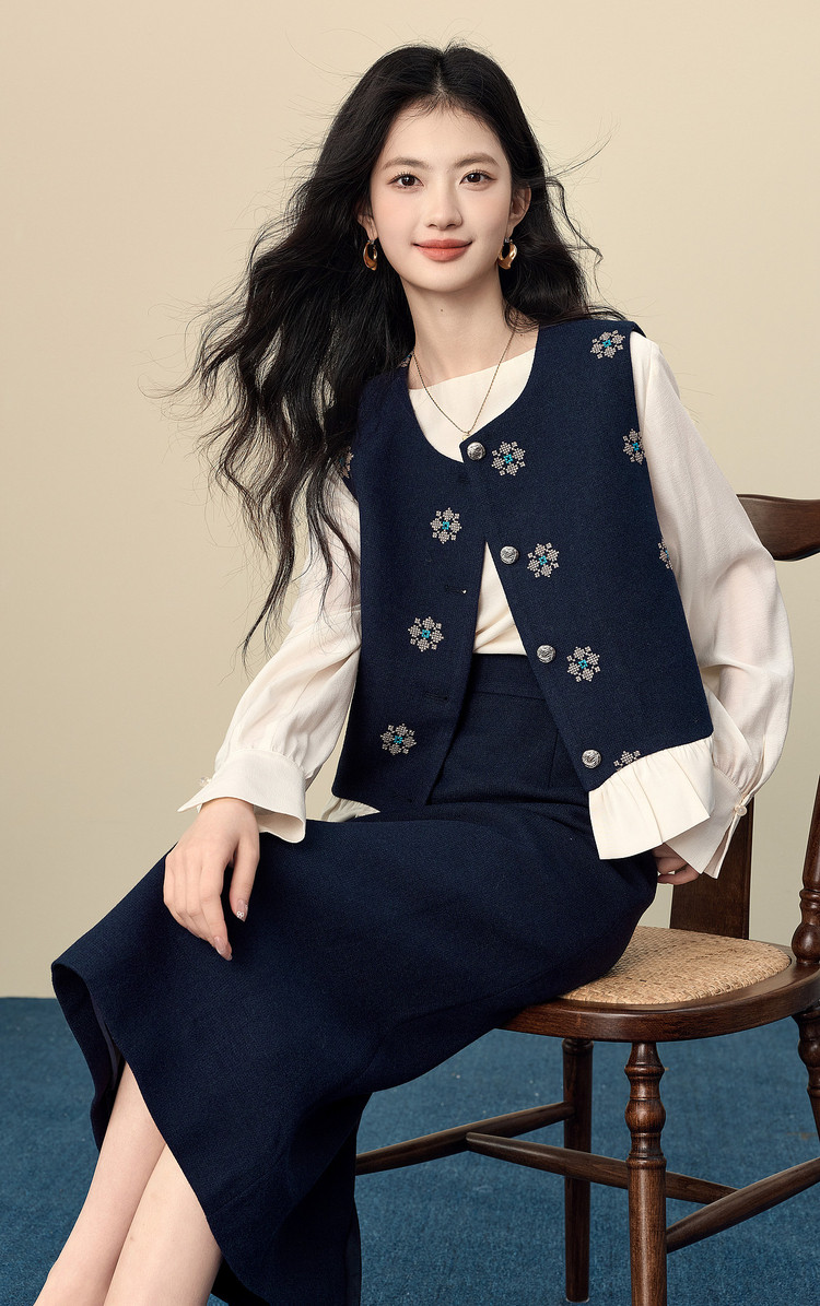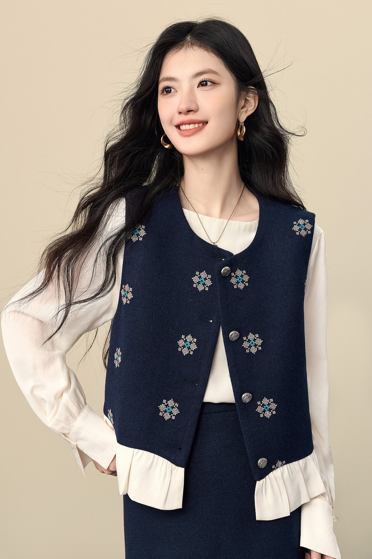 【12/24新品6.5折】熙世界复古小香风刺绣马甲套装女25秋冬新款休闲包臀半身裙两件套