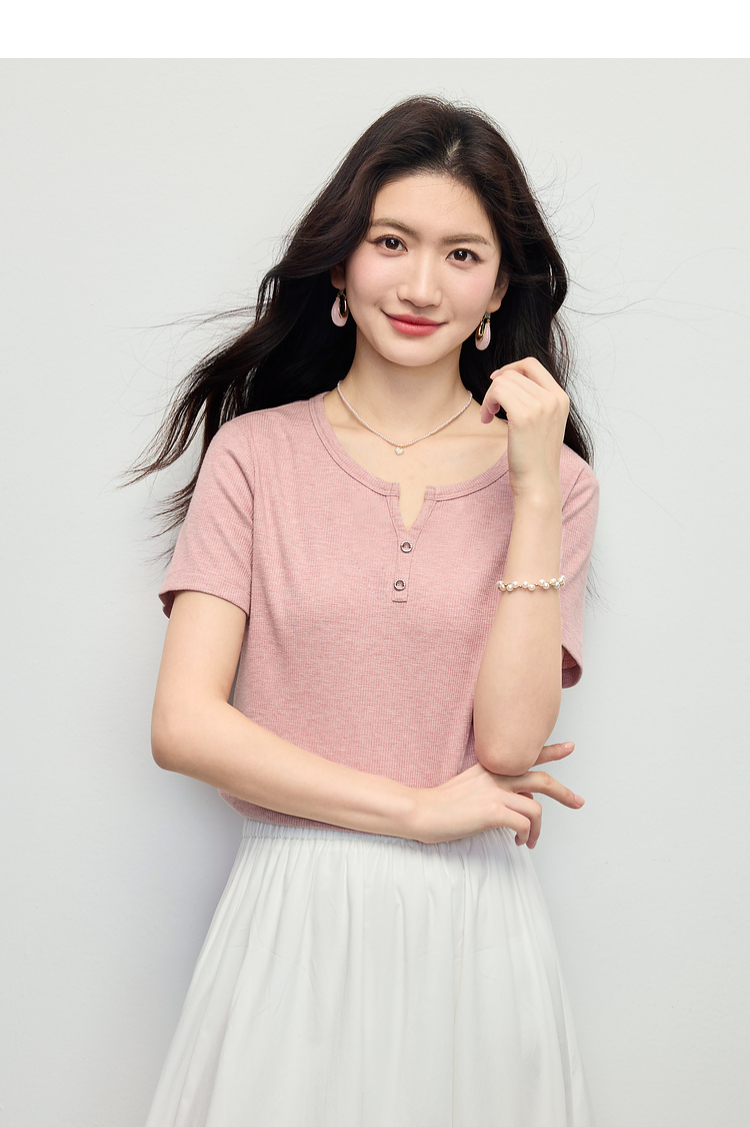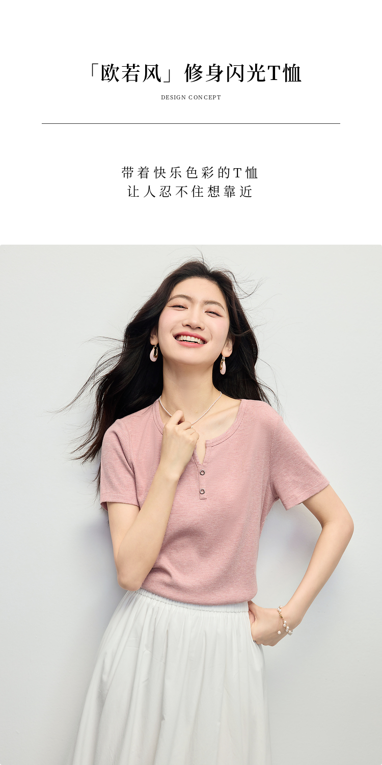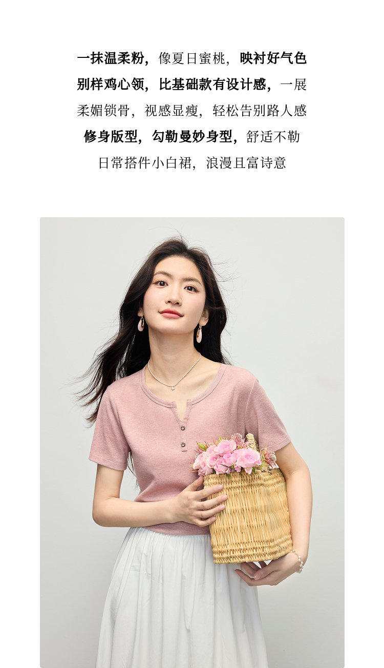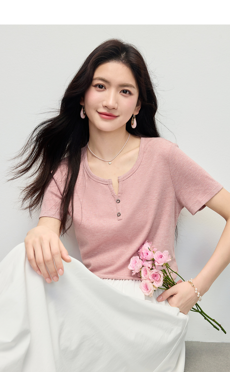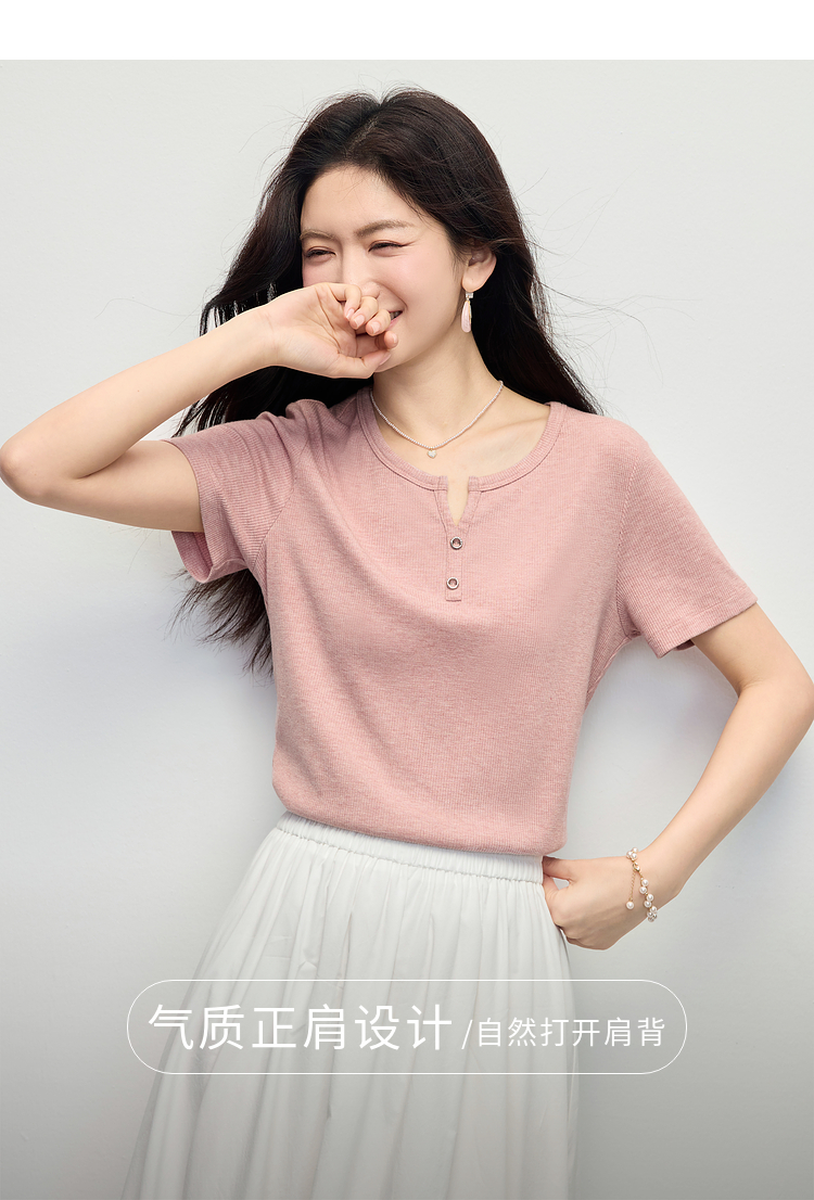 【专属特价】熙世界气质正肩粉色T恤短袖女2025夏季新款基础百搭休闲体恤上衣
