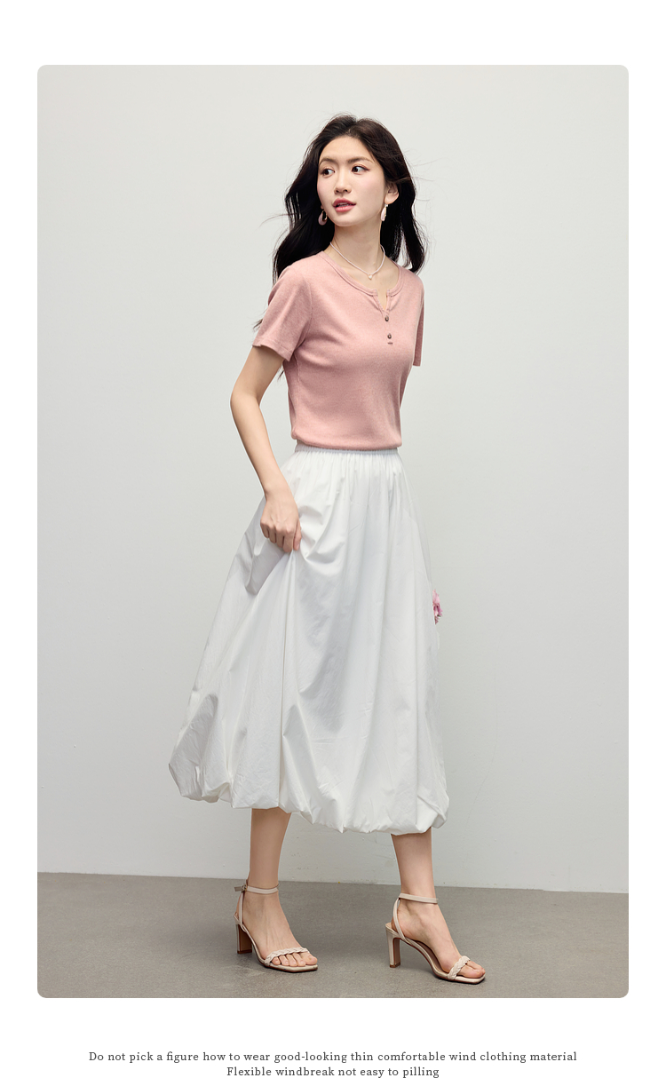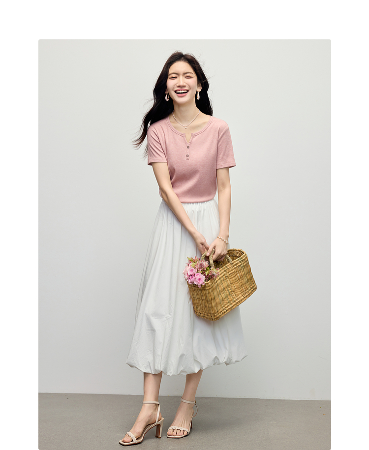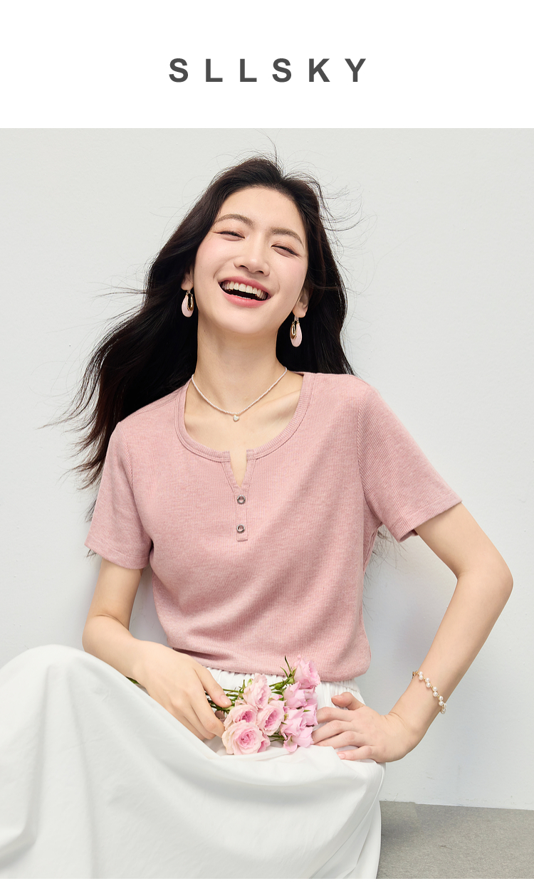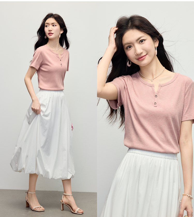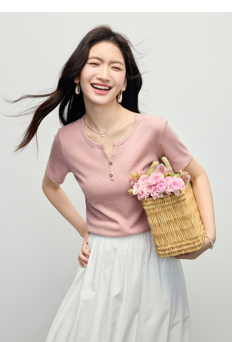 【专属特价】熙世界气质正肩粉色T恤短袖女2025夏季新款基础百搭休闲体恤上衣