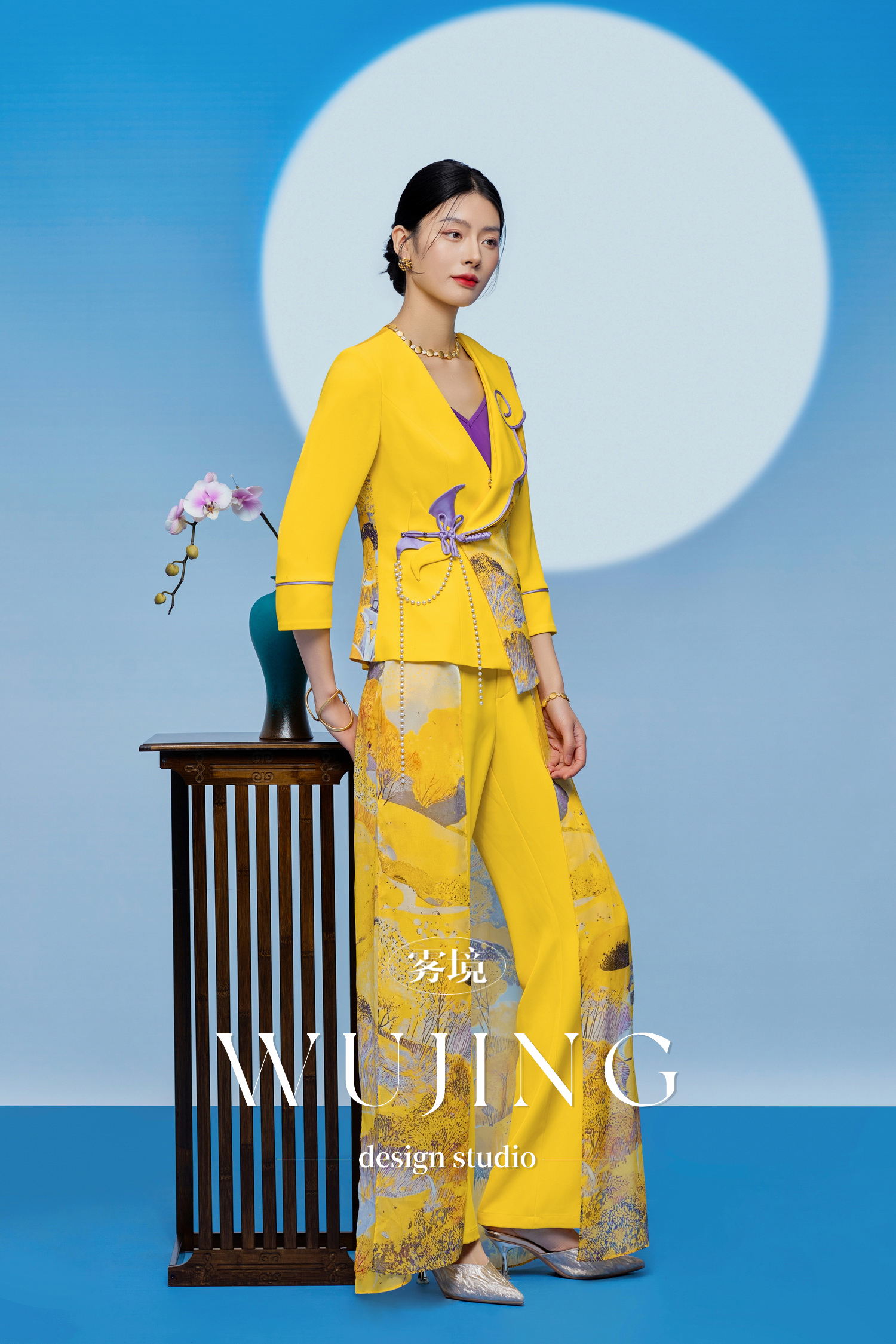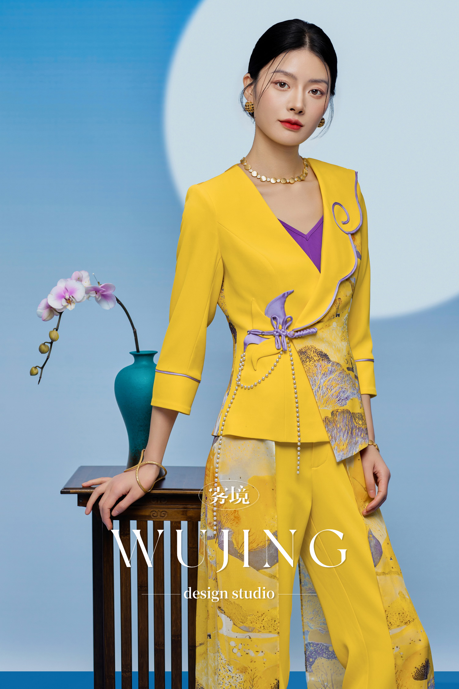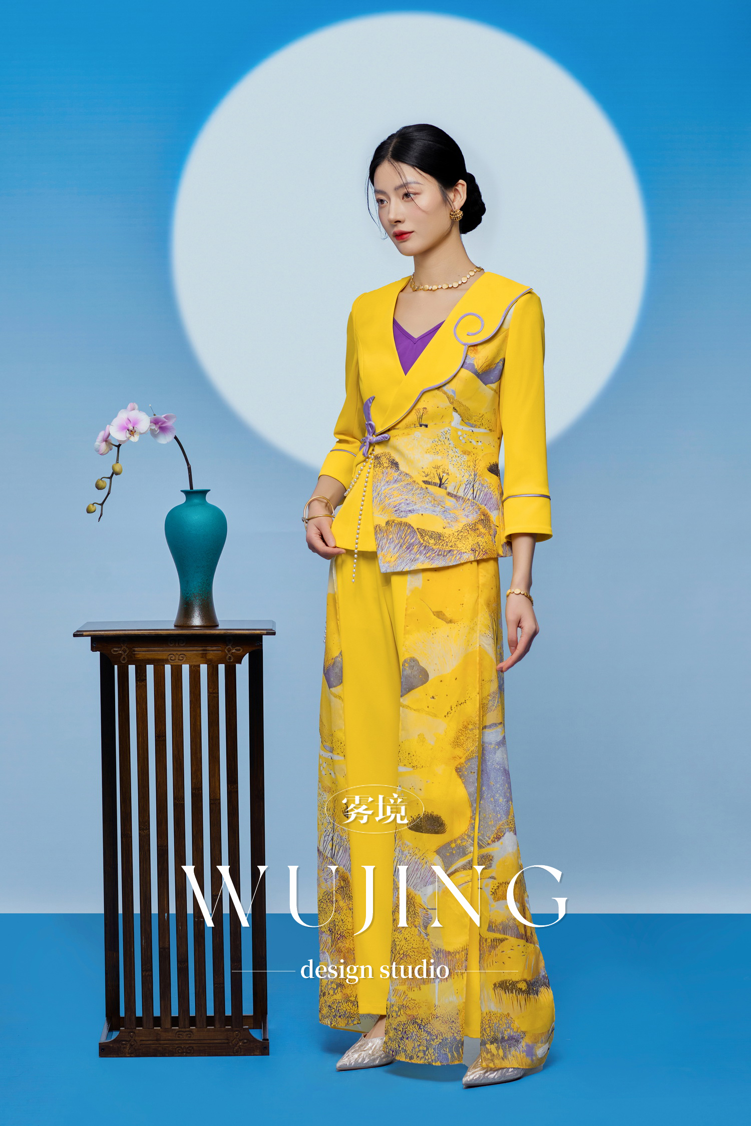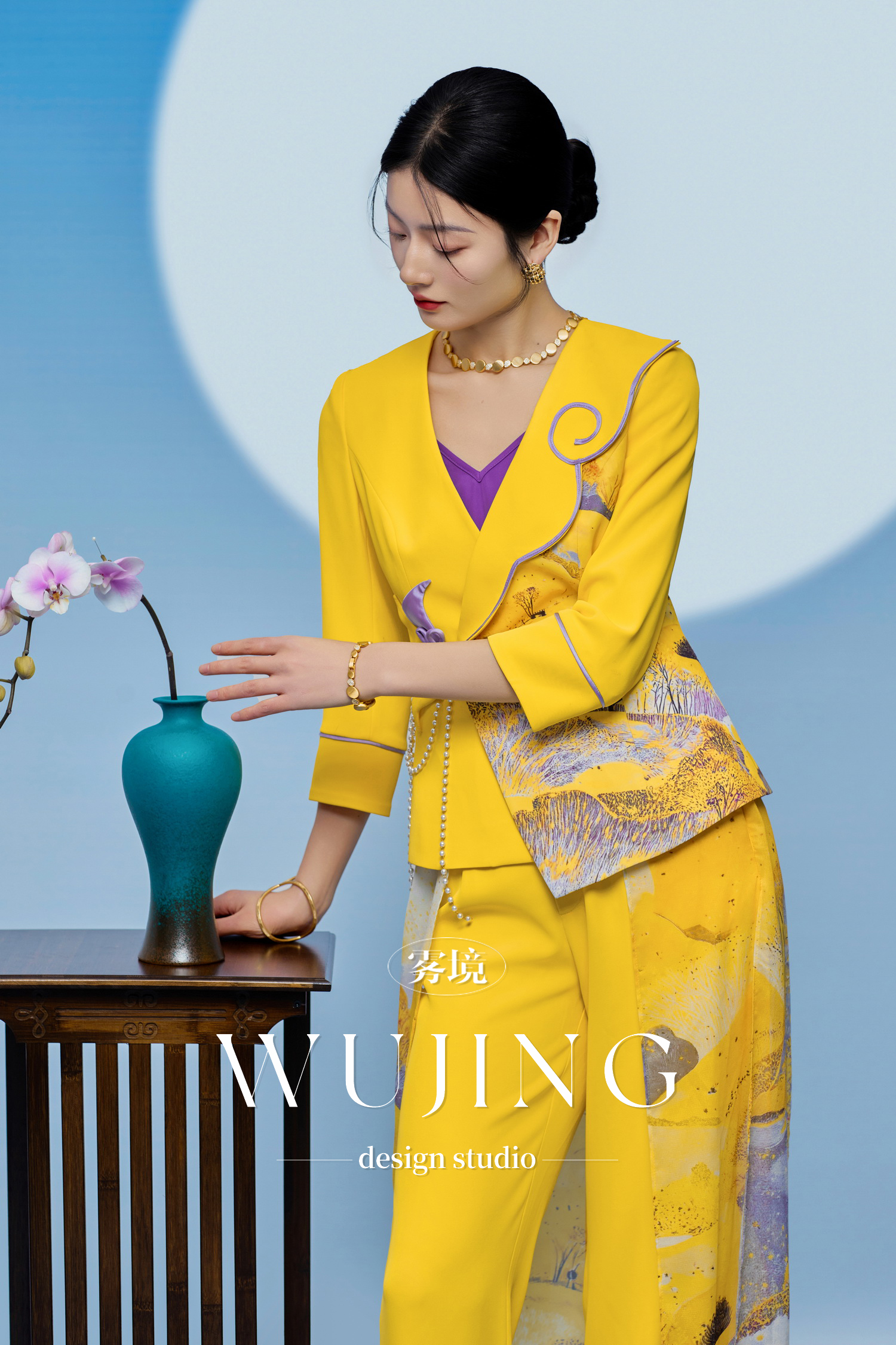 3205065 黄莺凝香 进口纹理蜂窝缎印花外套 雾境