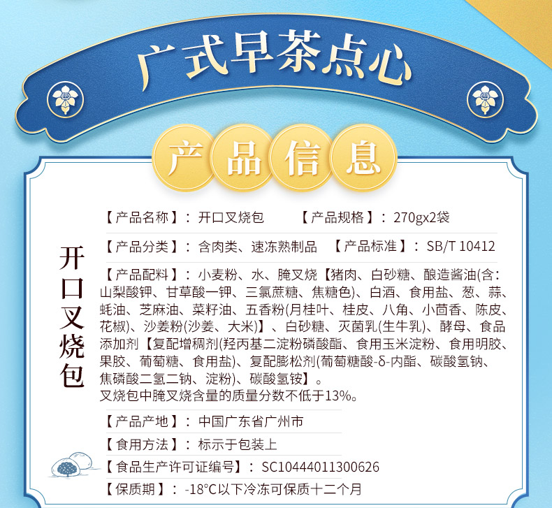 广州酒家 开口叉烧包270g*2方便速冻食品 早餐面包广式早茶点心