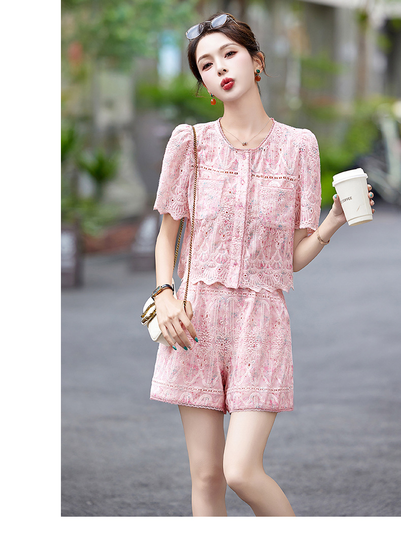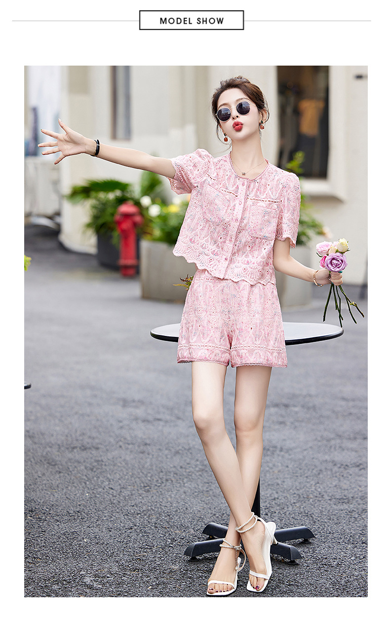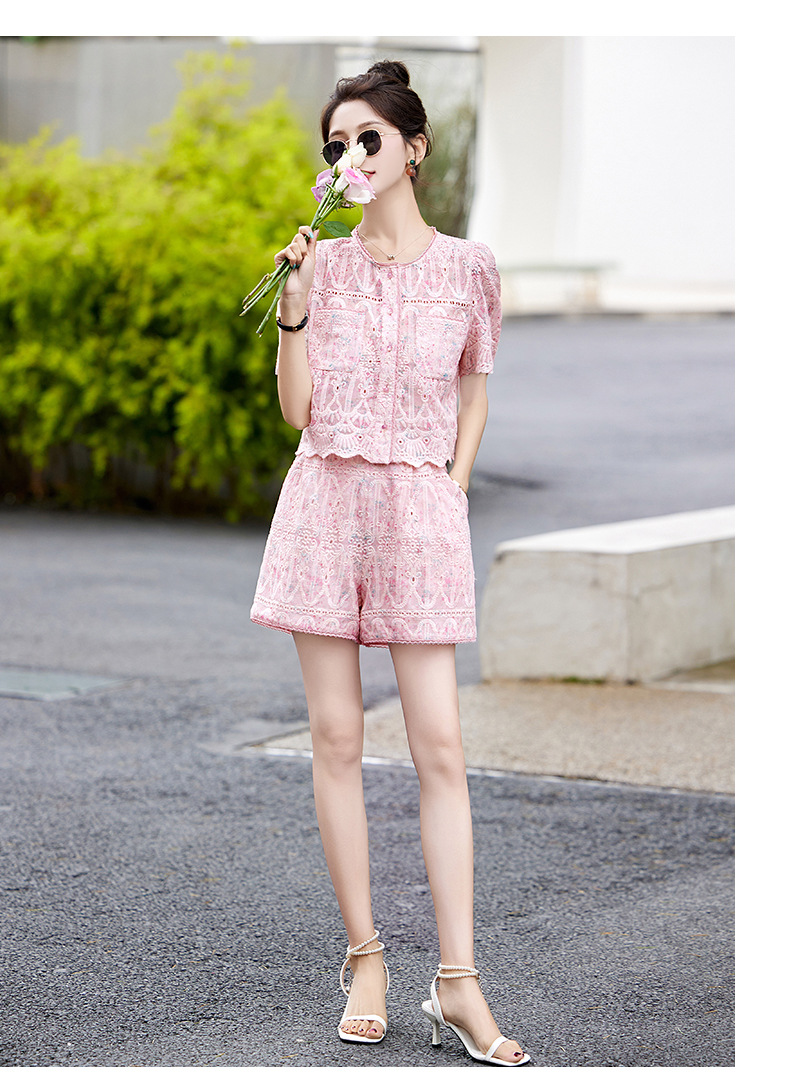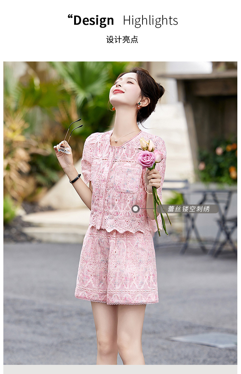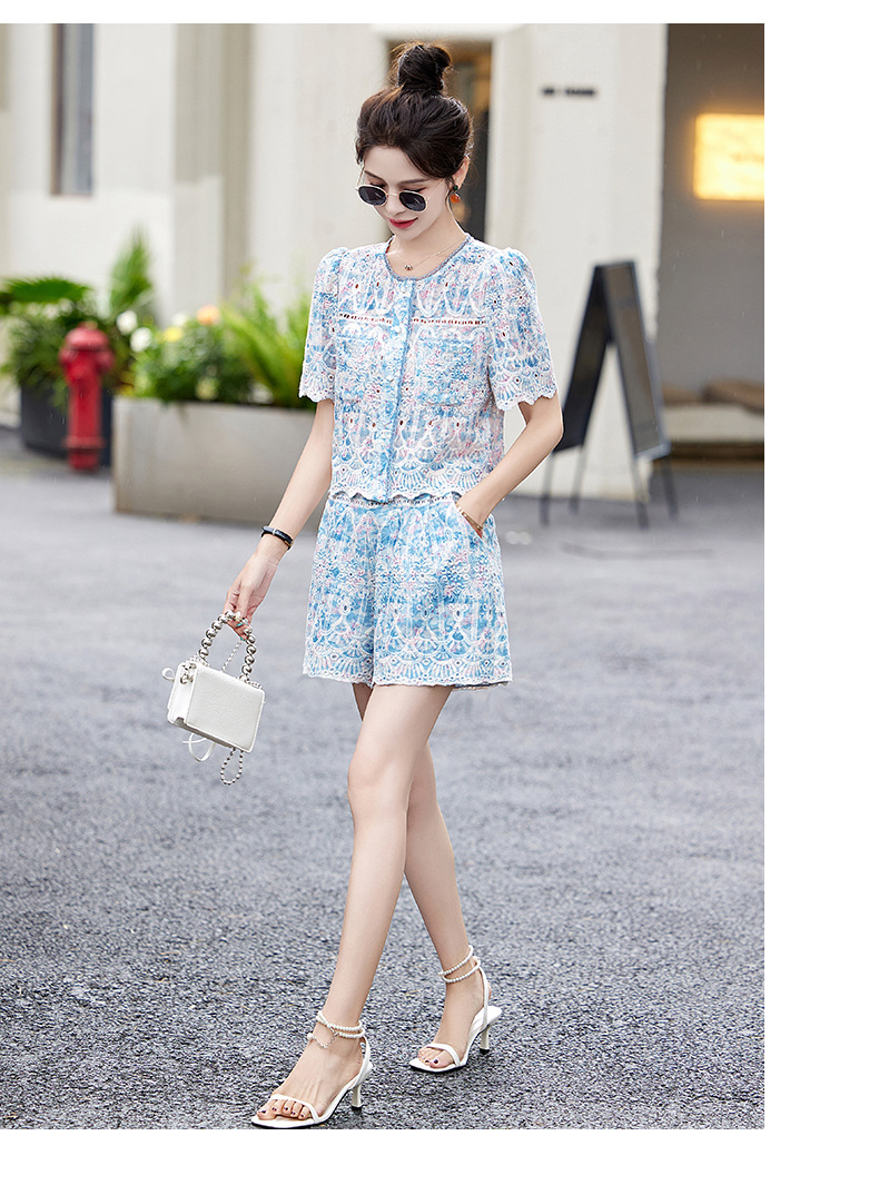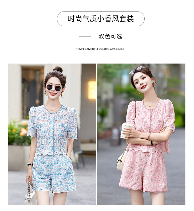 小香风时尚蕾丝,镂空刺绣上衣短裤两件套HR-CPYY8071