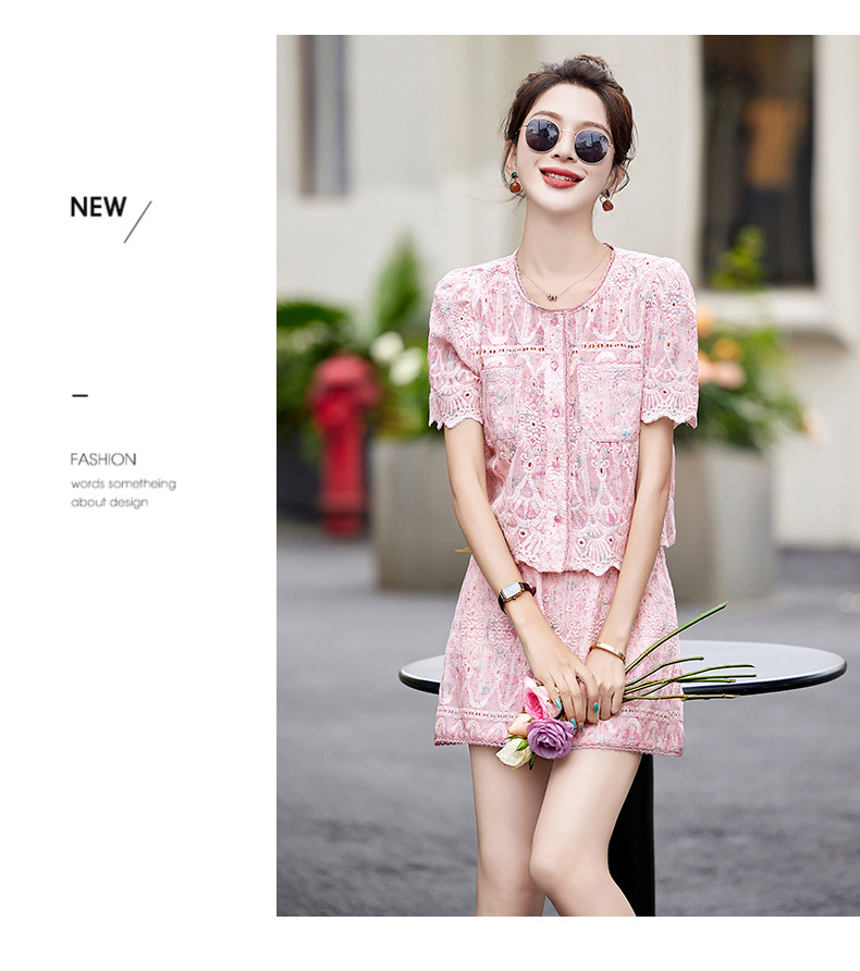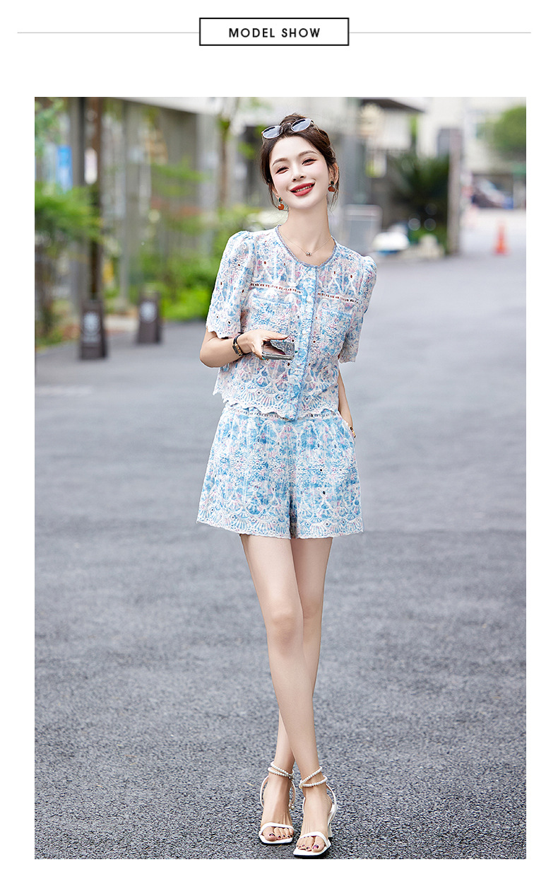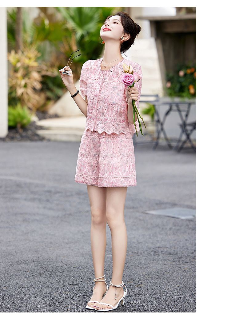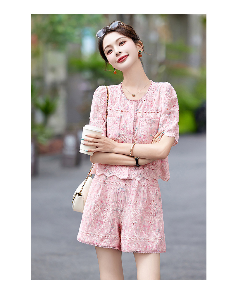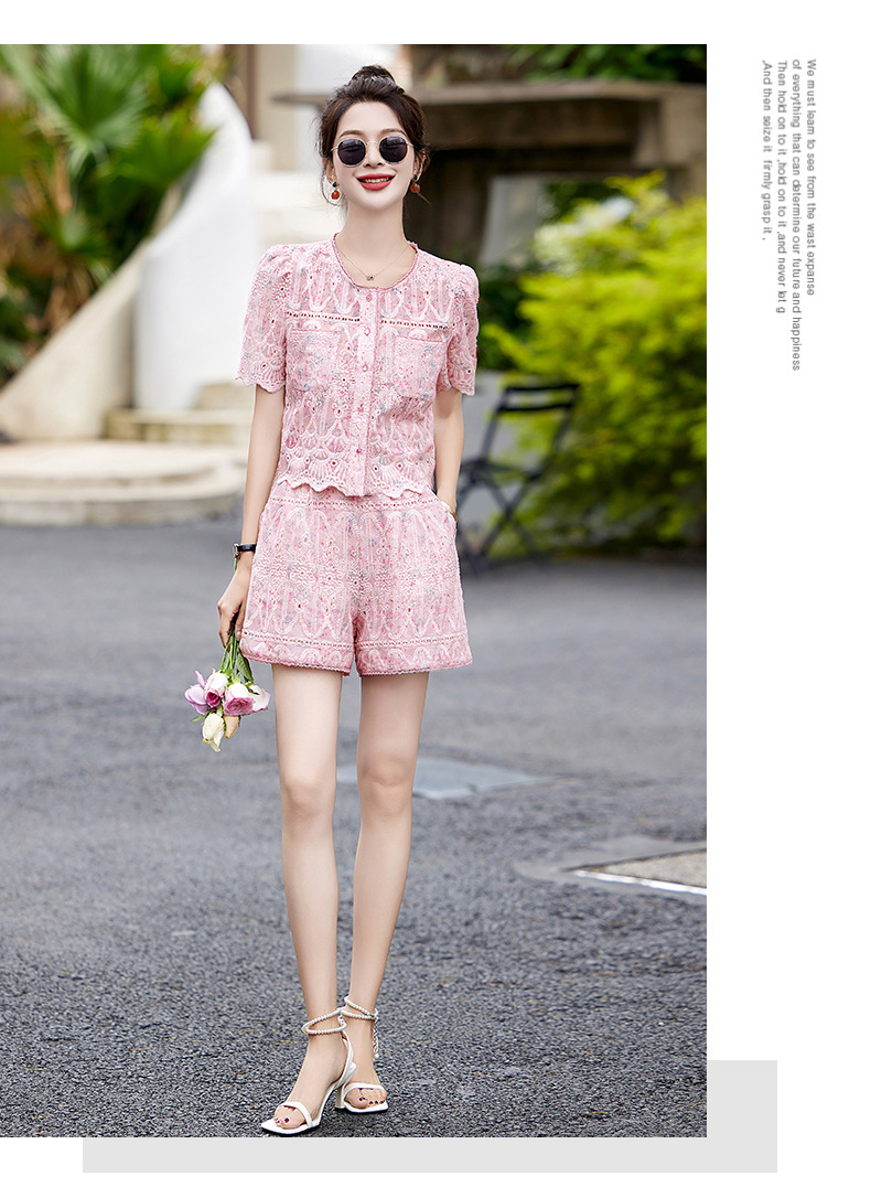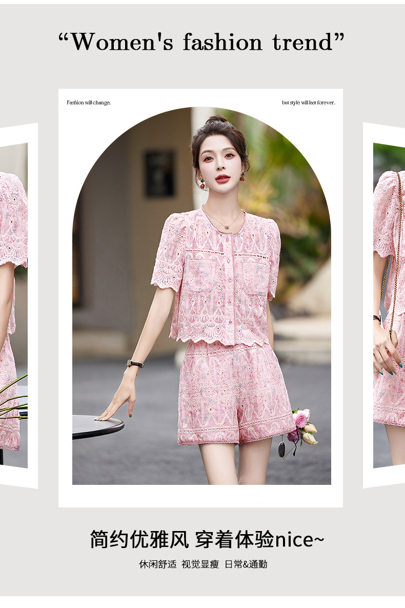 小香风时尚蕾丝,镂空刺绣上衣短裤两件套HR-CPYY8071