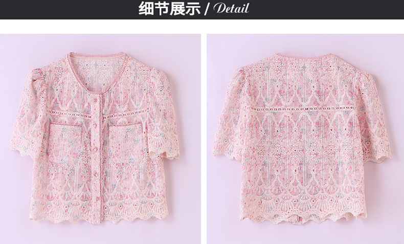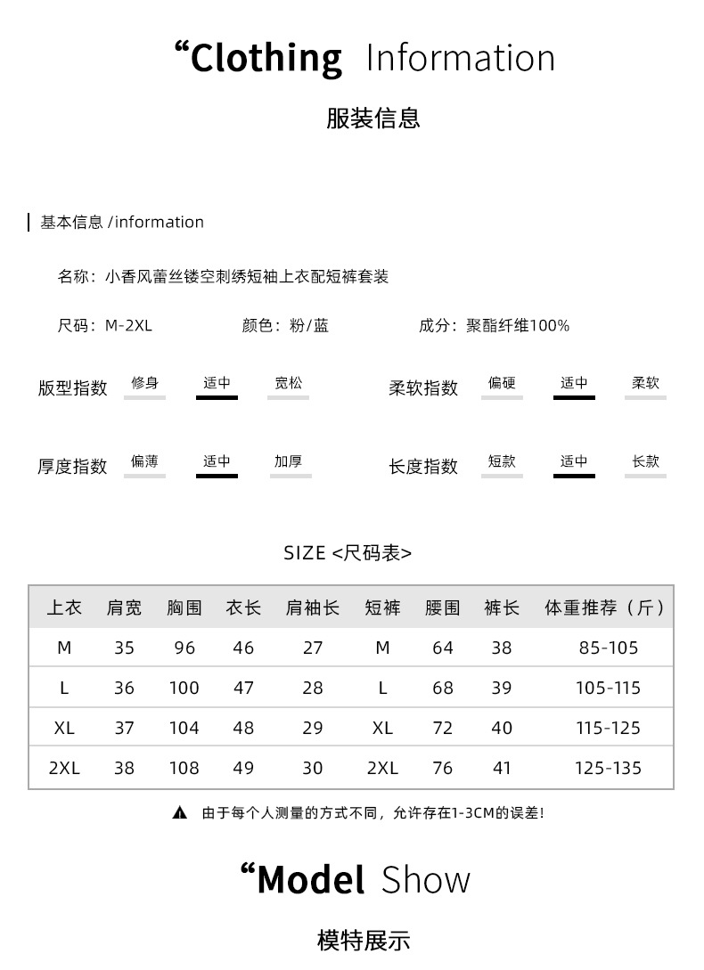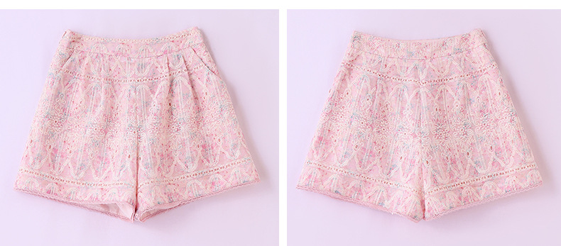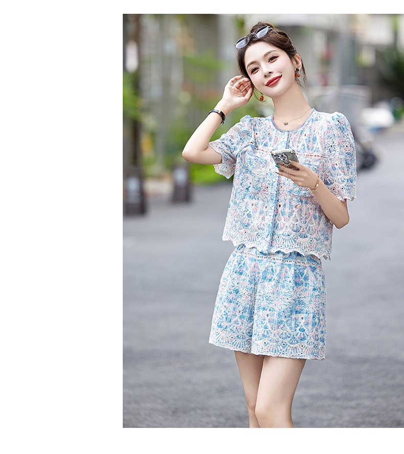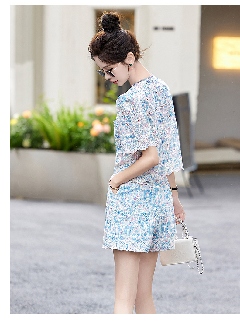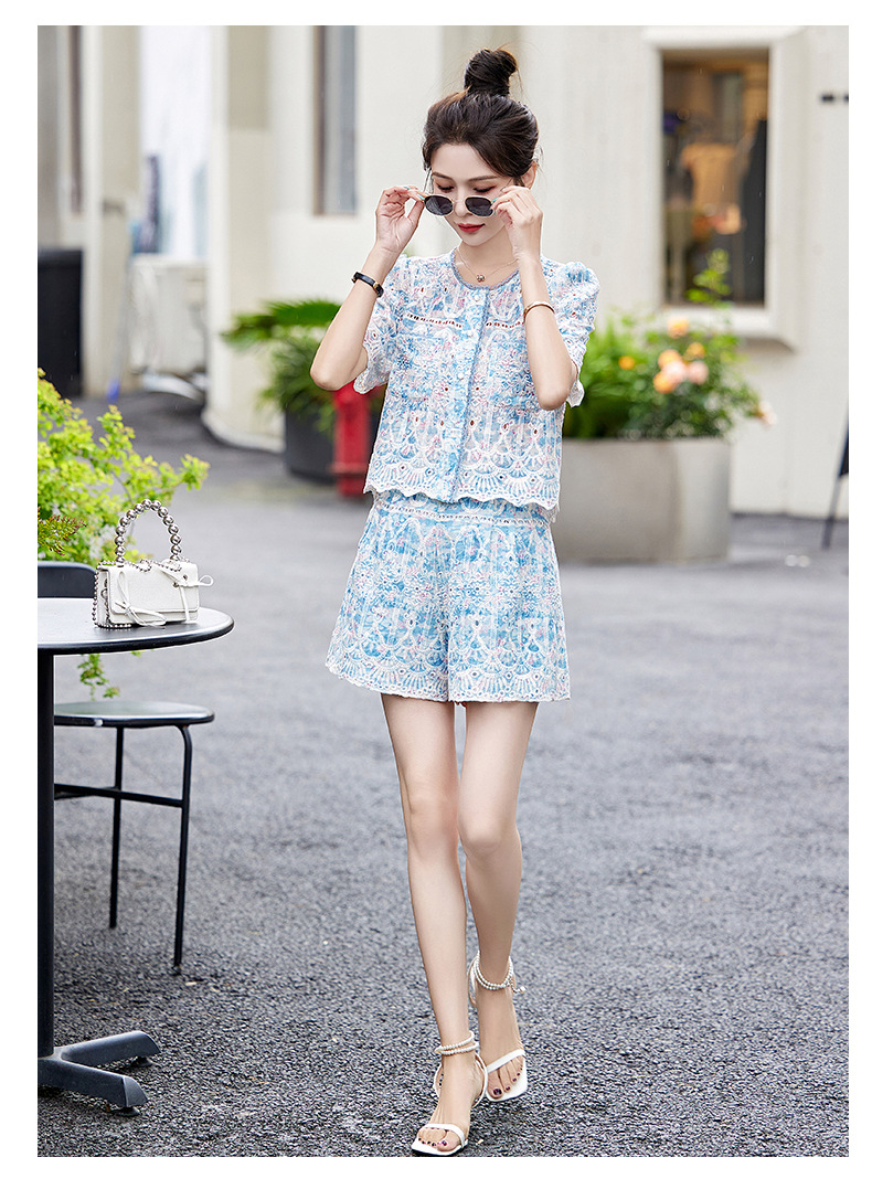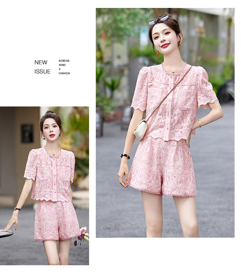 小香风时尚蕾丝,镂空刺绣上衣短裤两件套HR-CPYY8071
