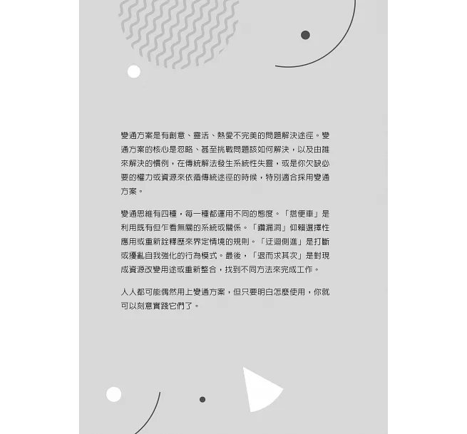 1. 我們常聽到做事要靈活變通,但怎麼靈活變通?很多人都是誤打誤撞、靈光一閃找到變通做法。本書作者對於「變通」做了大量研究與實地調查,開創性地將變通概念系統化,是市面上變通主題的著作少有的。