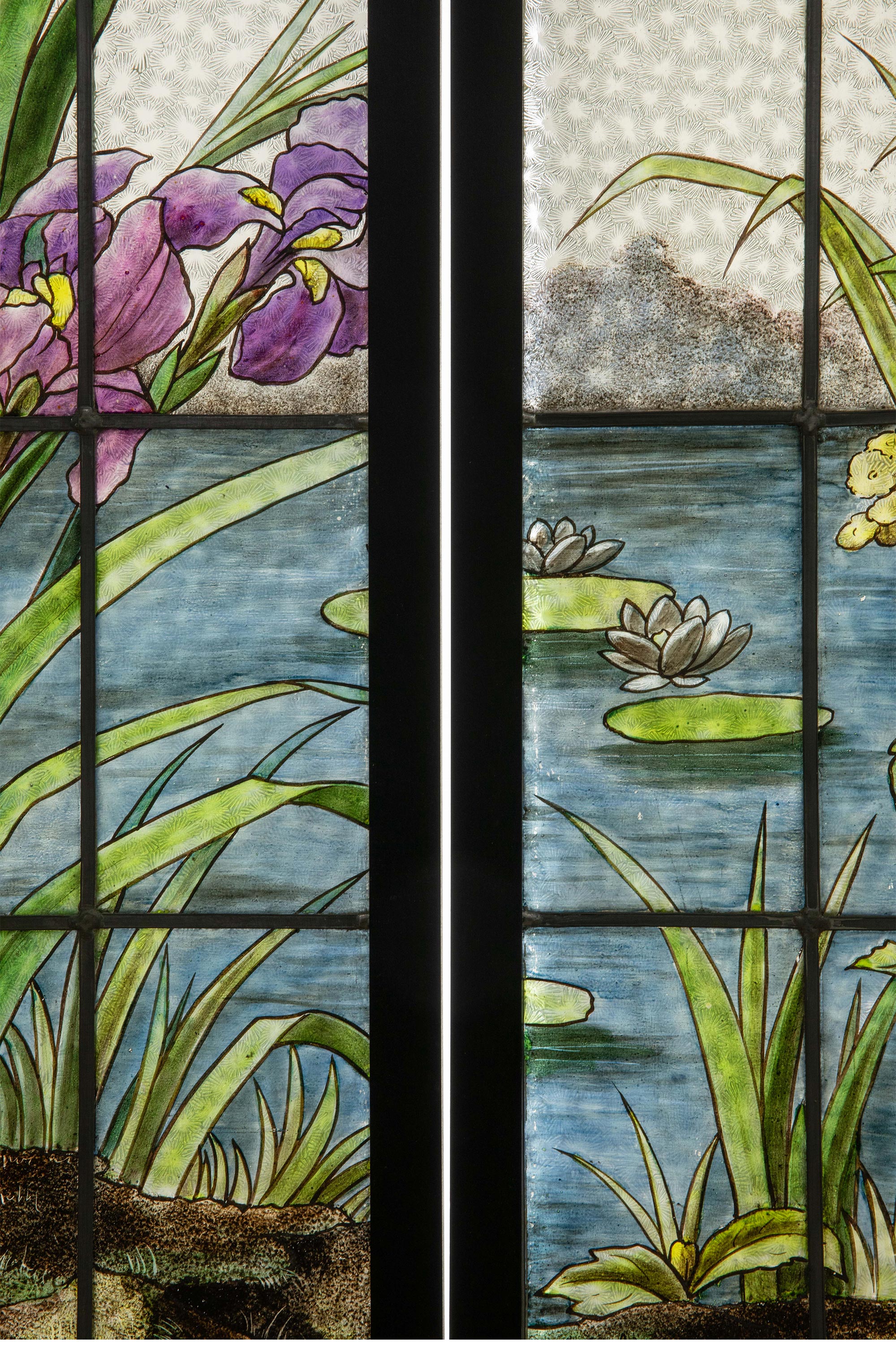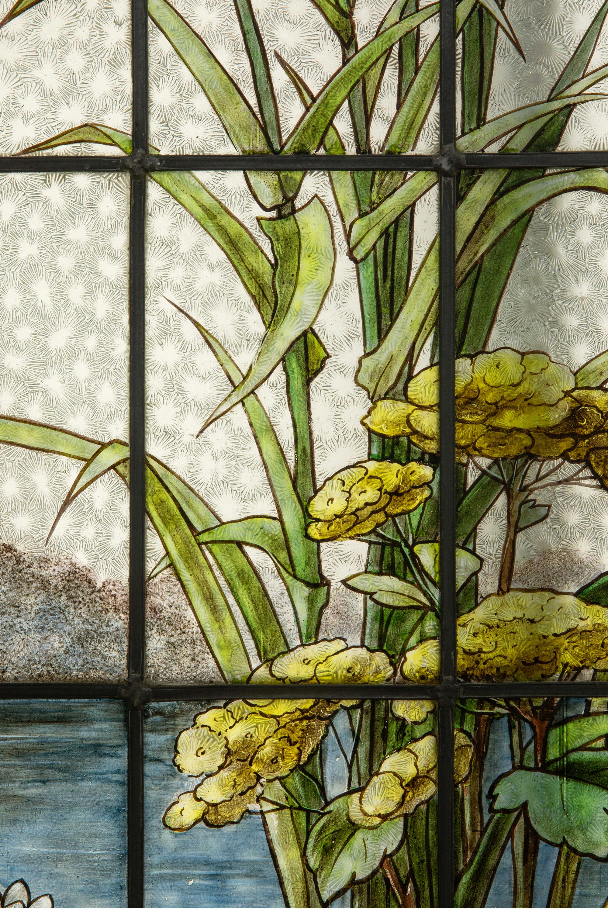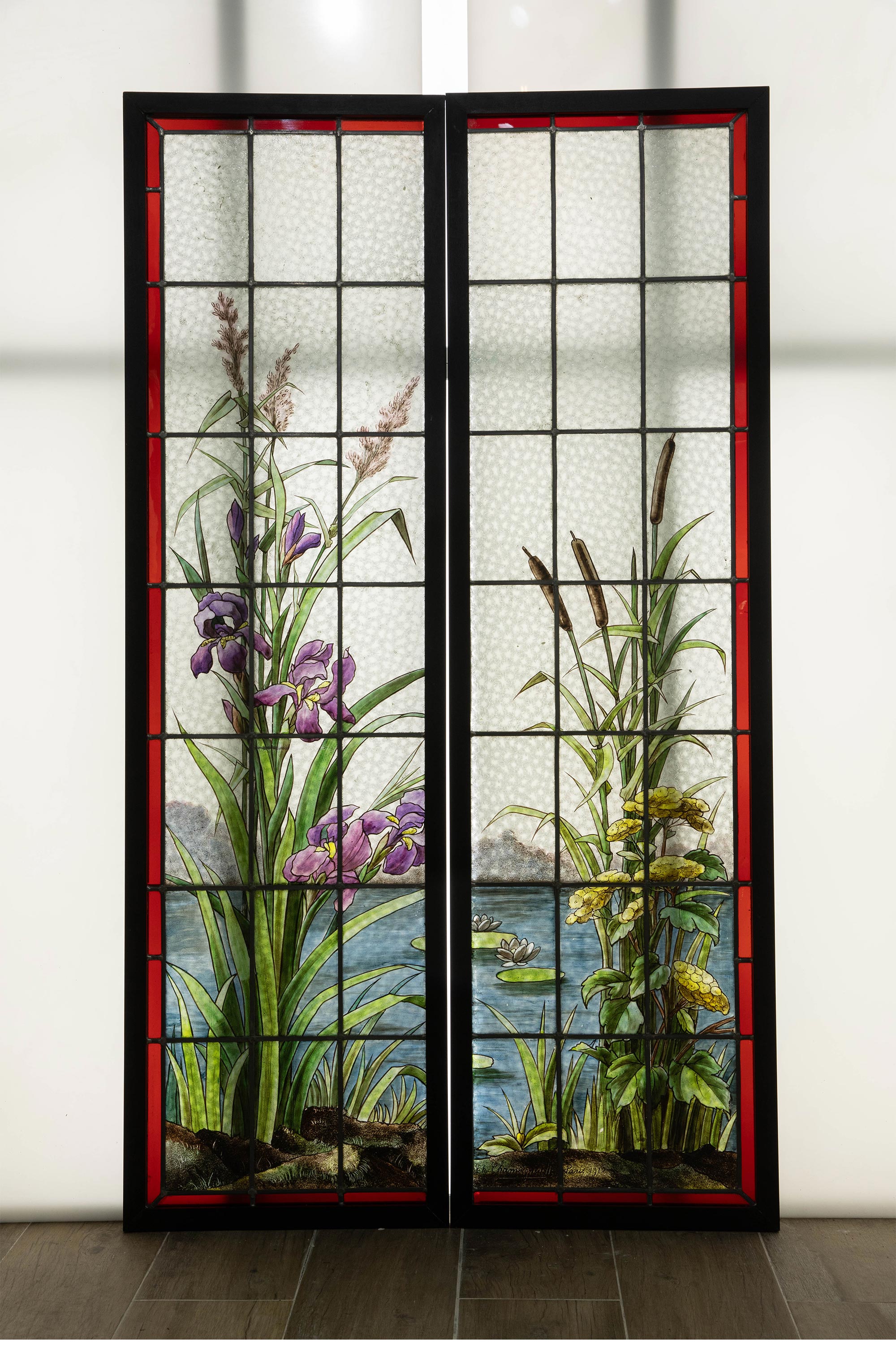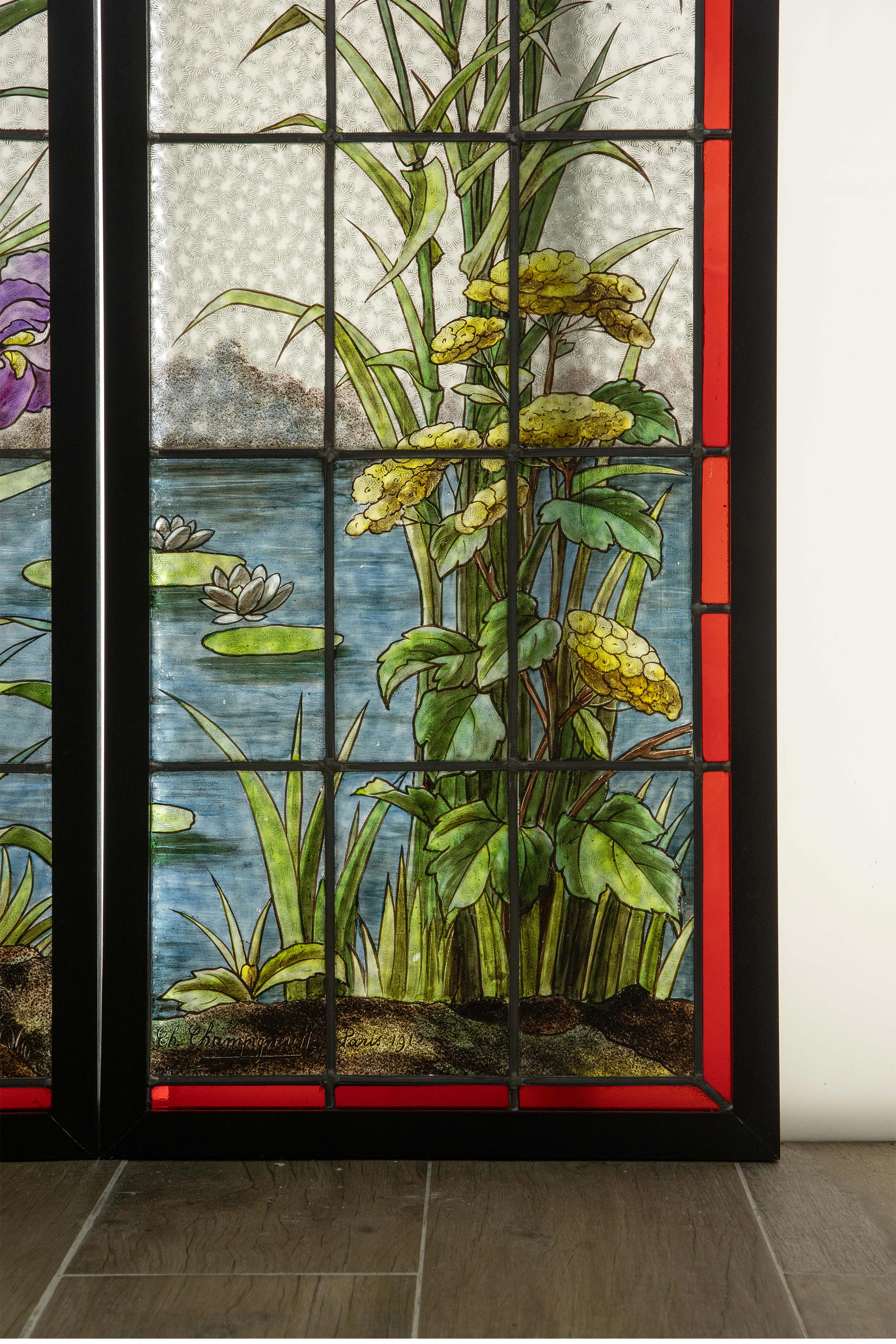 1910年代法国新艺术风格时期著名工坊Ch. Champigneulle签名出品水岸风光主题彩绘玻璃花窗一对