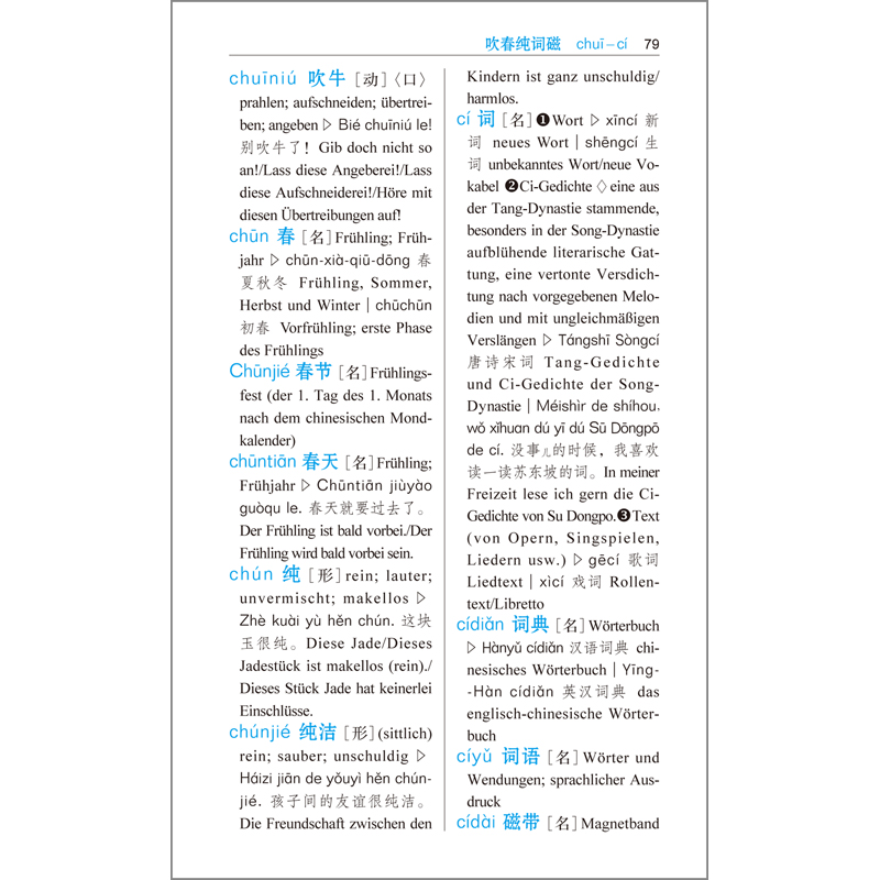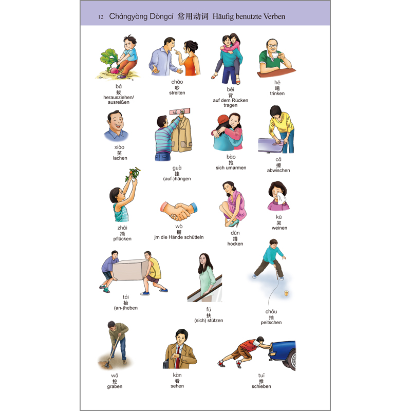 《汉语小词典》(德语版)是一部初阶汉德-德汉双向词典,主要为母语为德语的具有初级汉语水平的汉语学习者编写。全书汉德部分收词4000余条,包含了《HSK考试大纲》和中国国家语委颁布的《现代汉语常用词表》中的高频词。德汉部分收词3800余条,均为德语中的核心词、基本词和常用词。例词和例句均标注汉语拼音,用例遵循典型性、精简性、实用性和时代性原则,提供多种译法,注重口语,力求使读者易于理解、记诵、模仿。本词典还精选《汉字书写笔顺规则》《中国历代纪元简表》《中国行政区划简表》等作为附录。此外还配画了百余幅精美插图,可使读者更轻松、直观、清晰地理解相关字词的含义和用法。