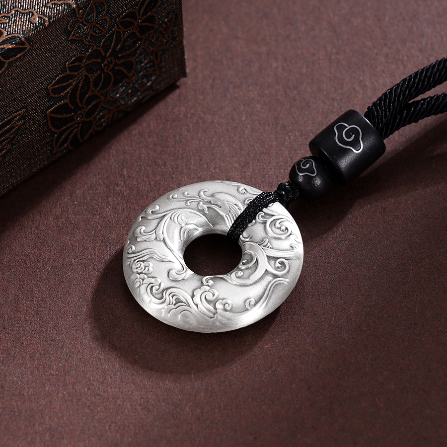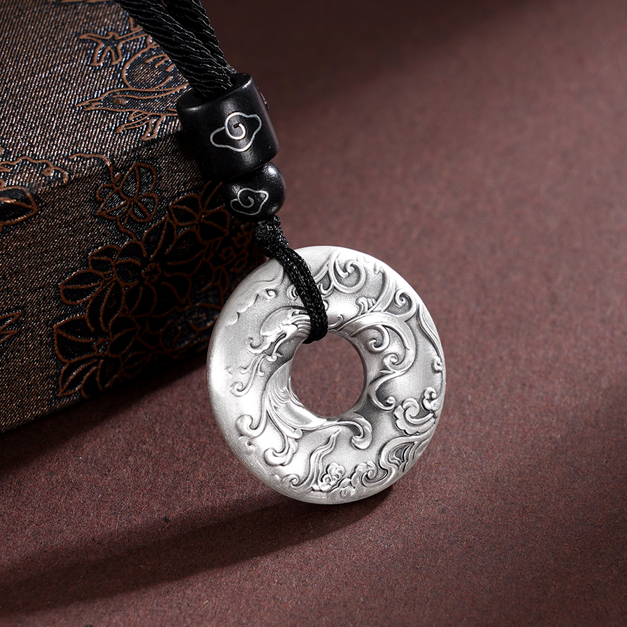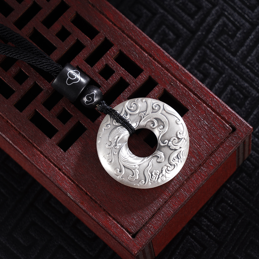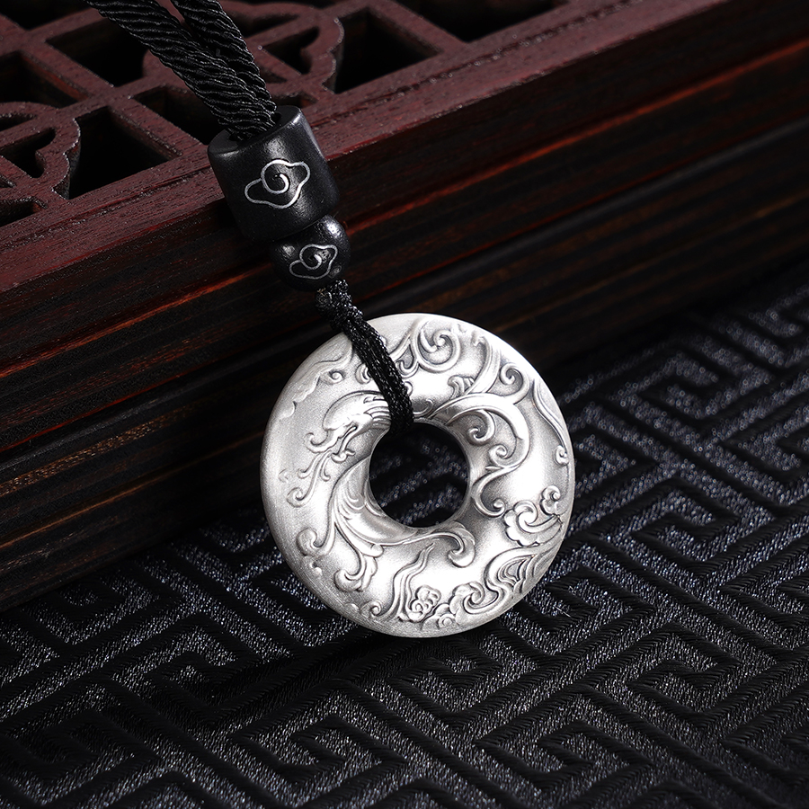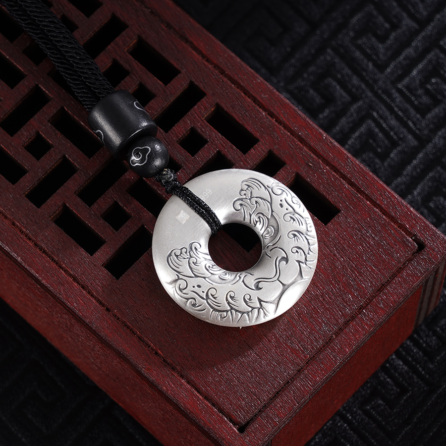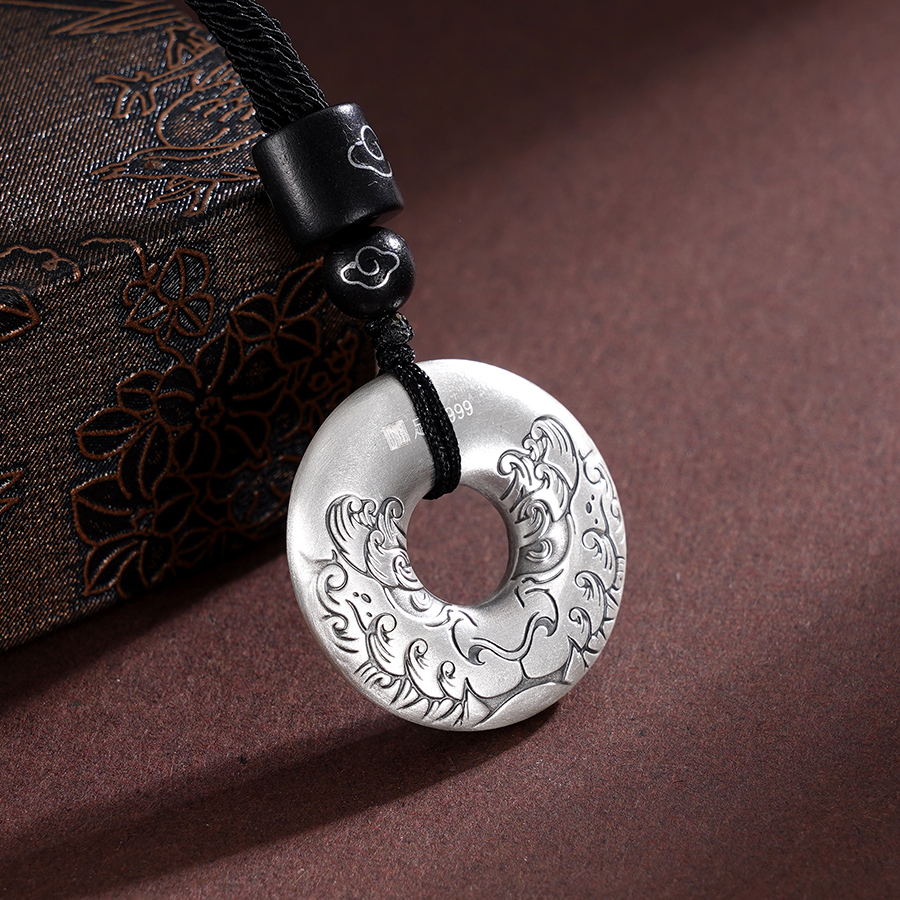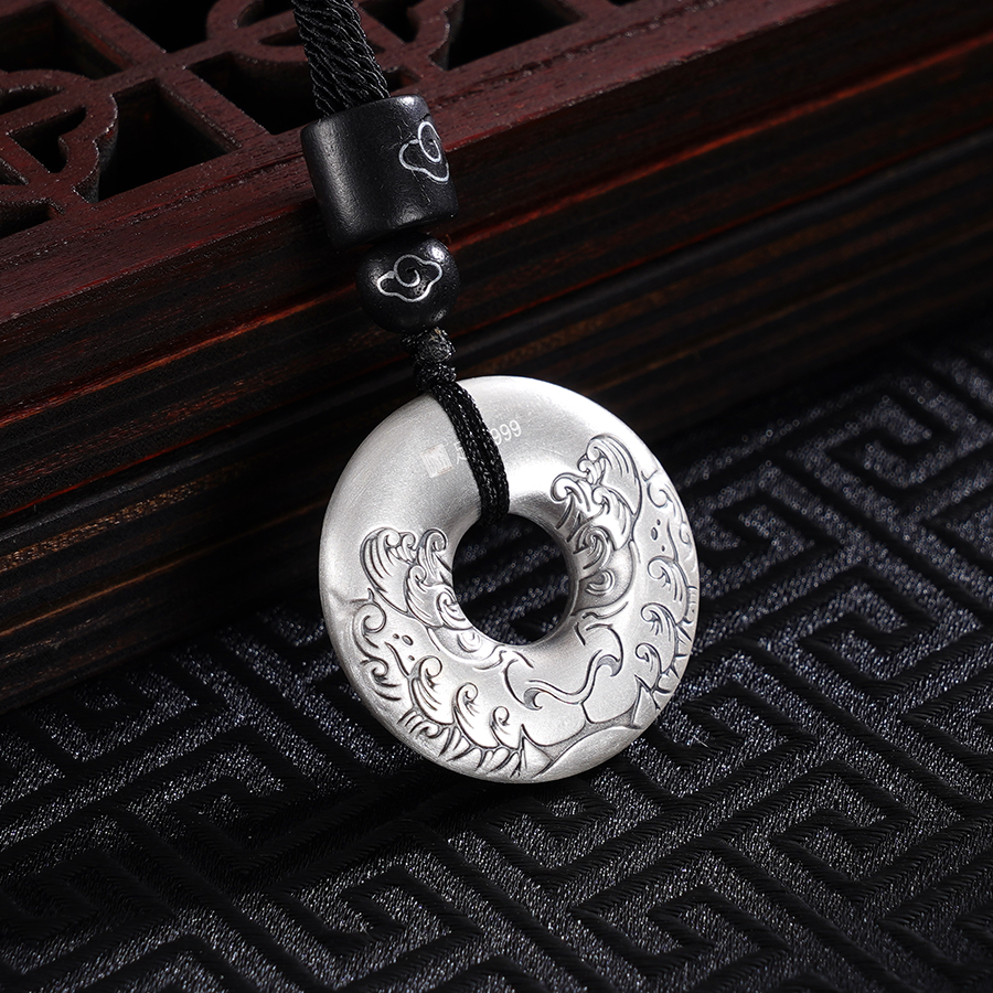 【寓意】:平安扣吊坠造型其正面錾刻了水波花纹纹,并采用仿古工艺塑造深不见底之感。背面浮雕一条深海神龙,栩栩如生,彰显出威严与神秘。整体造型简洁大方,富有深意。寓意扣住平安,迎接吉祥。