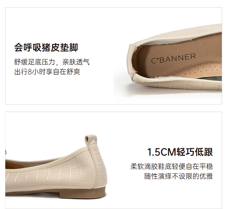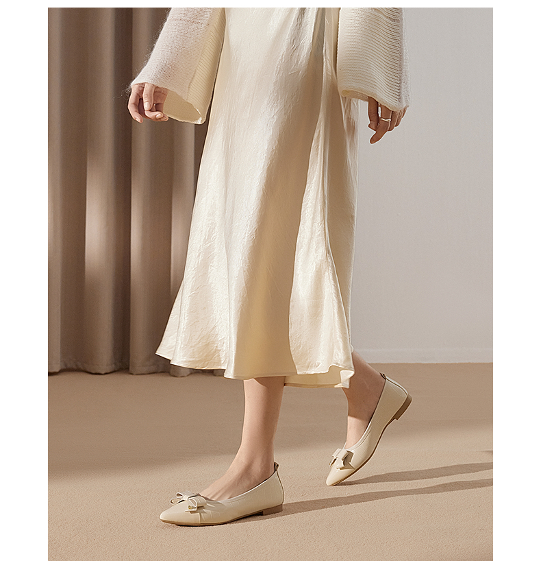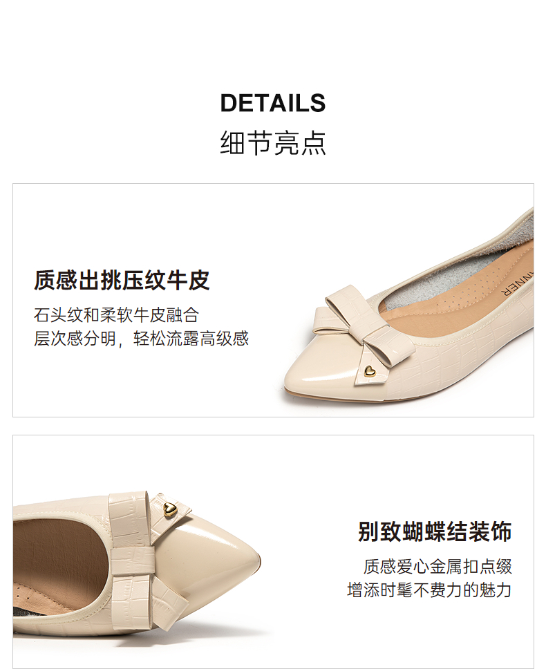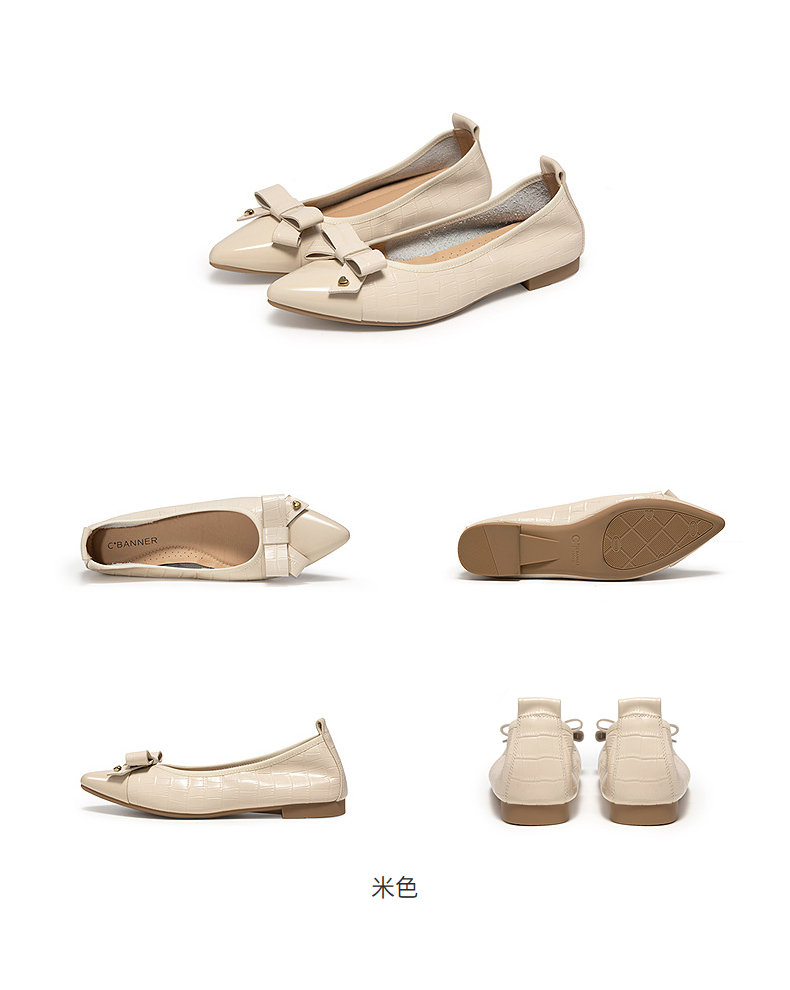 千百度低跟蝴蝶结真皮浅口单鞋女款小香风晚晚平底鞋A25181315