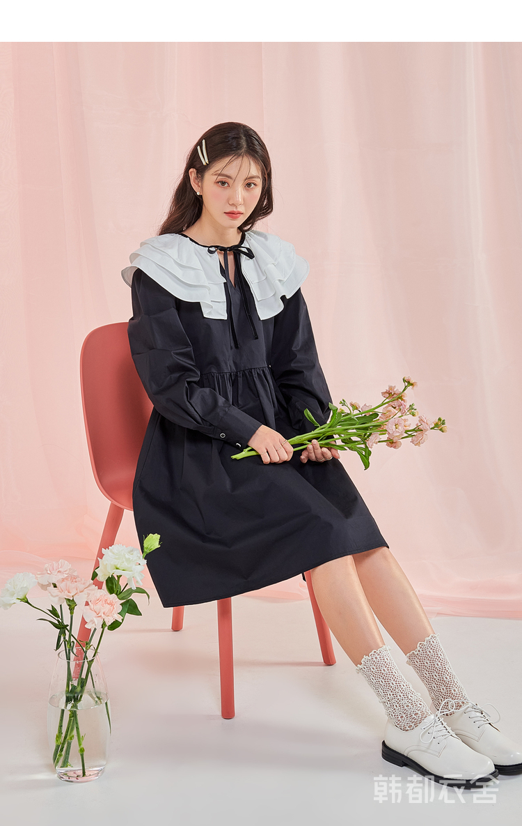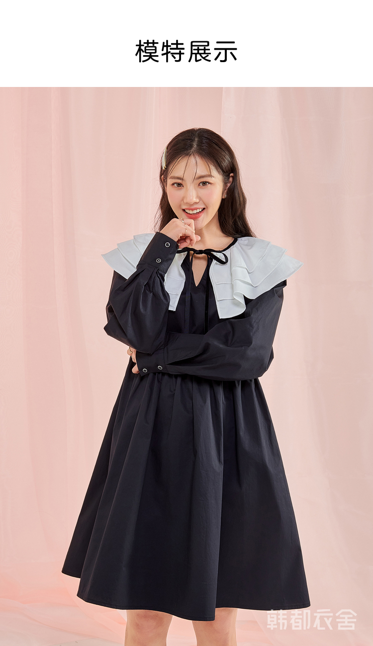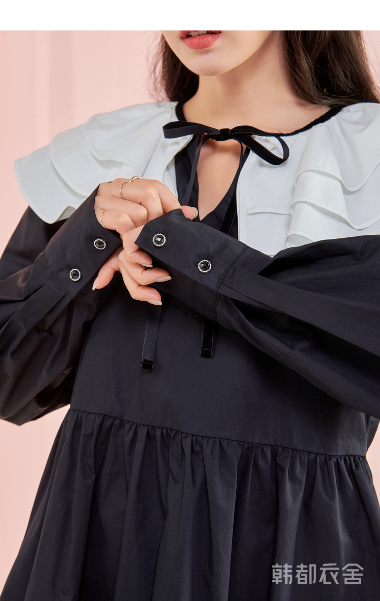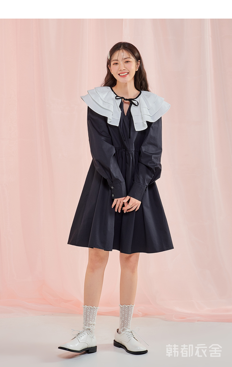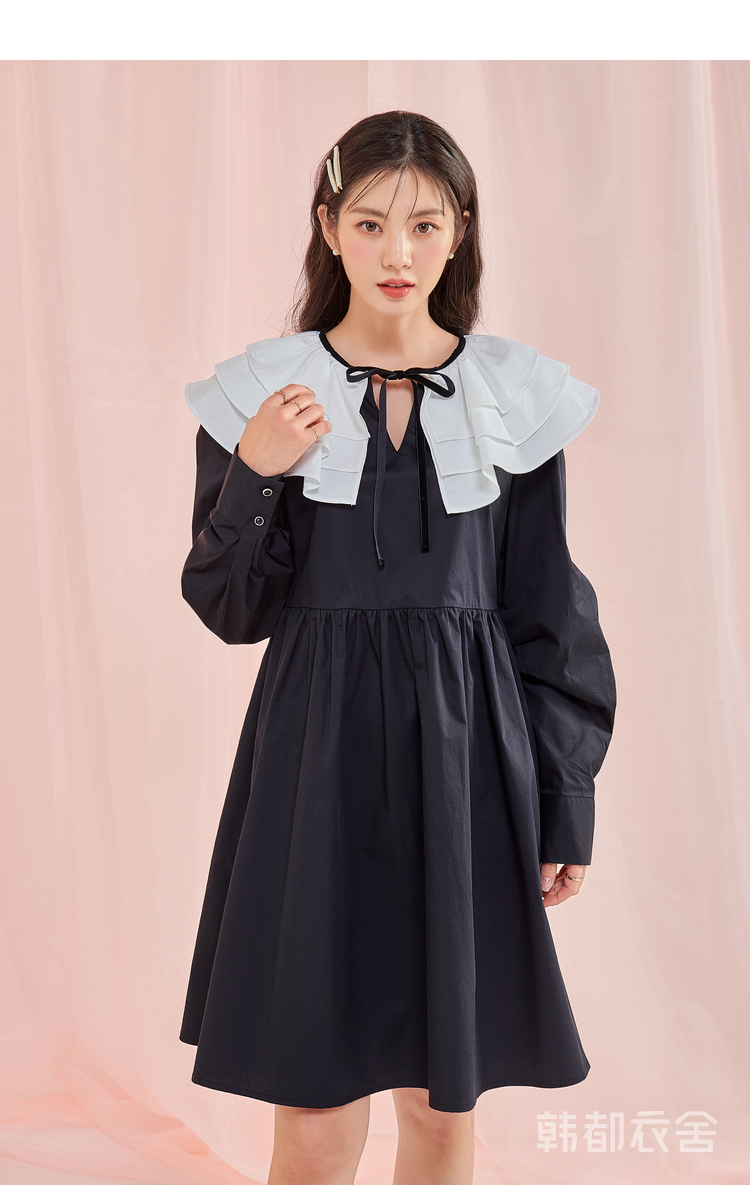 韩都衣舍冬季新款小黑裙荷叶领高腰宽松连衣裙女OM83049