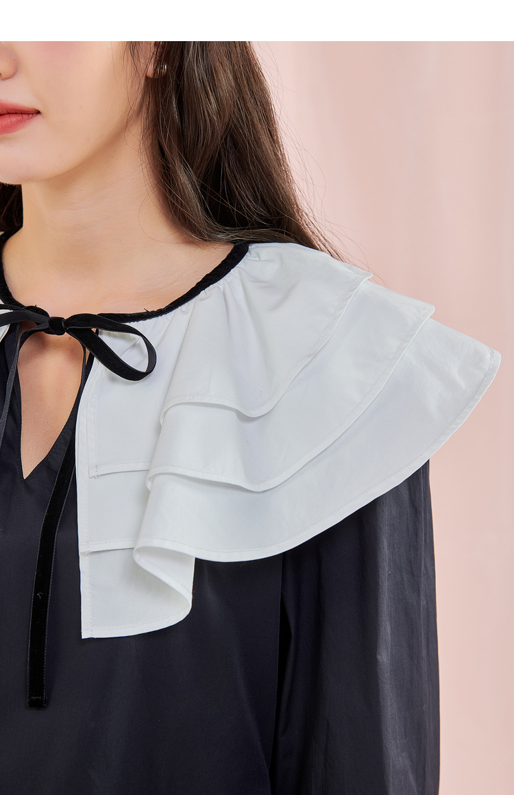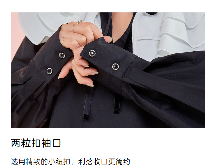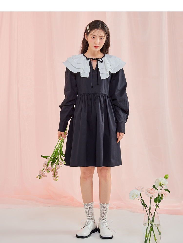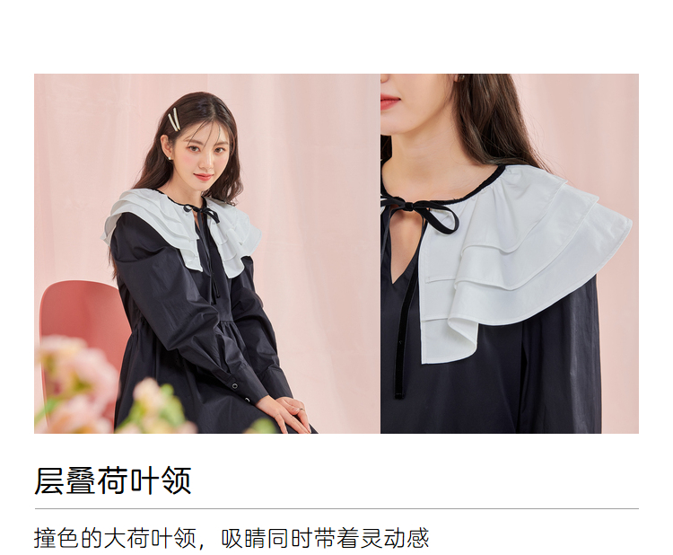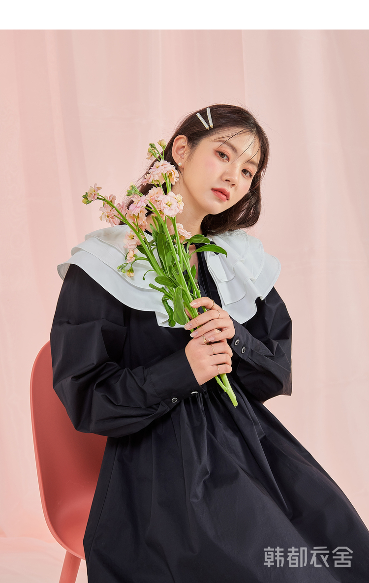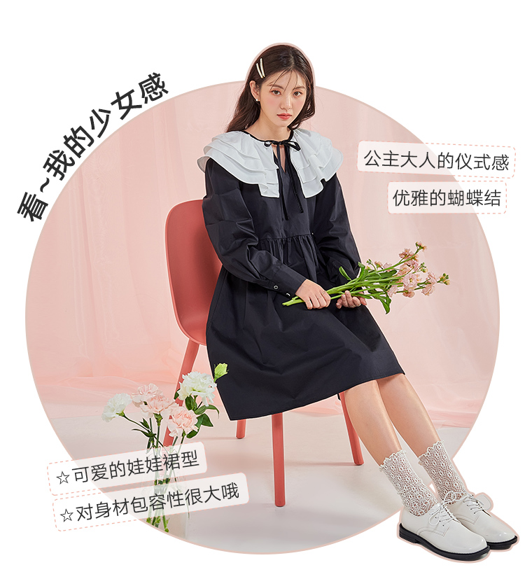韩都衣舍冬季新款小黑裙荷叶领高腰宽松连衣裙女OM83049