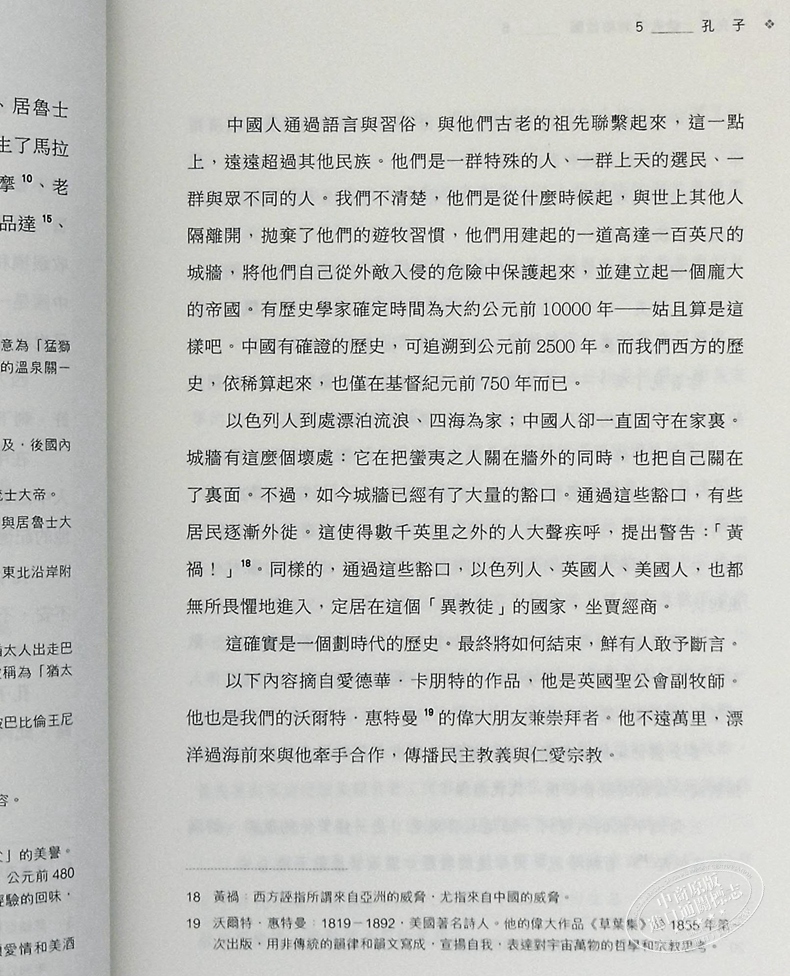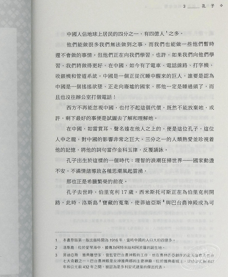 掩卷沉思,我不得不說由於這本書出版於1916年,距今已有一百多年了,加之涉及的面很廣,有些觀念、思想、資料和對某些人物和事件的評價,隨著時代的變遷難免會與我們的了解和掌握的有所不同。就孔子一章而言,由於我們大家對我們自己的國家和孔子都比較熟悉,較容易發現兩者之間存在的一些差异。最明顯的例子是書中引用了英國一位名叫愛德華·卡朋特牧師寫的一大段話,用抒情的筆法和優美的文字,把當時的中國描寫成了一個“世外桃源”或“伊甸園”。實際上,百年前的中國慘遭帝國主義列强的侵略和蹂躪,政府腐敗,內戰不絕,民不聊生。他的描述與實際情况不盡相符。書中還存在其他的一些問題和不足,但瑕不掩瑜,這是一本值得向讀者,特別是對教育問題有興趣的朋友們推薦的好書。最後,我想我們還應該感謝兩位譯者,他們不辭辛苦,精心翻譯,反覆修改,把它呈獻給我們。
