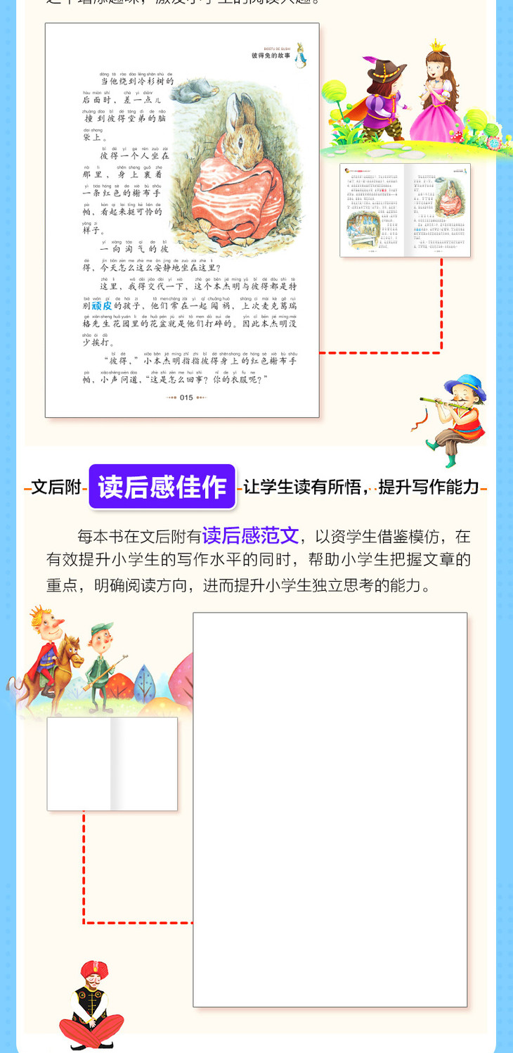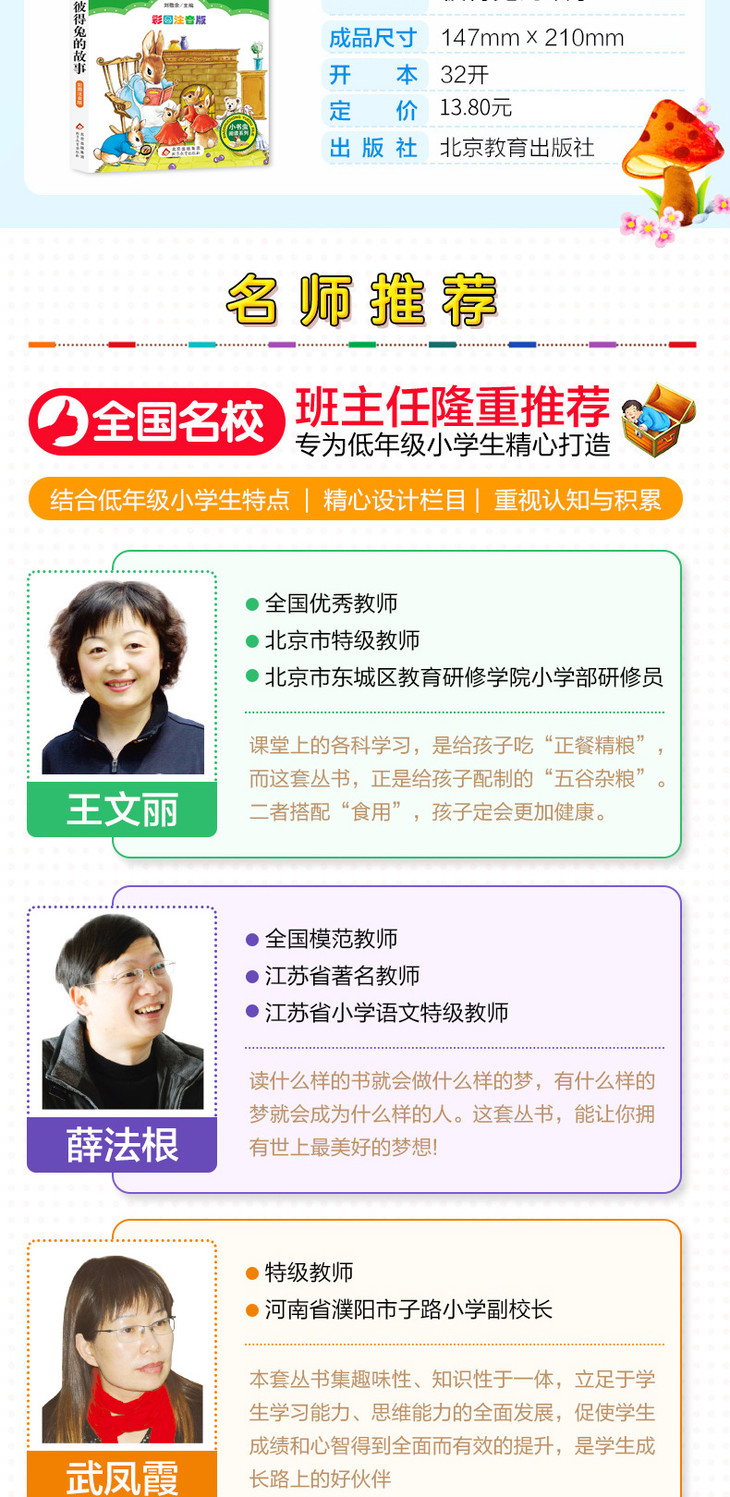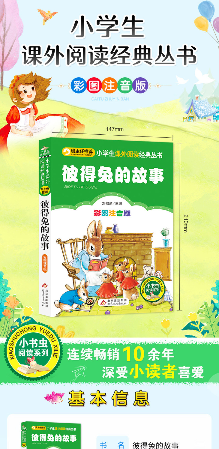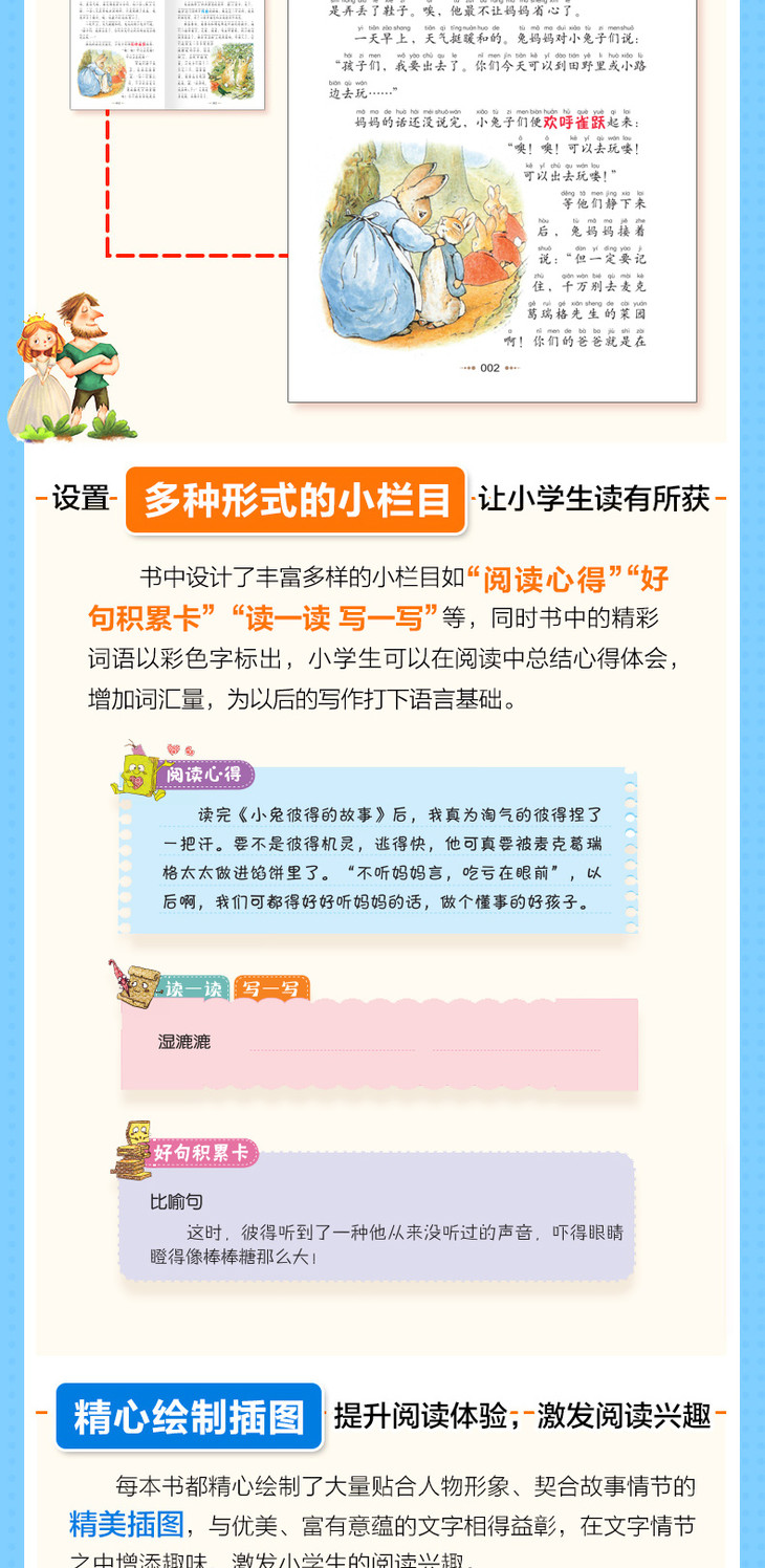 《得兔的故事(彩图注音版)/小学生语文必读丛书彼》以波特女士作品中知名的几种小动物形象为主角,调皮的小兔彼得、不懂礼貌的小松鼠纳特金、钓不到鱼的青蛙杰里米、爱干净的点点鼠夫人、搞笑的水鸭杰迈玛、助人为乐的刺猬夫人、捣蛋鬼小猫汤姆……它们演绎了一个又一个有趣的故事。这些故事生动活泼、质朴单纯,并意味深长,是小学生课外阅读读物。