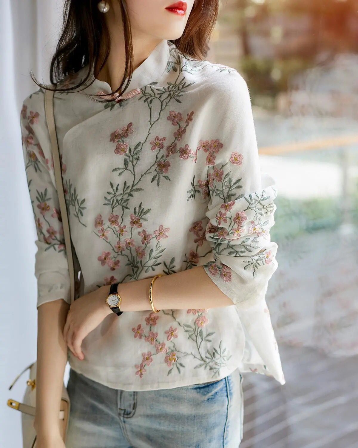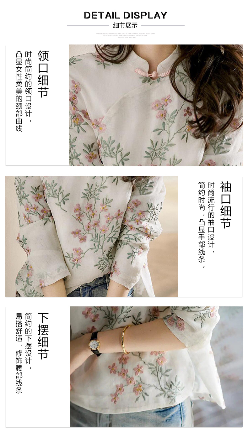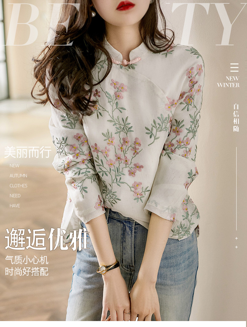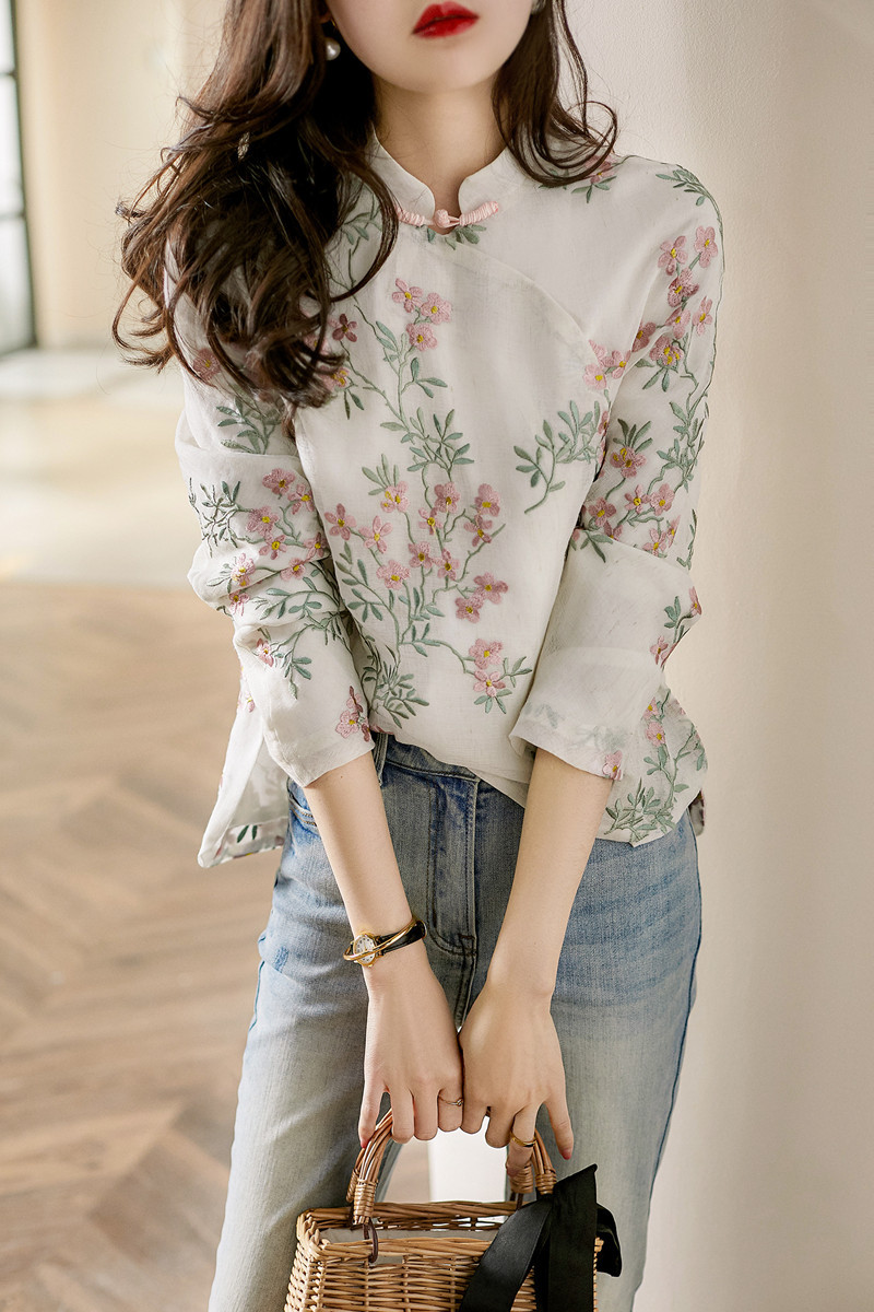 中式改良旗袍上衣桃花衫复古盘扣长袖印花衬衫女 YX7052