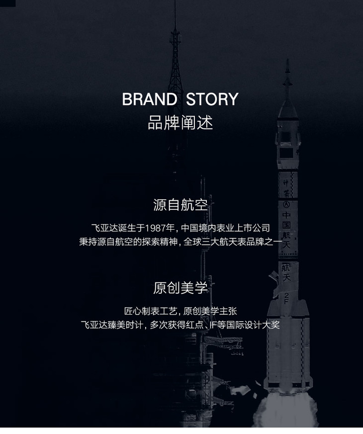 飞亚达表秉持源自航空的超精密工艺,飞亚达以专业与美感兼具的腕表设计,演绎对“飞”的艺术化探索,诠释非凡向上的品牌风范,讲述“一旦拥有,别无所求”的故事。
