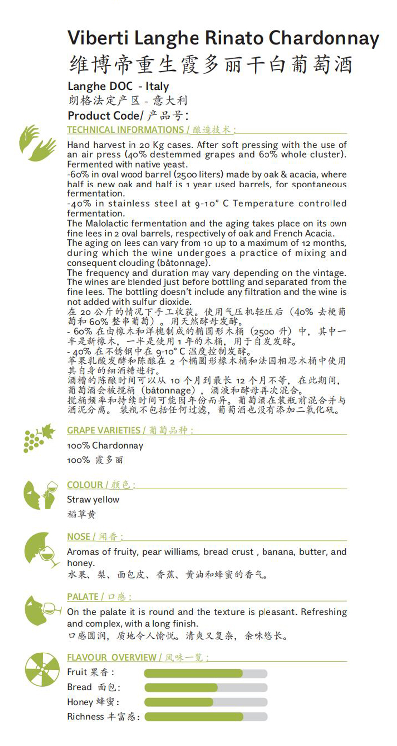 Viberti Langhe Rinato Chardonnay 维博帝重生霞多丽干白葡萄酒
