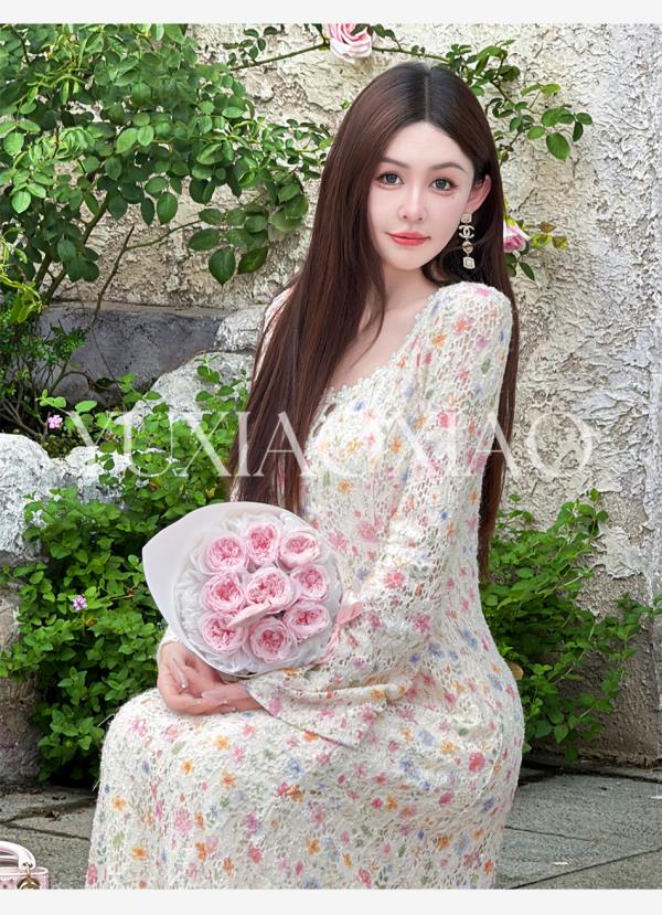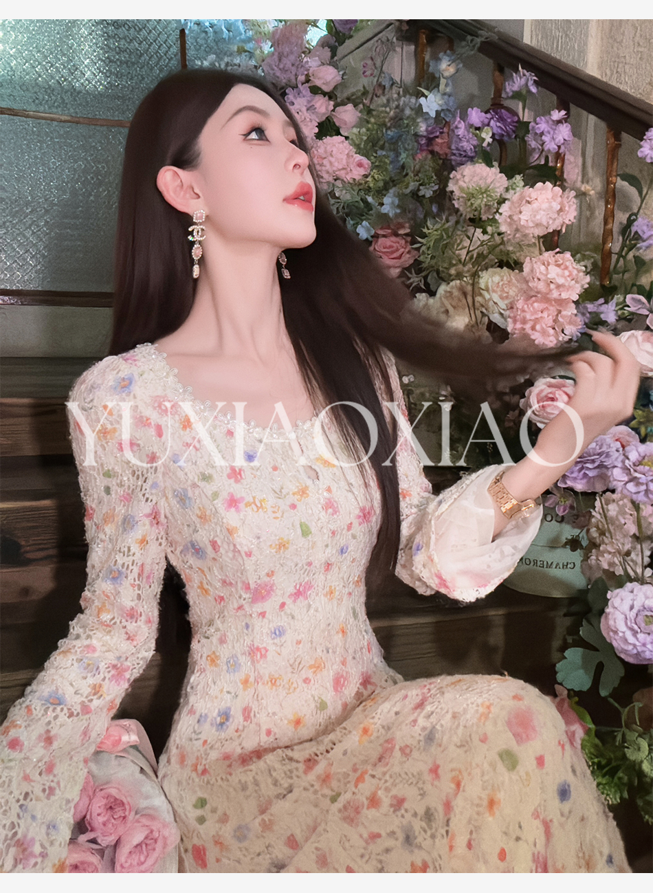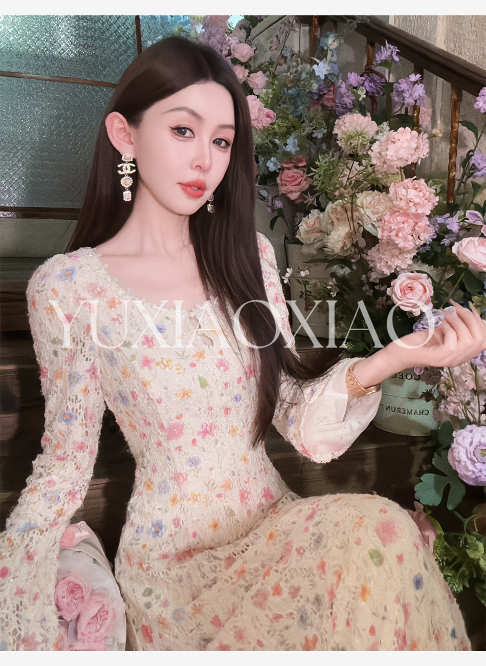 余潇潇【梦境花神】浪漫拼蕾丝花边花卉印花高弹力长袖收腰连衣裙