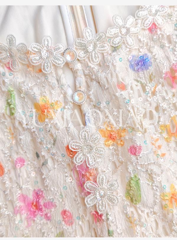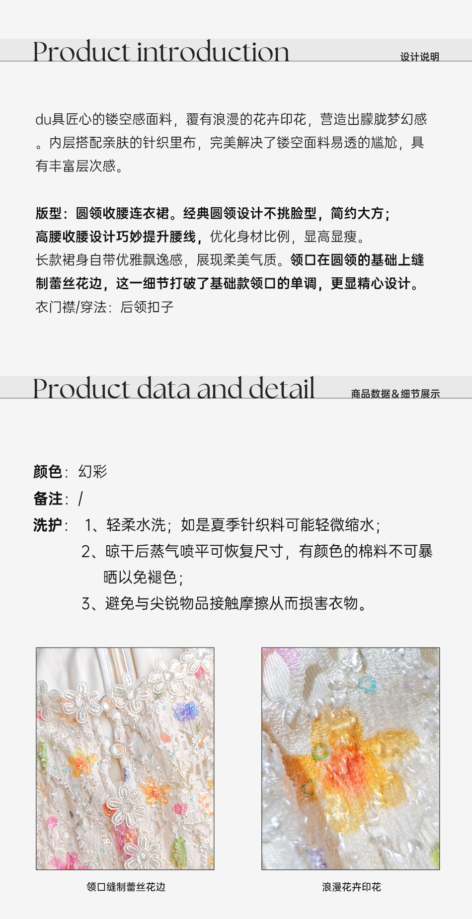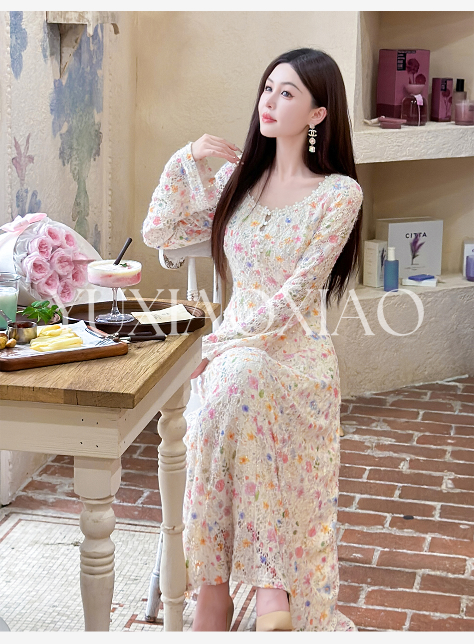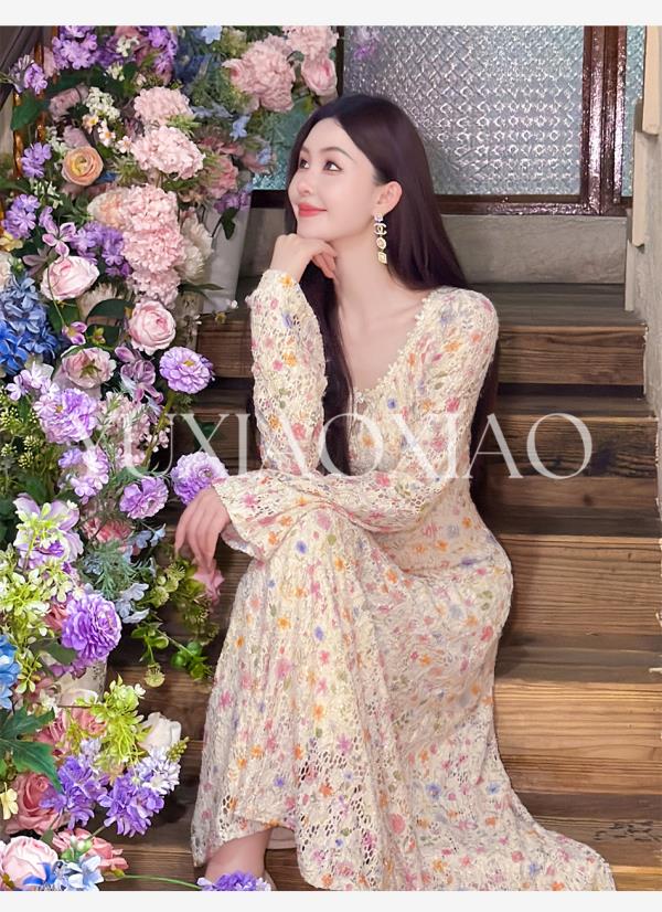 余潇潇【梦境花神】浪漫拼蕾丝花边花卉印花高弹力长袖收腰连衣裙