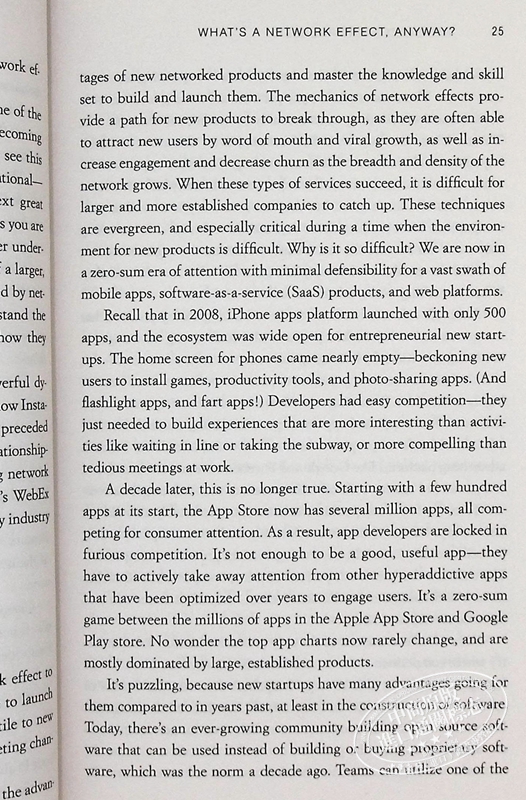 尽管软件已经变得更容易建立,但推出和扩大新产品和服务仍然很困难。初创企业在进入技术生态系统时面临严峻的挑战,包括激烈的竞争、模仿者和无效的营销渠道。推出新产品的团队必须考虑 "网络效应 "的优势,即一个产品或服务的价值随着更多用户的参与而增加。苹果、谷歌、微软和其他科技巨头都在利用网络效应,大多数科技产品都包含了网络效应,不管是信息应用、工作场所协作工具,还是市场平台。网络效应为刚起步的产品提供了一条突破之路,通过病毒式增长和口碑传播吸引新用户。