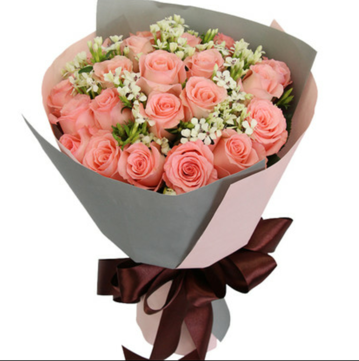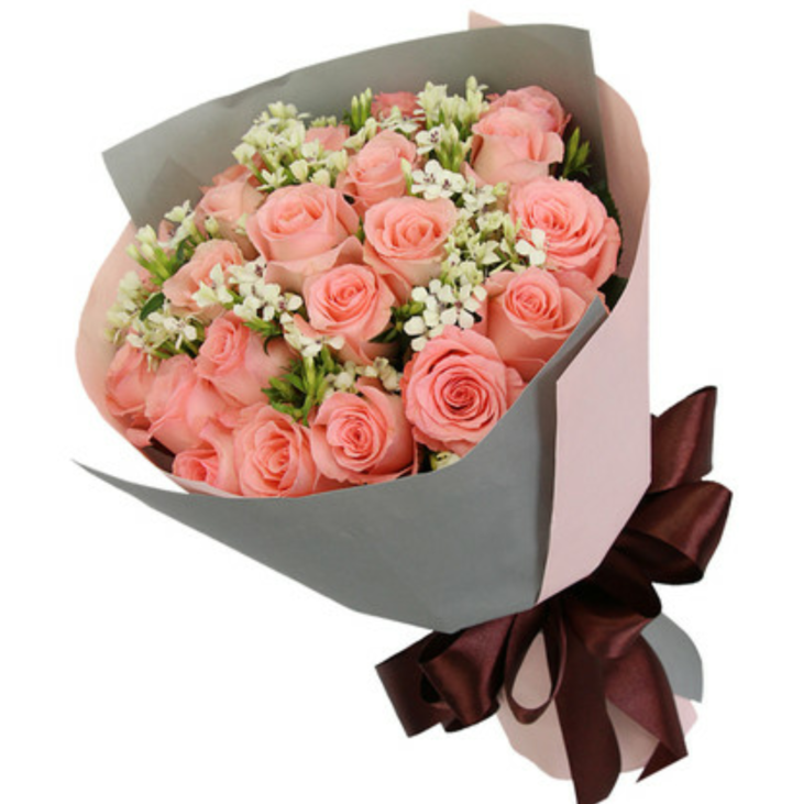 咖啡色心情--香槟玫瑰9枝,填充适量石竹梅、黄莺 米黄色不织布,英文报纸,咖啡色缎带花结(1142)