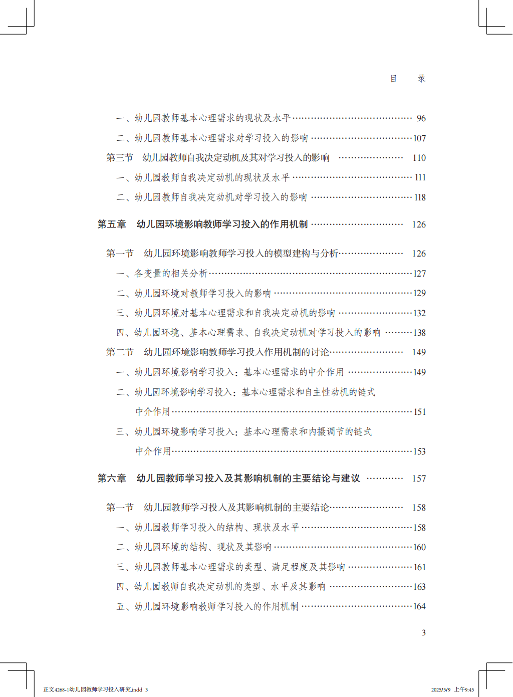 本书共六章。第一章为幼儿园教师学习投入的理论概述,分析了幼儿园教师学习投入这一选题产生的理论和现实背景,对教师学习和学习投入的相关研究成果进行了综述,阐明了幼儿园教师学习投入、幼儿园环境、幼儿园教师基本心理需求、幼儿园教师自我决定动机等核心概念,提出了本研究要着力解决的主要问题。第二章为理视角与研究设计,明确了本研究的理论基础是自我决定理论,并基于该理论提出了幼儿园环境影响教师学习投入的过程机制设想,详细说明了本研究的研究对象、过程和方法,特别是问卷的编制和检验。第三章为幼儿园教师学习投入,分析了幼儿园教师学习投入的心理结构、总体状况、水平及不同背景变量下教师学习投入的差异。第四章为幼儿园教师学习投入的影响因素,从自我决定理论的视角揭示了教师学习投入的影响因素,分析了幼儿园环境、幼儿园教师基本心理需求和幼儿园教师自我决定动机的现状、水平,以及它们对教师学习投入的影响。第五章为幼儿园环境影响教师学习投入的作用机制,从自我决定理论的视角揭示了幼儿园环境、幼儿园教师基本心理需求、幼儿园教师自我决定动机作用于教师学习投入的过程机制。第六章为幼儿园教师学习投入及其影响机制的主要结论与建议,梳理了本研究的主要结论,基于实证研究结果,站在教师和幼儿园两个角度,从教师学习投入、基本心理需求、自我决定动机和幼儿园环境等层面提出促进幼儿园教师学习投入的有针对性的建议。