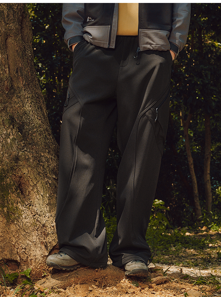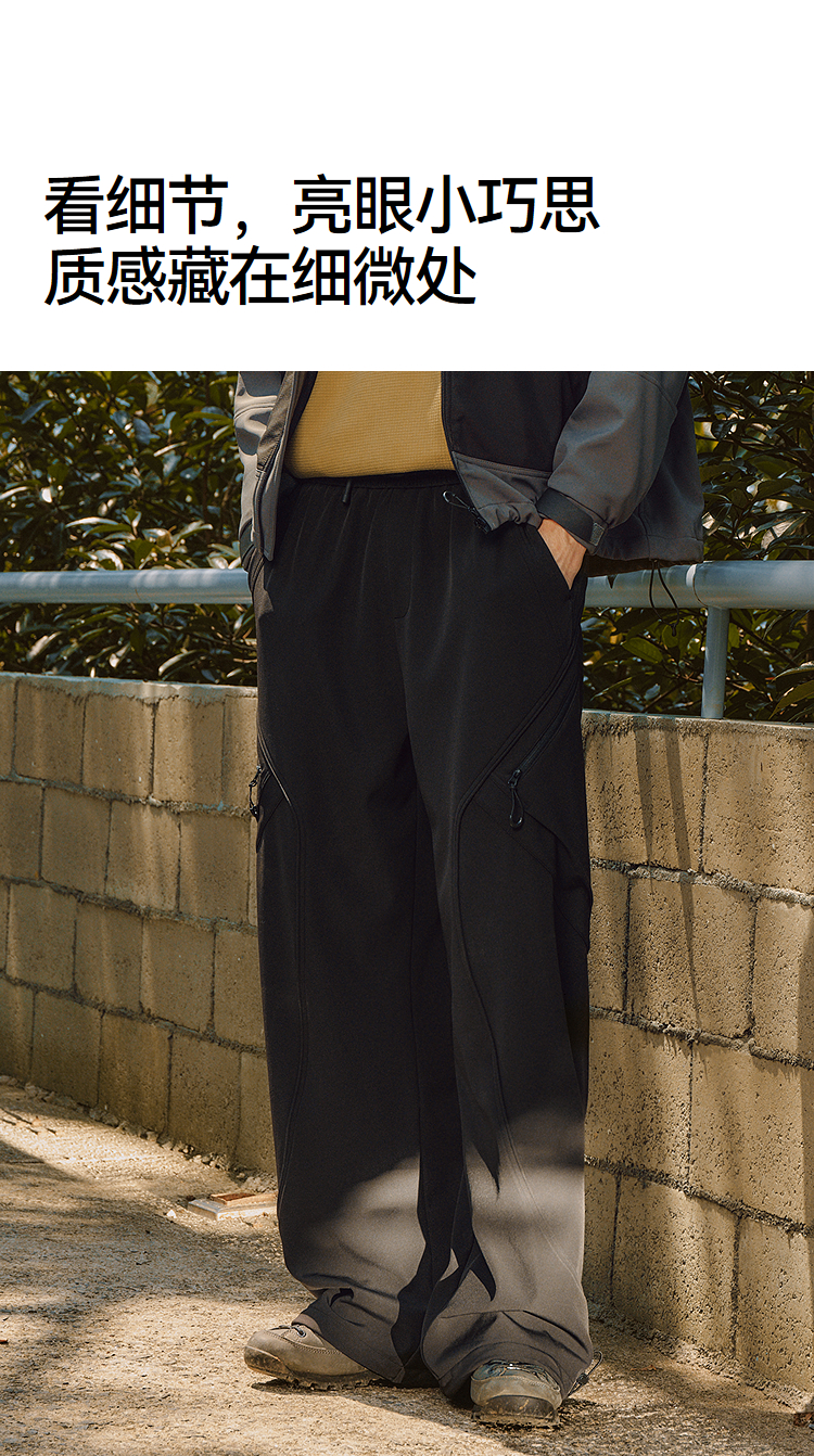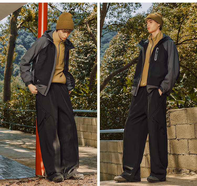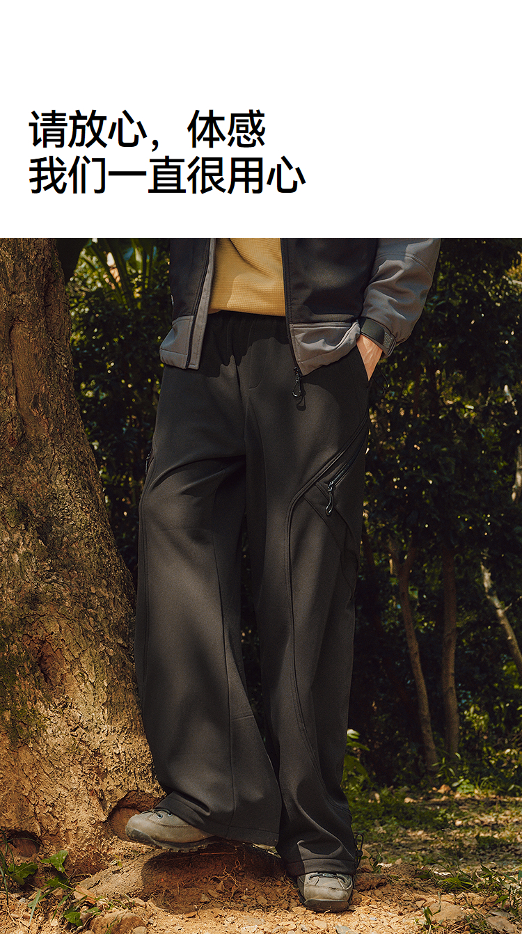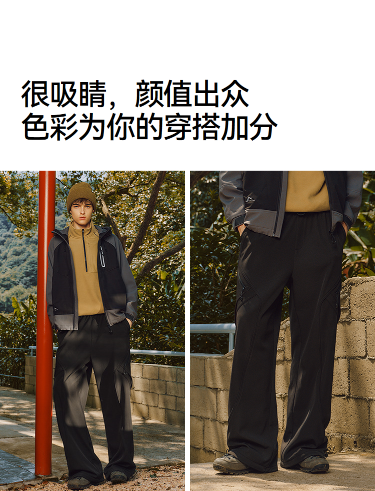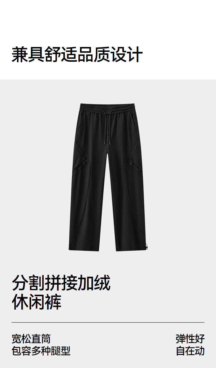 森马休闲裤男冬季加绒宽松直筒裤2025新款拼接时尚户外长裤子黑色