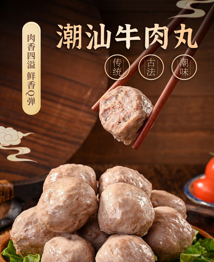 4.市场、口感优势:汕头老字号生产企业,品质跟味道具有明显优势,遵循优质食材本味,让您的家人吃上健康美味的潮汕牛肉丸。