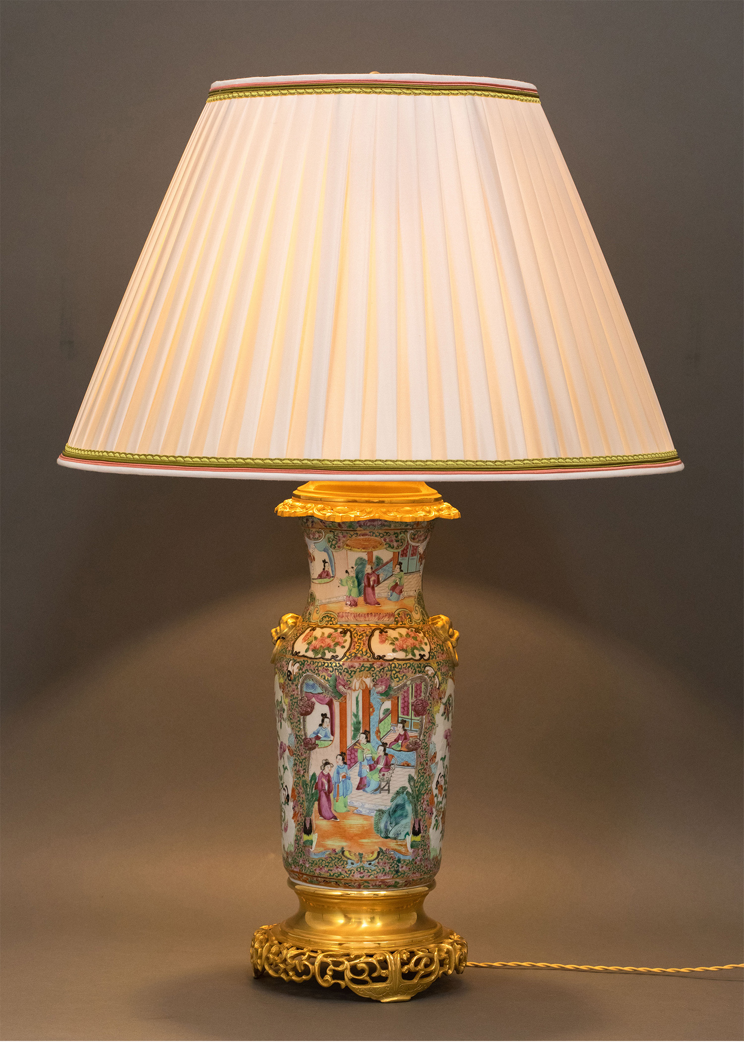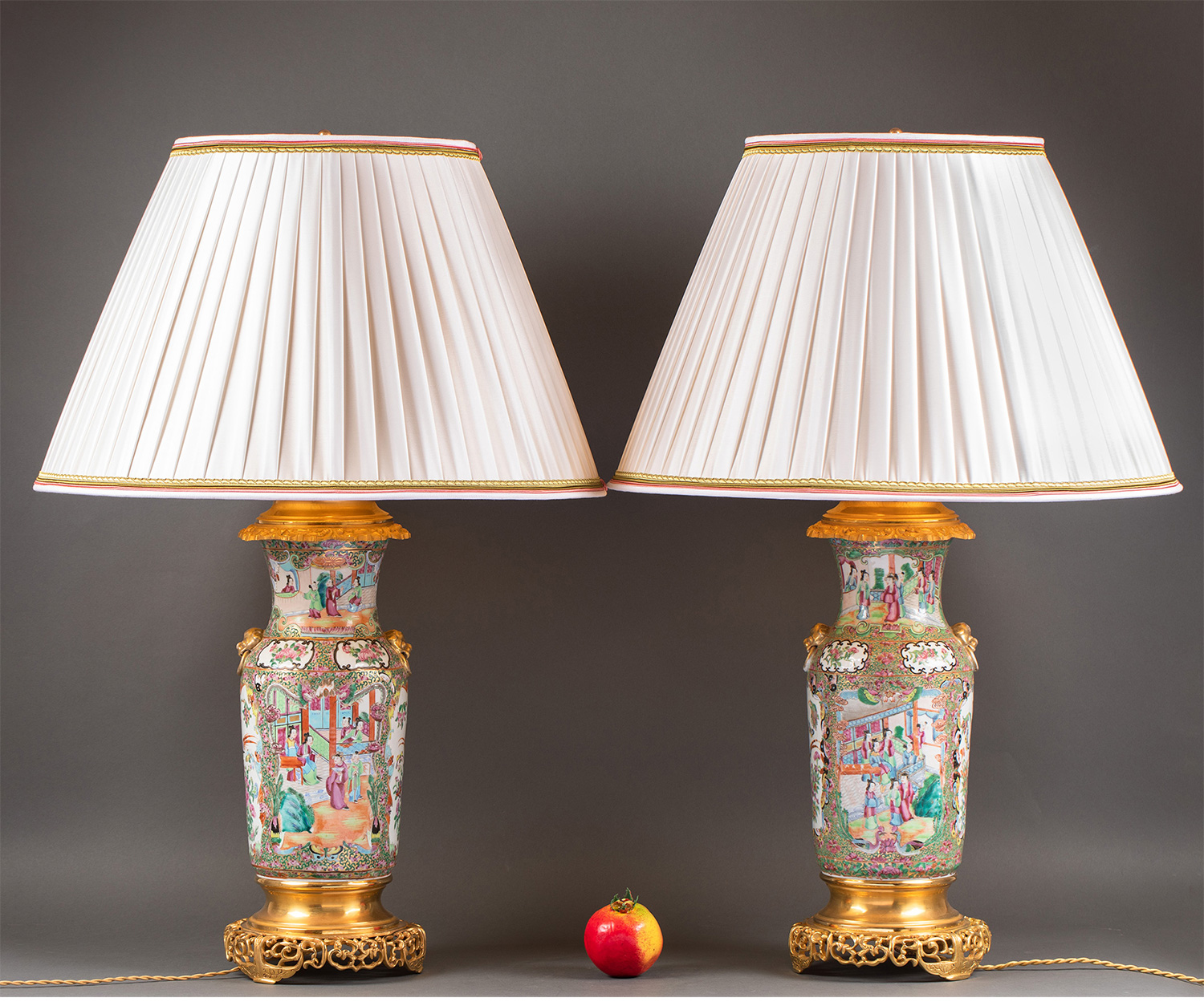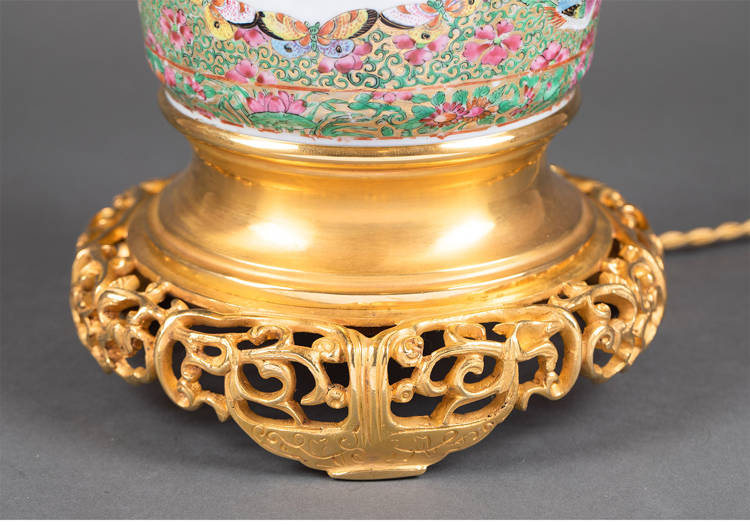 19世纪法国出品铜鎏金底座嵌花蝶开窗庭院人物广彩瓷瓶百褶灯罩台灯一对
