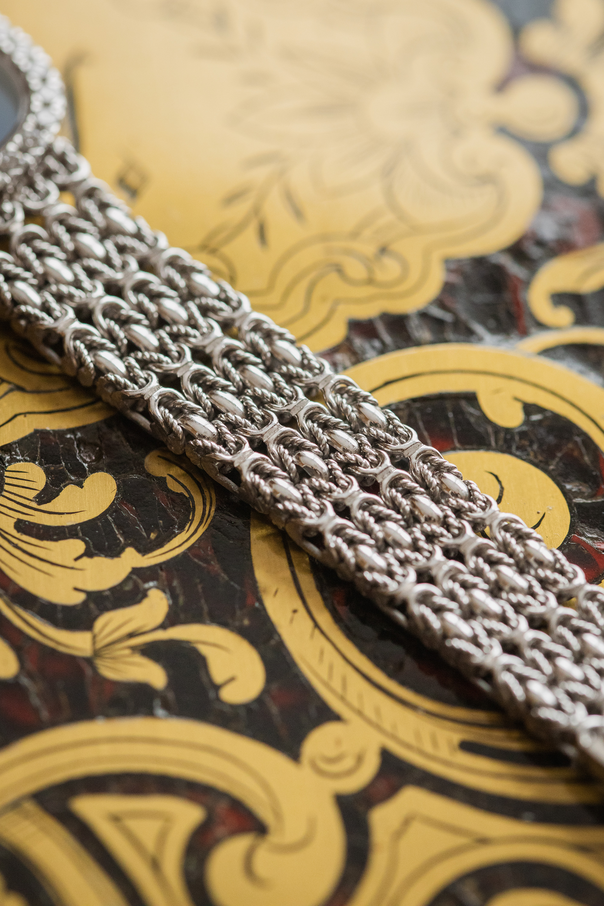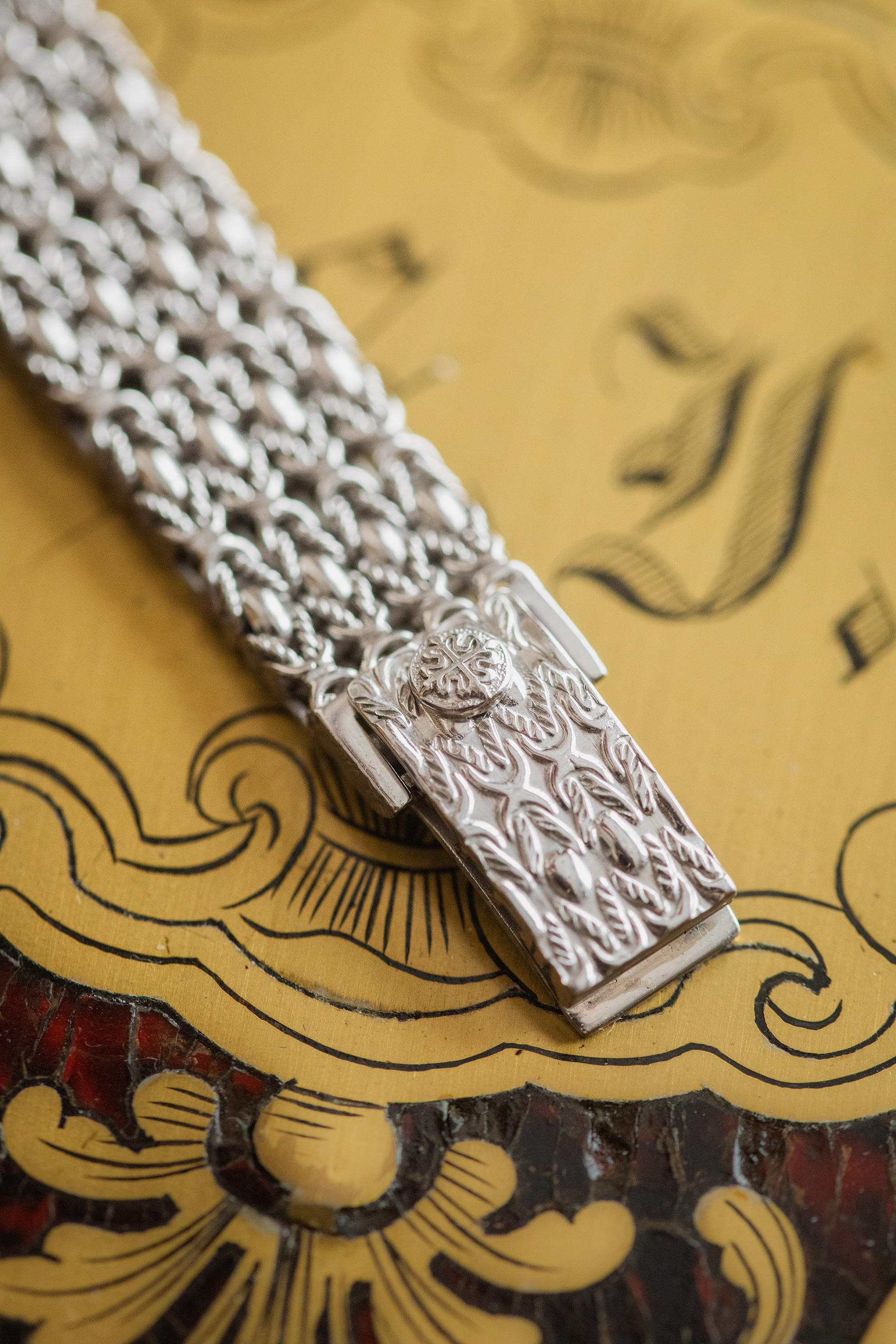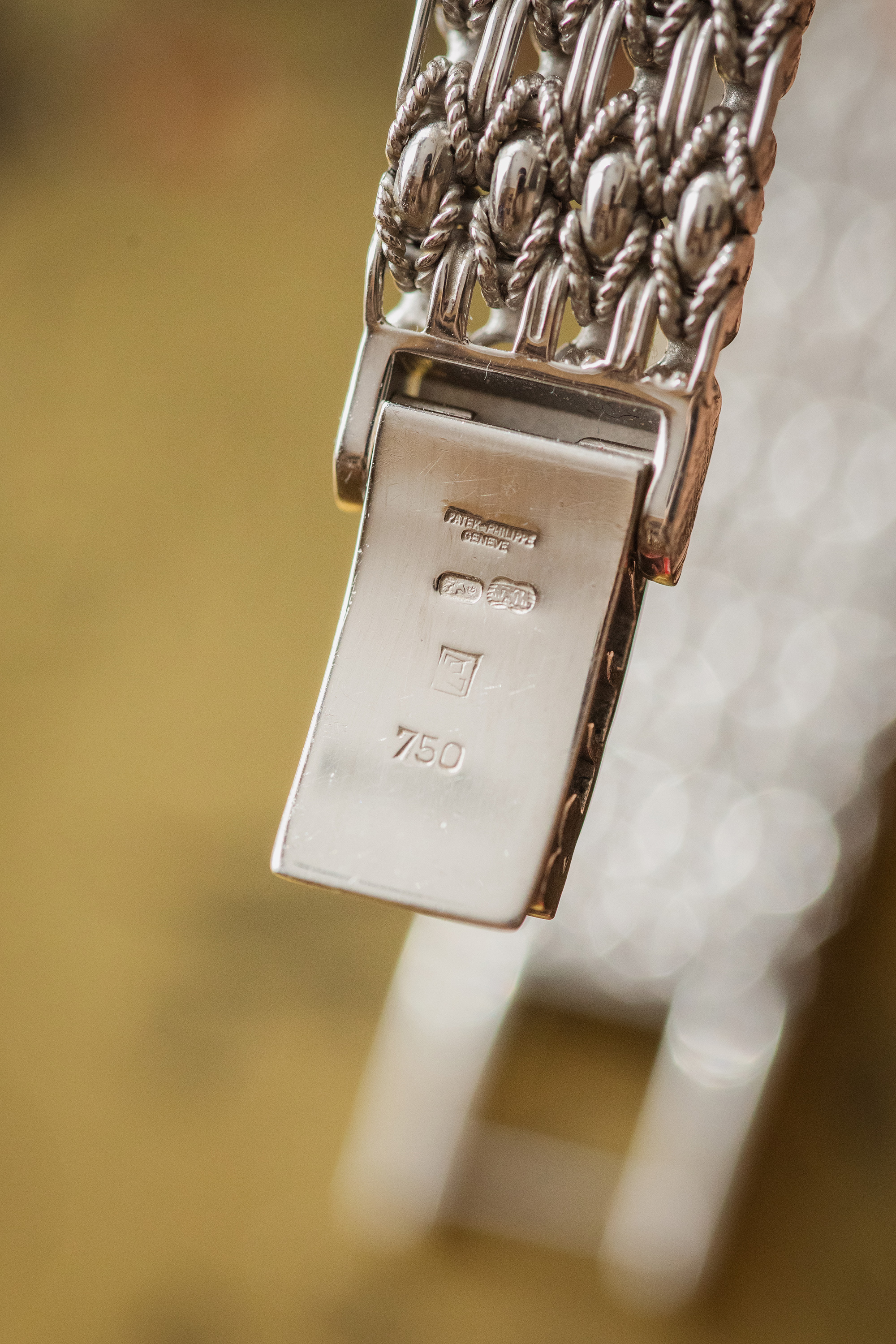 独角鹿西洋古董1970年代瑞士顶级钟表世家百达翡丽Patek Philippe出品18K白金编织表带蓝色日辉纹石英镶嵌钻石表盘女士腕表