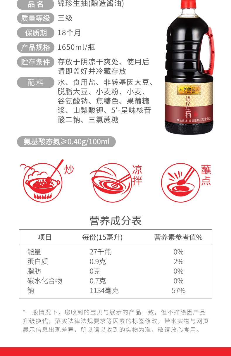 李锦记 酱油 锦珍生抽 味鲜凉拌蘸点 1.65L